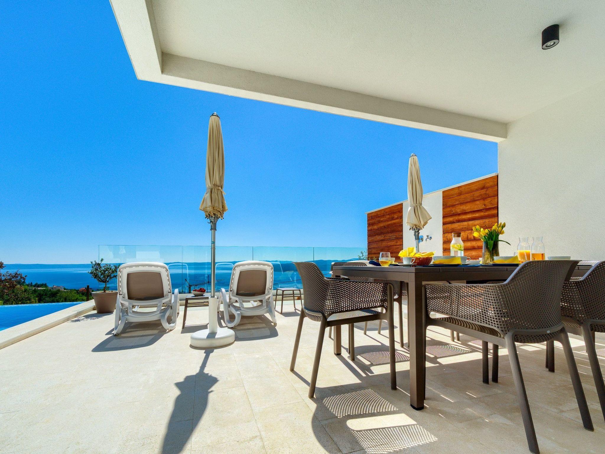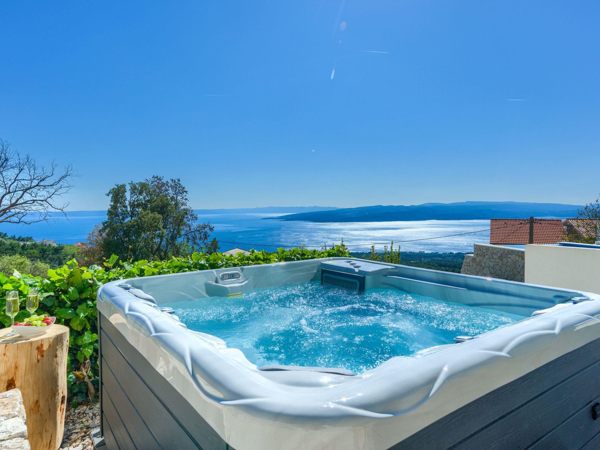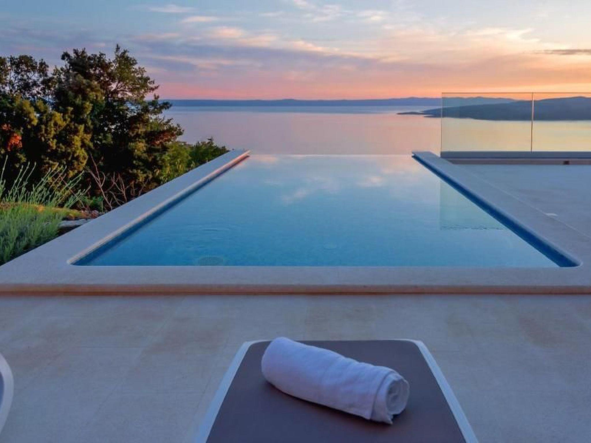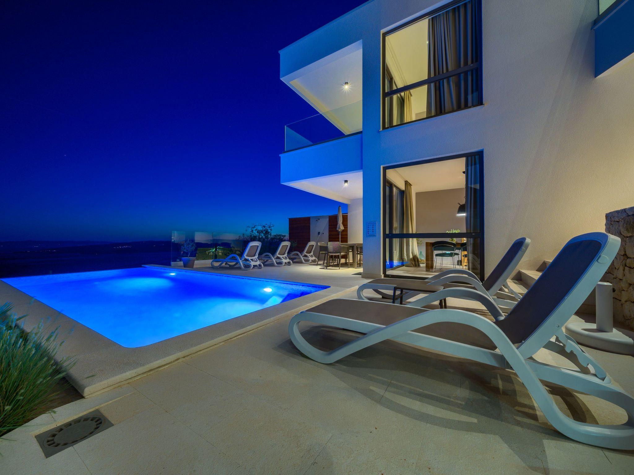 Der Außenbereich lässt keine Wünsche offen: Eine Hauptterrasse mit beheiztem Infinity-Pool, Sonnenliegen, Sonnenschirmen, Außendusche und einem Esstisch für acht Personen bietet den perfekten Rahmen, um in die wahre mediterrane Atmosphäre einzutauchen. Genießen Sie die atemberaubenden Sonnenuntergänge im Jacuzzi oder entspannen Sie in der Sauna, während Sie die spektakuläre Aussicht auf die Inseln Brac und Hvar bewundern.
