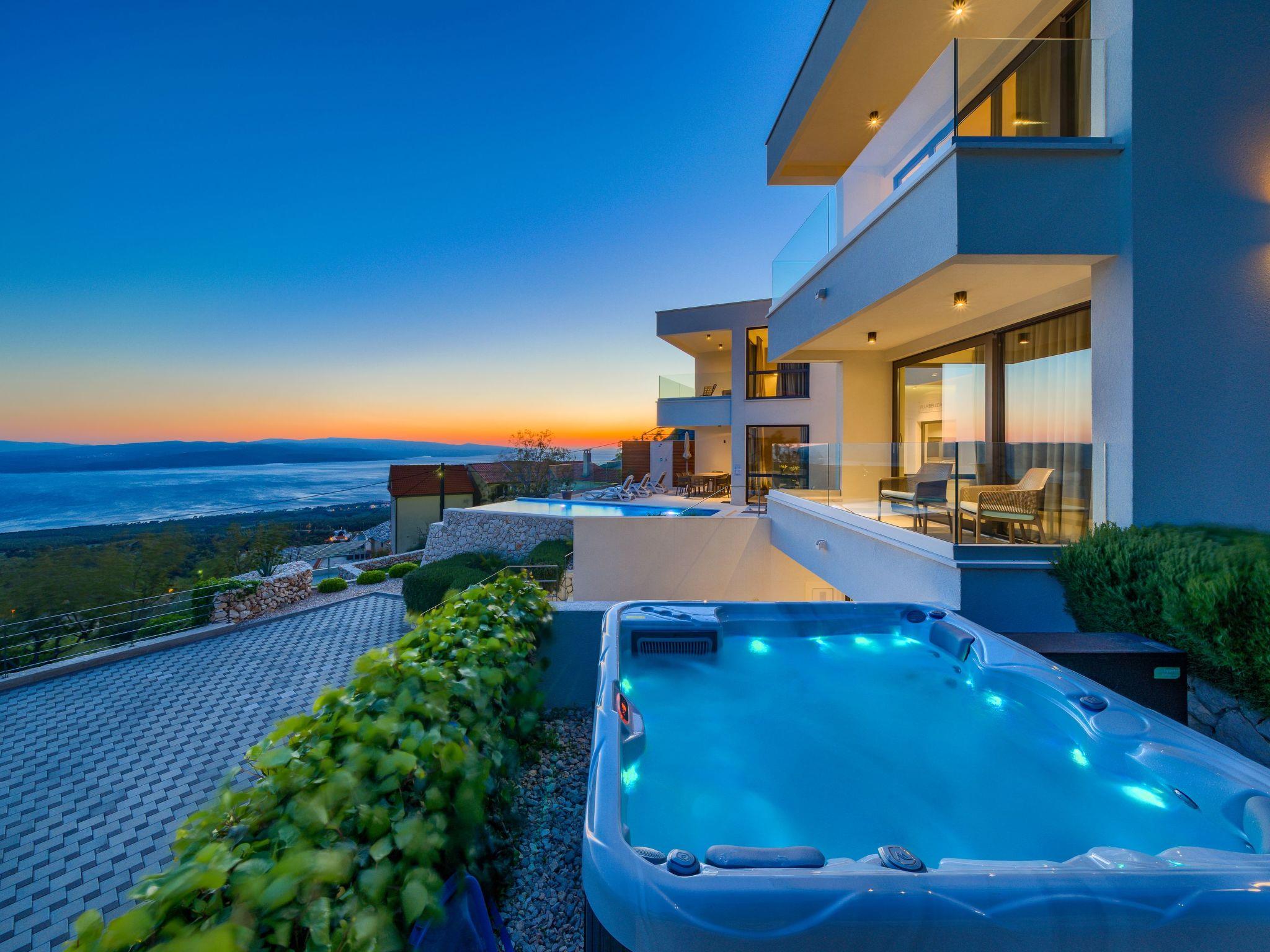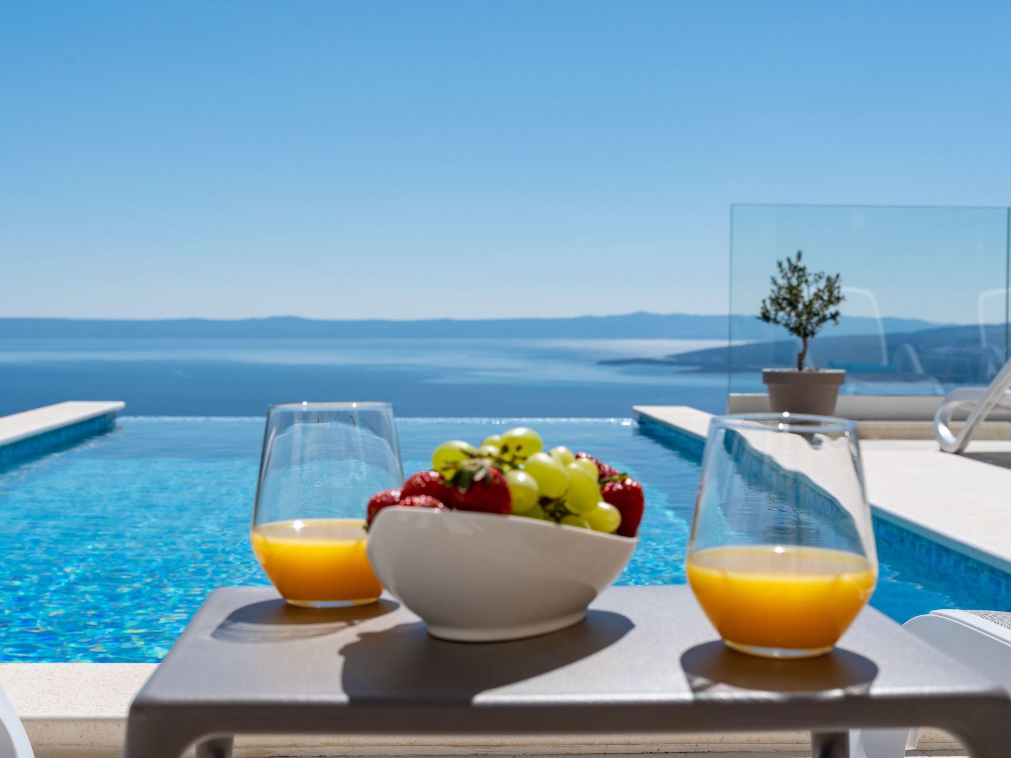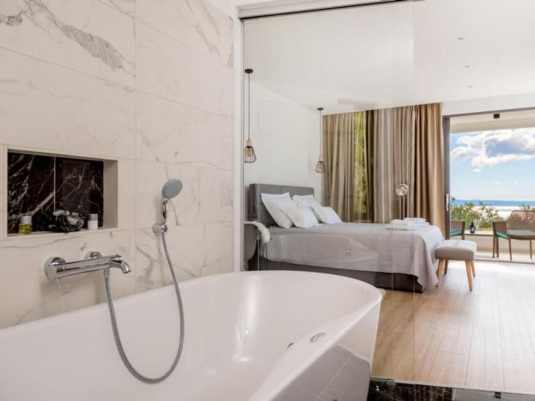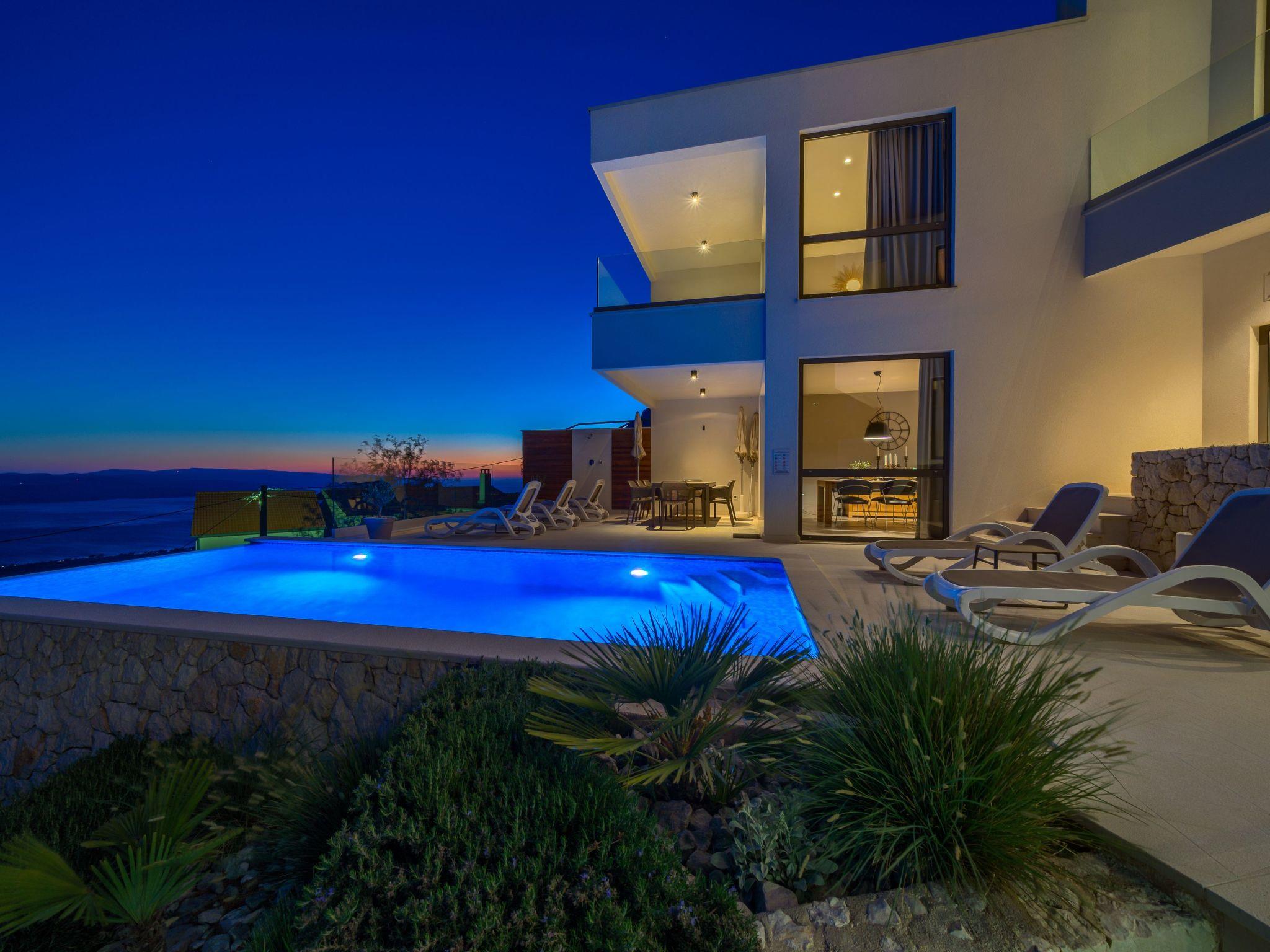 Der Außenbereich lässt keine Wünsche offen: Eine Hauptterrasse mit beheiztem Infinity-Pool, Sonnenliegen, Sonnenschirmen, Außendusche und einem Esstisch für acht Personen bietet den perfekten Rahmen, um in die wahre mediterrane Atmosphäre einzutauchen. Genießen Sie die atemberaubenden Sonnenuntergänge im Jacuzzi oder entspannen Sie in der Sauna, während Sie die spektakuläre Aussicht auf die Inseln Brac und Hvar bewundern.
