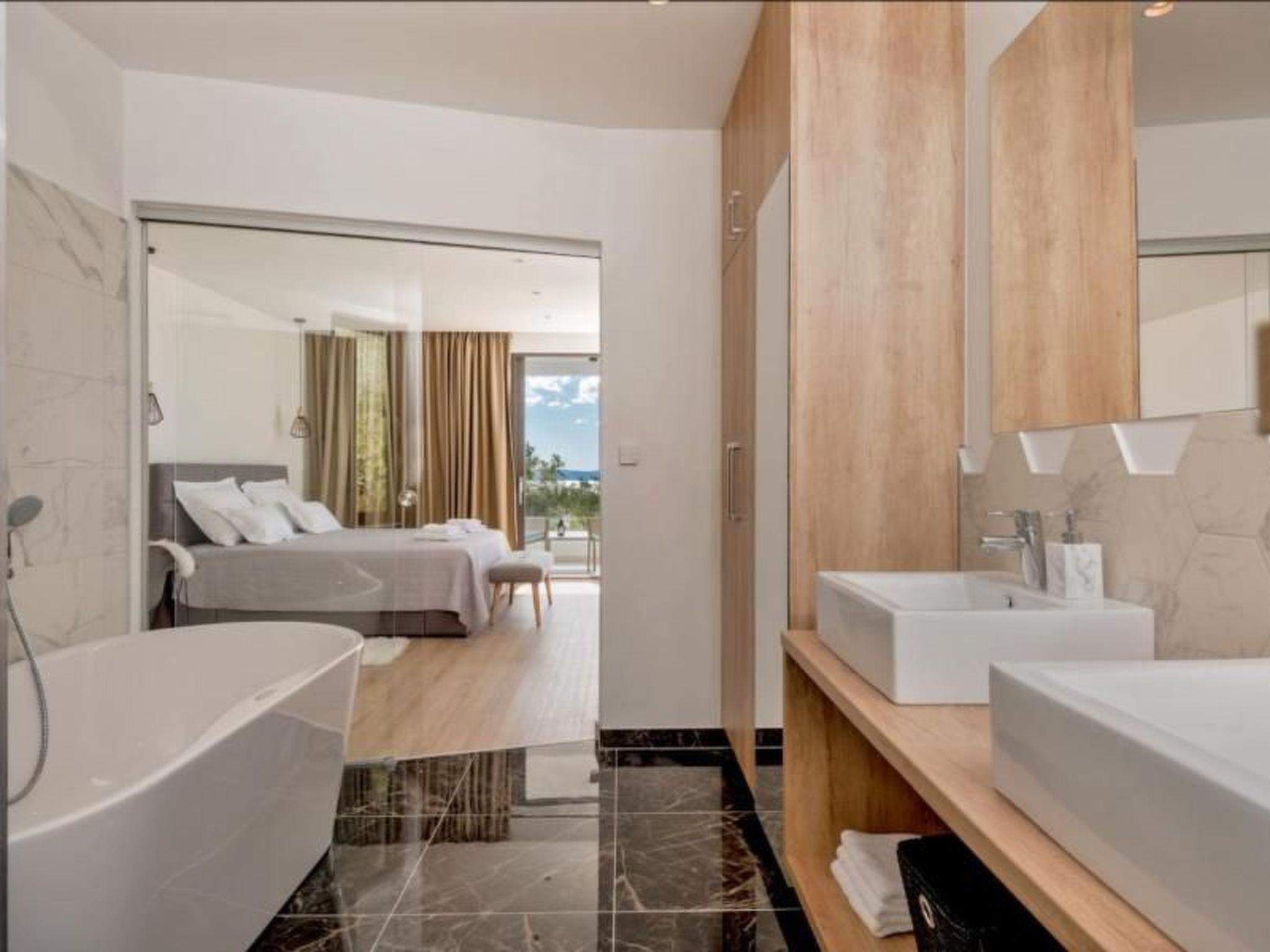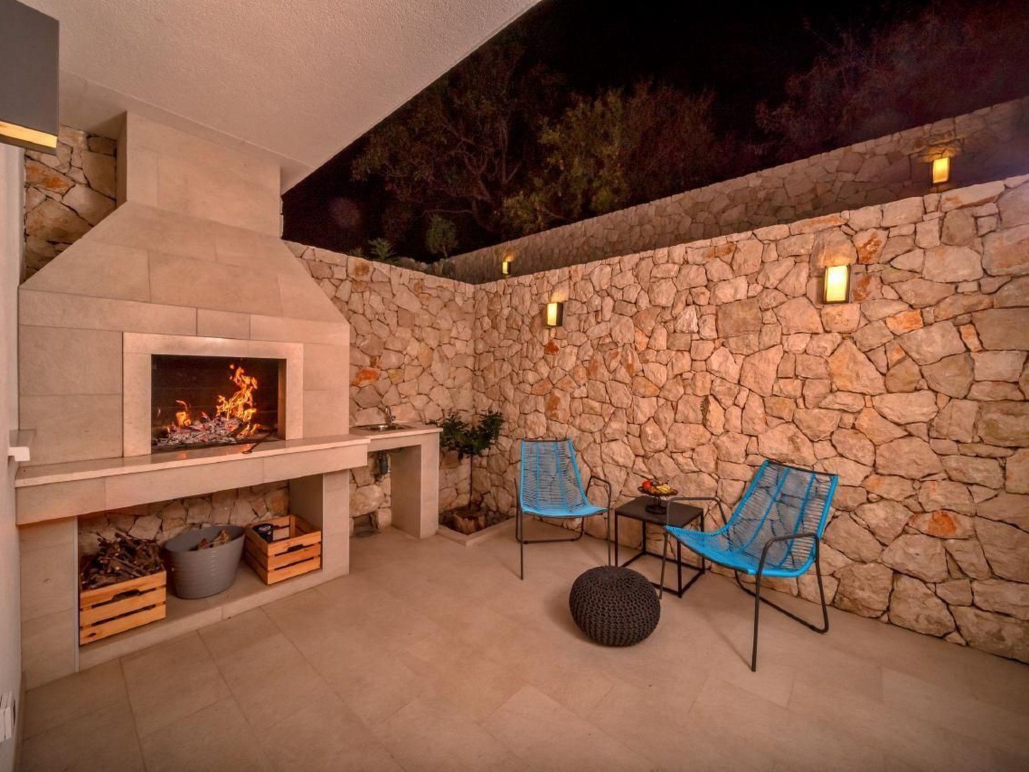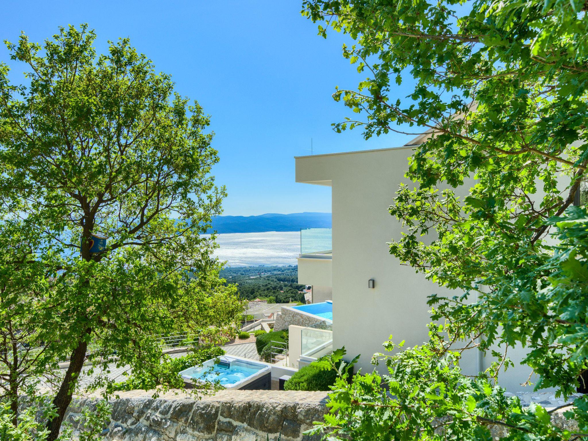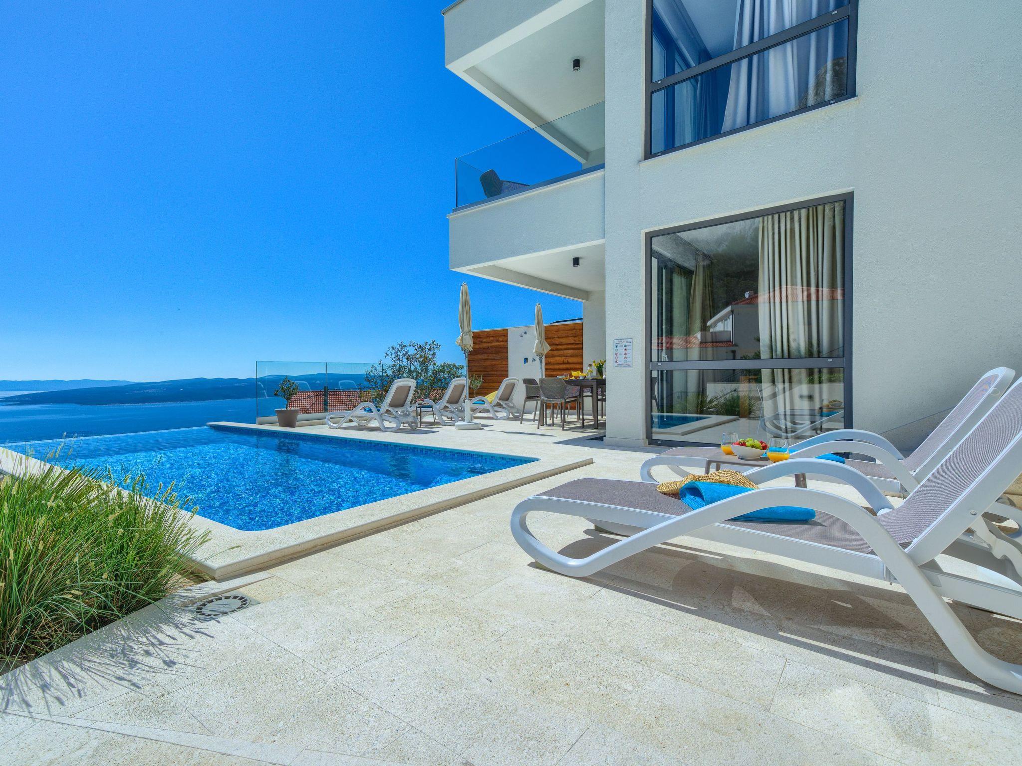 Der Außenbereich lässt keine Wünsche offen: Eine Hauptterrasse mit beheiztem Infinity-Pool, Sonnenliegen, Sonnenschirmen, Außendusche und einem Esstisch für acht Personen bietet den perfekten Rahmen, um in die wahre mediterrane Atmosphäre einzutauchen. Genießen Sie die atemberaubenden Sonnenuntergänge im Jacuzzi oder entspannen Sie in der Sauna, während Sie die spektakuläre Aussicht auf die Inseln Brac und Hvar bewundern.