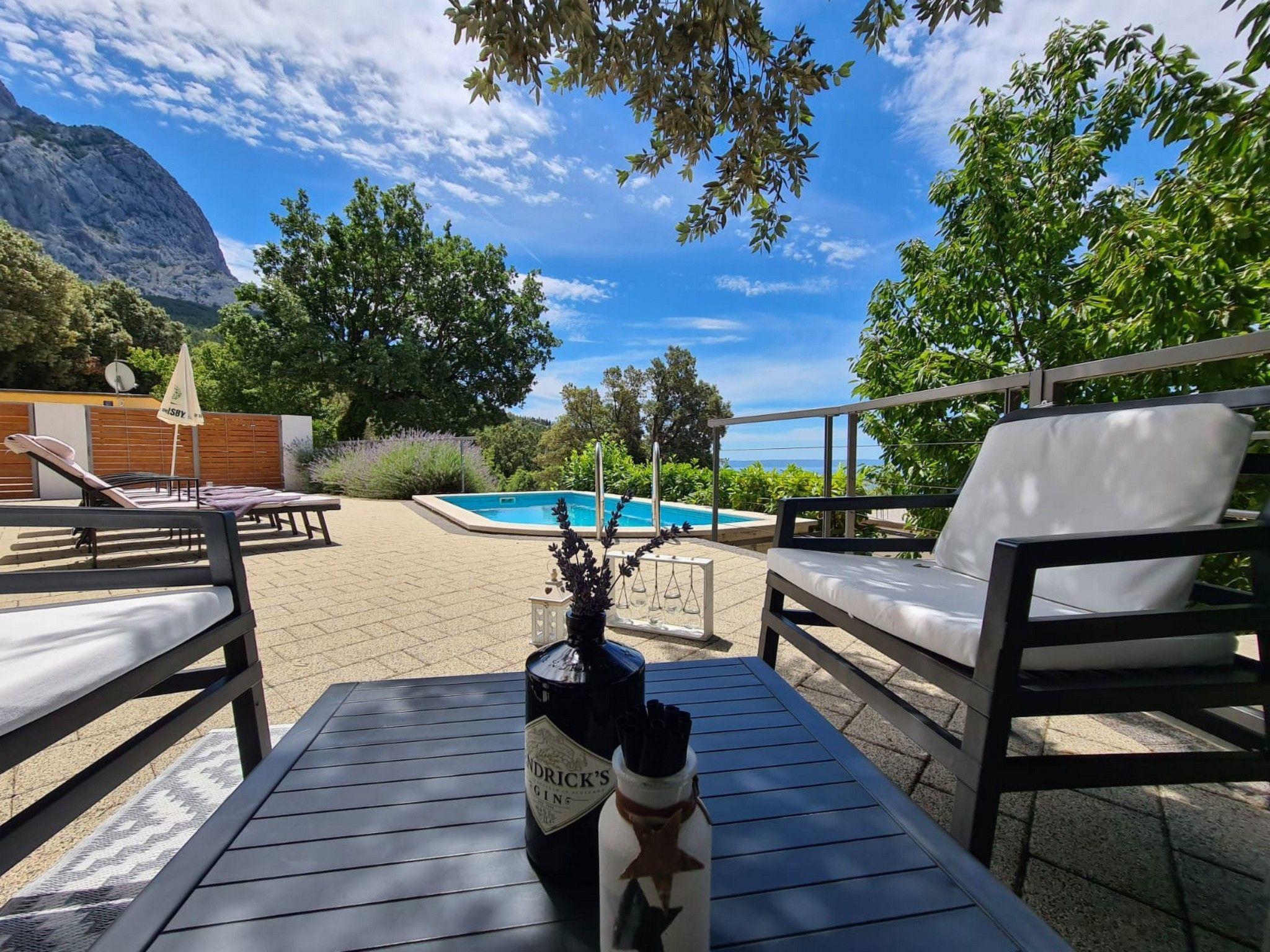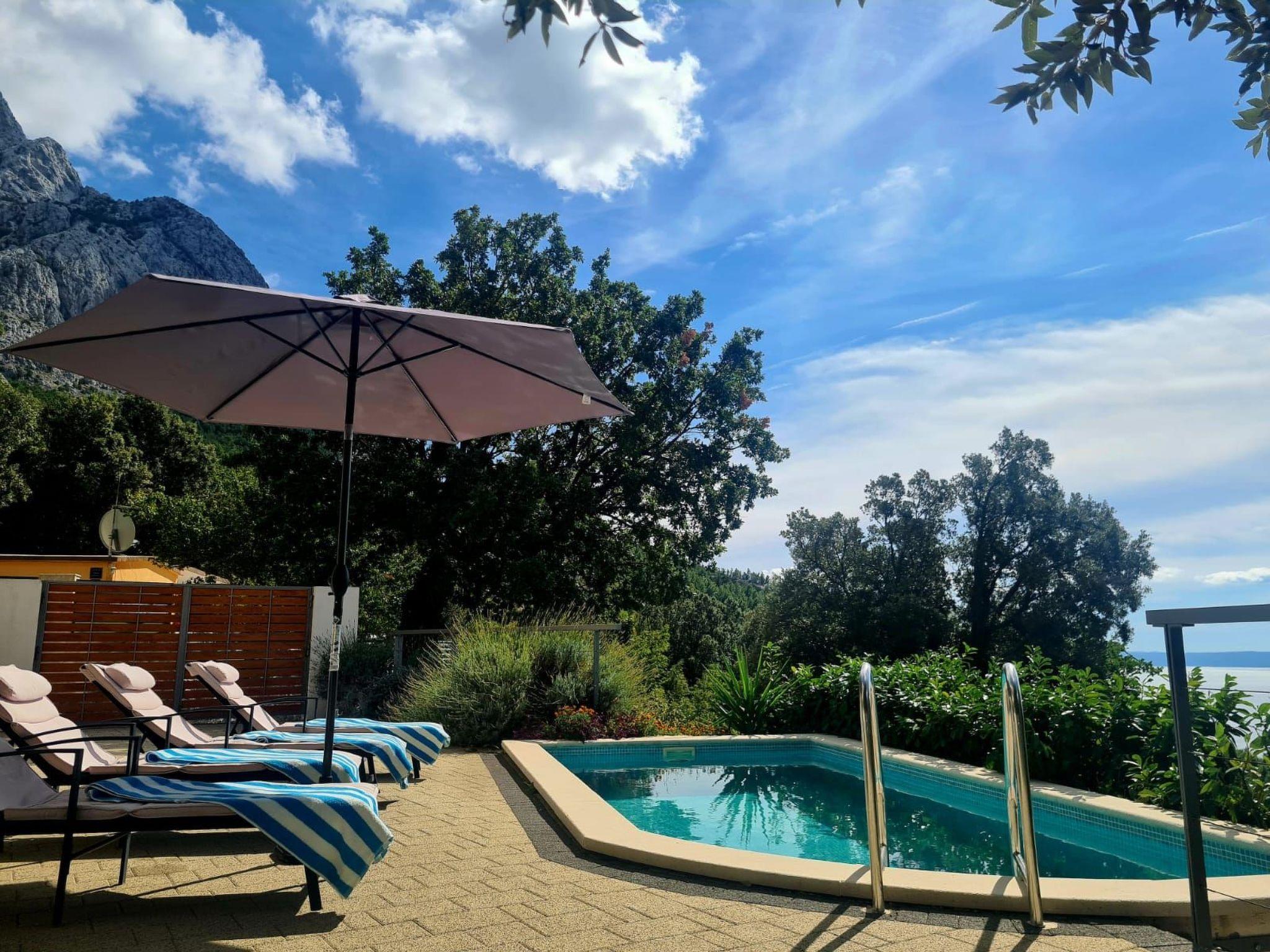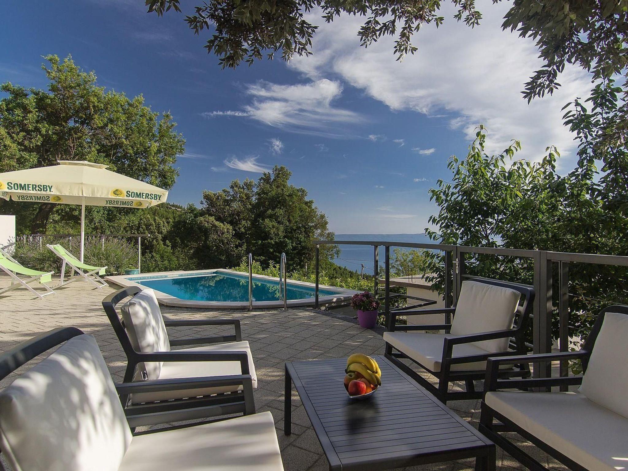 Das Highlight des Außenbereichs ist zweifellos der private Pool, von dem aus Sie einen herrlichen Blick auf das Meer genießen können. Die Terrasse mit Sonnenliegen und Außendusche lädt zum Entspannen und Sonnenbaden ein, während eine weitere Terrasse mit Grillplatz und Gartenmöbeln der perfekte Ort für gemeinsame Mahlzeiten im Freien ist. Der großzügige Garten, der zur alleinigen Nutzung bestimmt ist, bietet ausreichend Raum für Kinder zum Spielen und für Ihre Haustiere, die hier ebenfalls herzlich willkommen sind.