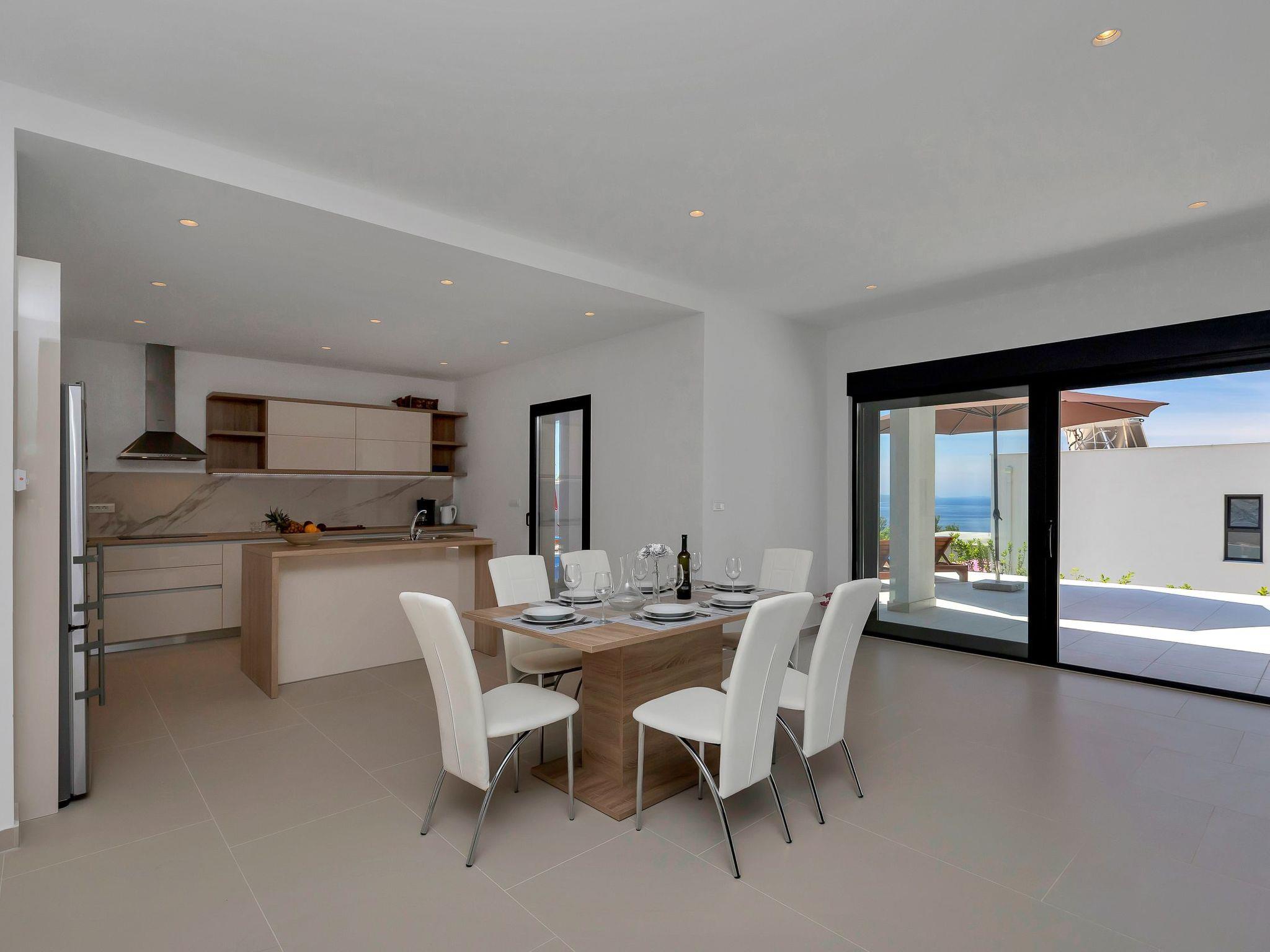 Im Obergeschoss befinden sich drei stilvolle Doppelbett-Schlafzimmer, die jeweils mit einem eigenen Badezimmer, Klimaanlage und SAT-TV ausgestattet sind. Die Terrasse bietet einen traumhaften Meerblick, ist teilweise überdacht und mit Gartenmöbeln sowie einem Sonnenschirm ausgestattet – ideal, um die Sonne und den Ausblick zu genießen.