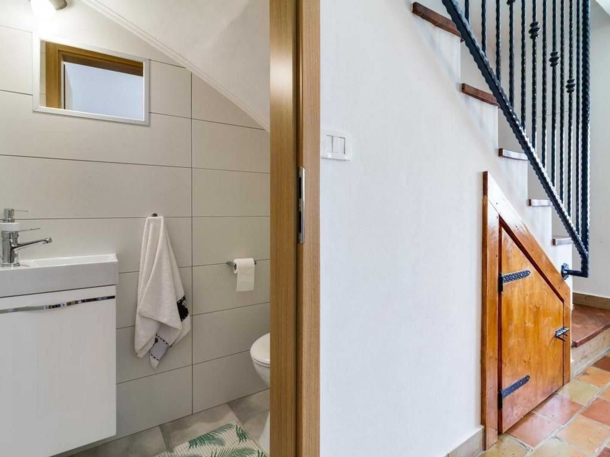 Im Inneren ist die Villa komplett ausgestattet, um einen unvergesslichen Urlaub zu garantieren. Im Erdgeschoss befindet sich eine komplett ausgestattete Küche, ein gemütlicher Essbereich mit Tisch und Stühlen und ein einladender Wohnbereich mit einem Sofa, das auch als zusätzliches Bett für eine Person genutzt werden kann. Ein praktisches halbes Bad ergänzt das Angebot des Erdgeschosses. Im ersten Stock erwarten die Gäste zwei gut ausgestattete Schlafzimmer und ein komplettes Badezimmer mit Dusche und Waschmaschine, so dass man sich wie zu Hause fühlt.