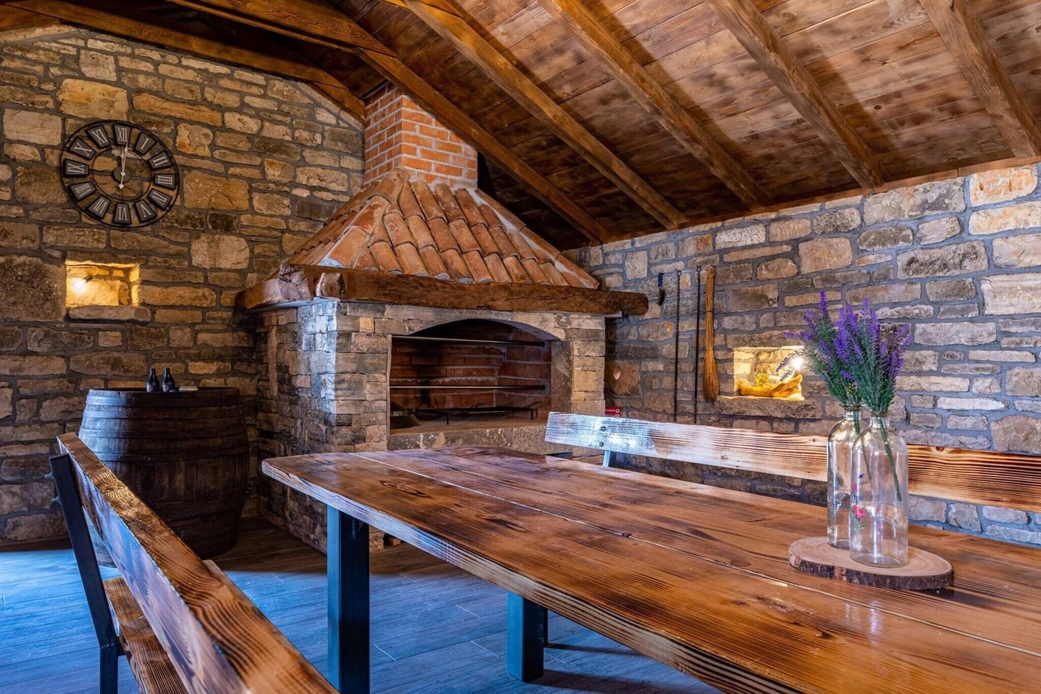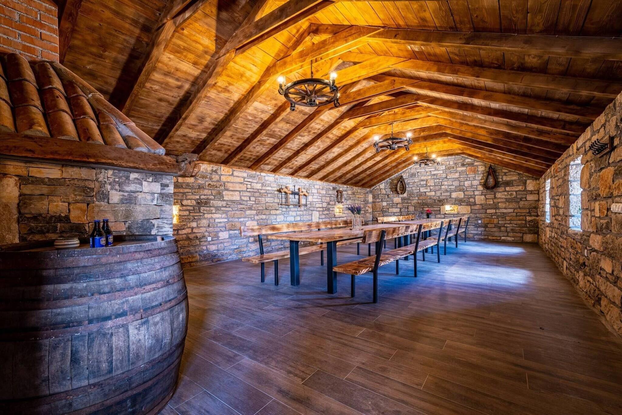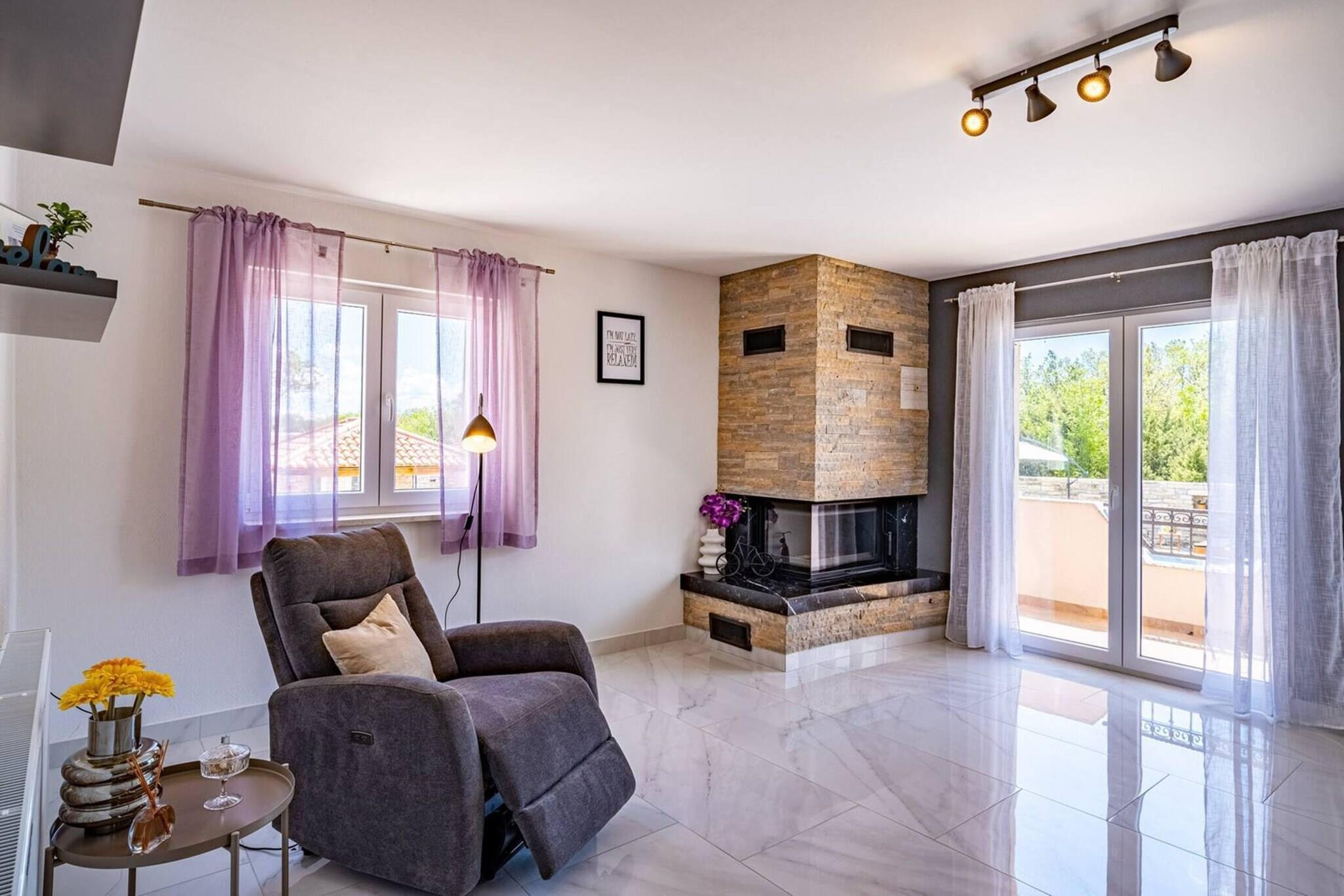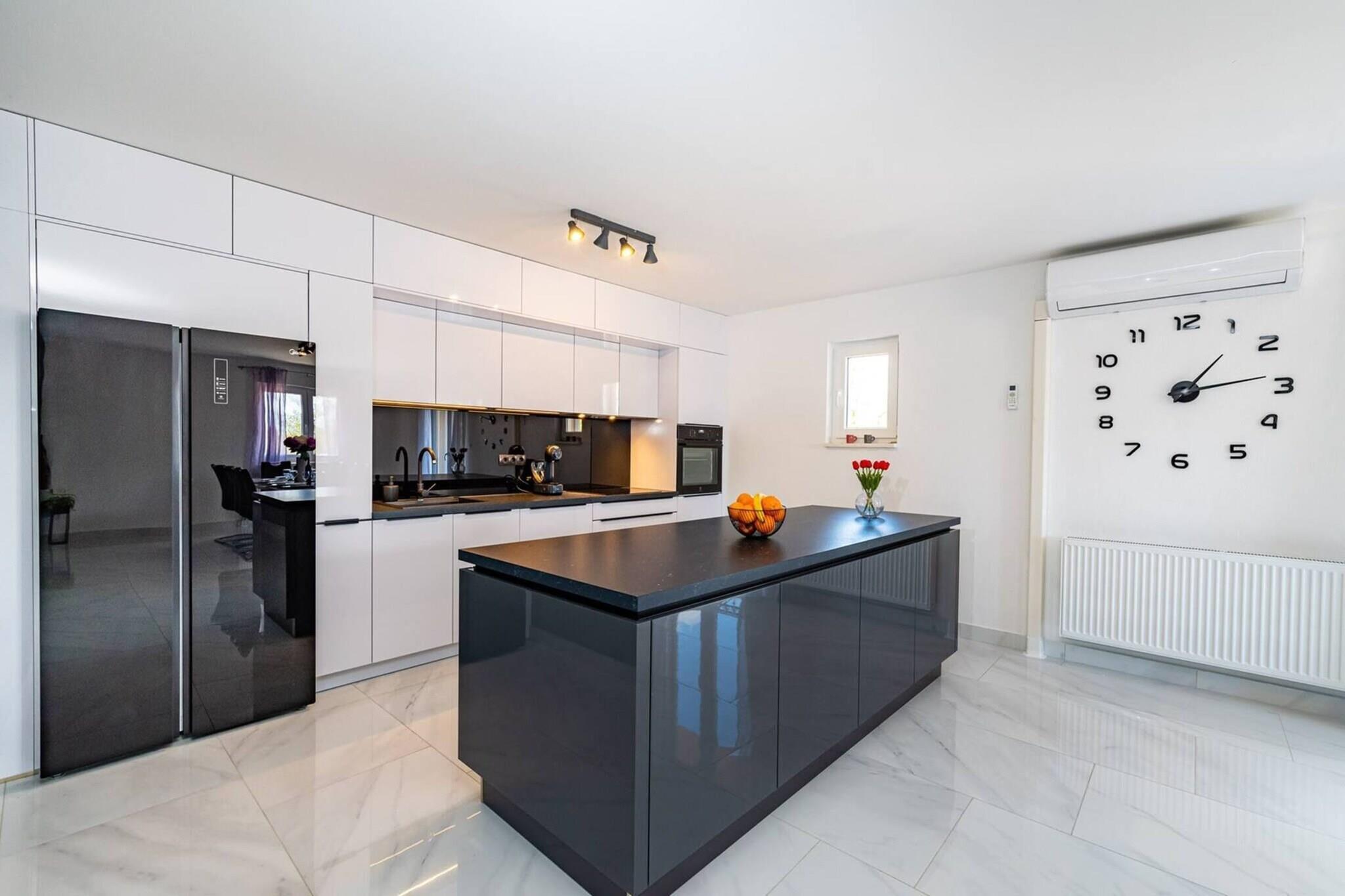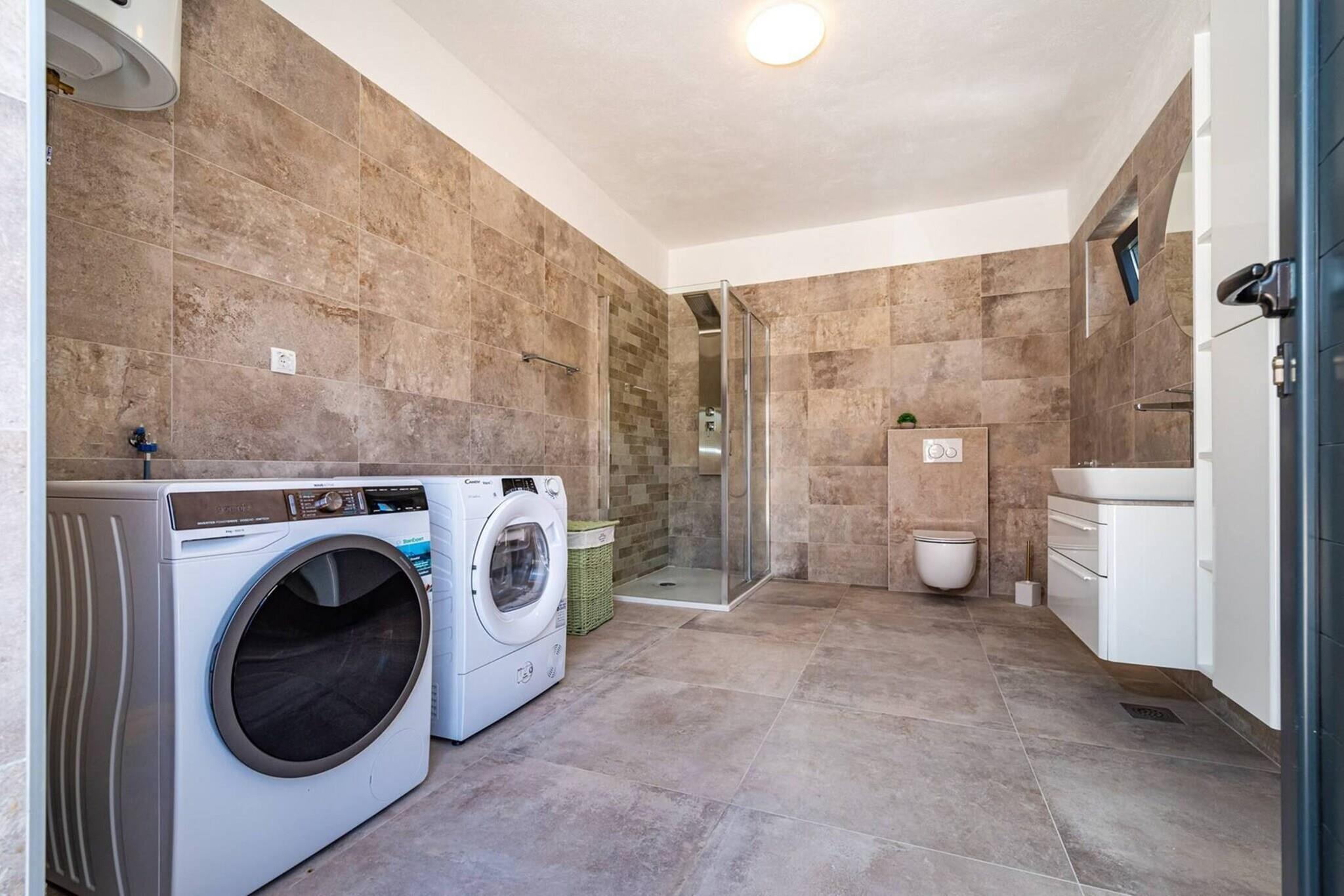 Versteckt in der friedlichen Landschaft in der Nähe von Benkovac bietet diese herausragende Villa die perfekte Mischung aus lokalem Charme, Privatsphäre und modernem Komfort. Umgeben von Olivenbäumen und offenen Feldern ist sie ein Paradies für Familien und Freunde, die Entspannung, Platz und einen Eindruck vom authentischen dalmatinischen Leben suchen. Die mit Sorgfalt und Liebe zum Detail gestaltete Villa verfügt über vier stilvolle, klimatisierte Schlafzimmer, drei elegante Badezimmer und einen geräumigen offenen Wohn- und Essbereich, der zum Entspannen einlädt. Die voll ausgestattete Küche macht es leicht, gemeinsam hausgemachte Mahlzeiten zu genießen, während die hellen Innenräume und warmen Farbtöne eine einladende, heimelige Atmosphäre schaffen. Im Erdgeschoss erwartet Sie ein unterhaltsames Spielzimmer mit Billardtisch, Tischfußball und Darts, ideal für Abende mit freundschaftlichen Wettkämpfen. Treten Sie nach draußen und Sie finden Ihr eigenes privates Paradies. Der große 60 m² große Swimmingpool mit Hydromassagedüsen ist ideal, um sich an warmen Tagen abzukühlen, während die überdachte Terrasse perfekt für lange, gemütliche Mahlzeiten unter der Sonne ist. Eine voll ausgestattete Taverne im Freien mit Küche, Grill und Essbereich macht jeden Abend zu etwas Besonderem. Kinder werden den Spielplatz mit Schaukeln, Rutsche, Trampolin und sogar einer kleinen Eselfarm in der Nähe lieben. Fitnessbegeisterte können sich im hauseigenen Fitnessstudio fit halten, während alle anderen die Ruhe der umliegenden Landschaft genießen. Die Lage der Villa bietet das Beste aus beiden Welten: Ruhe und dennoch leichten Zugang zu Abenteuern. In nur 15 Autominuten erreichen Sie die Sandstrände von Pakostane und den ruhigen Naturpark Vrana-See. Der spektakuläre Nationalpark Krka mit seinen berühmten Wasserfällen ist nur eine halbe Stunde entfernt, während die historische Stadt Zadar mit ihrem Reichtum an Kultur und Charme leicht zu erreichen ist.