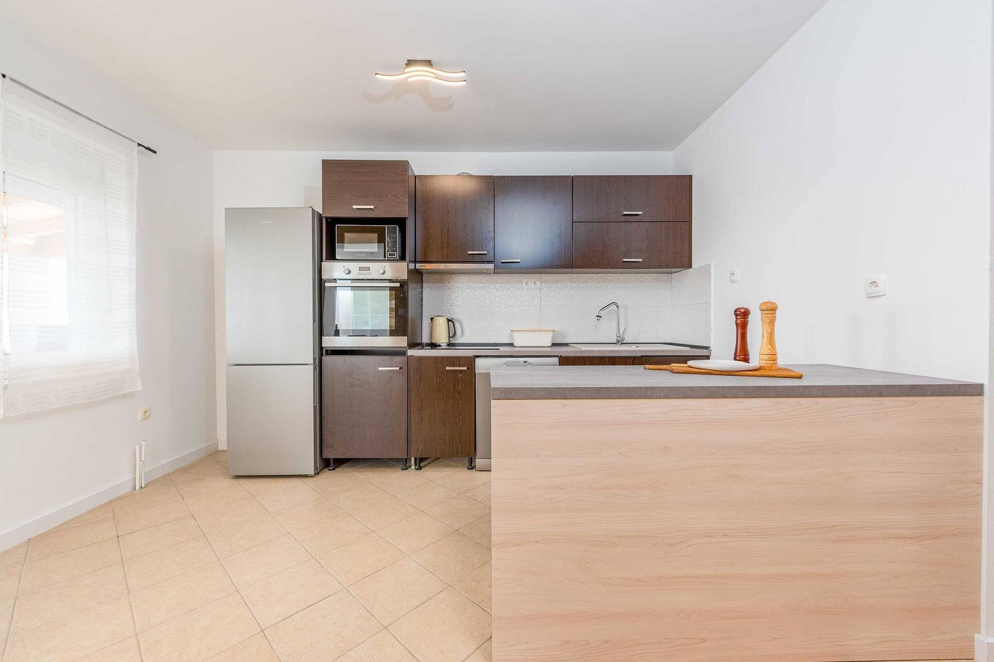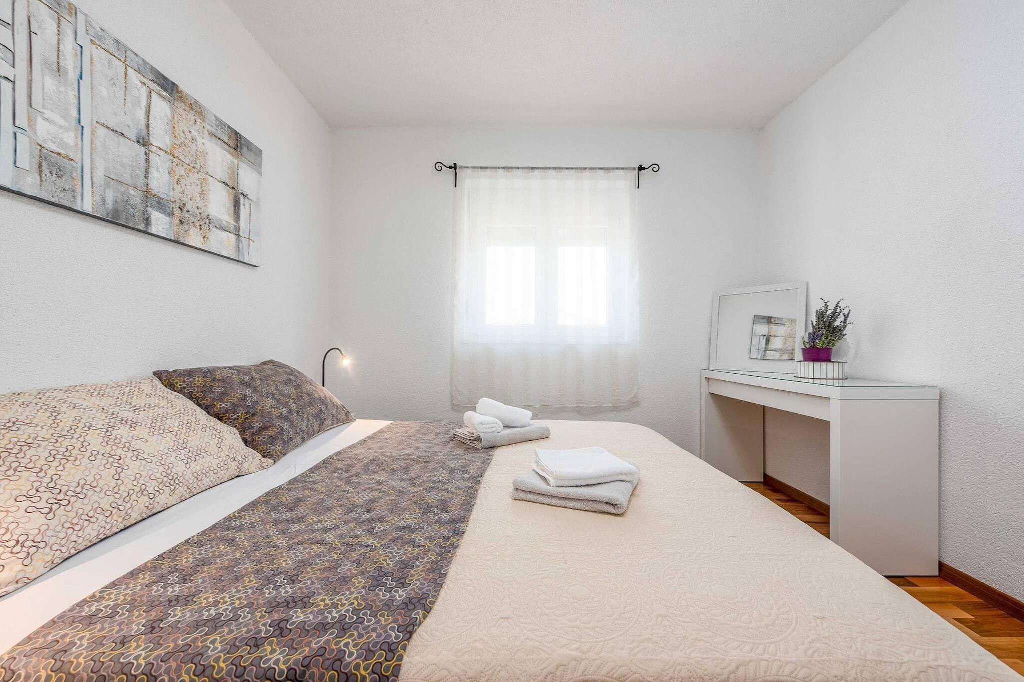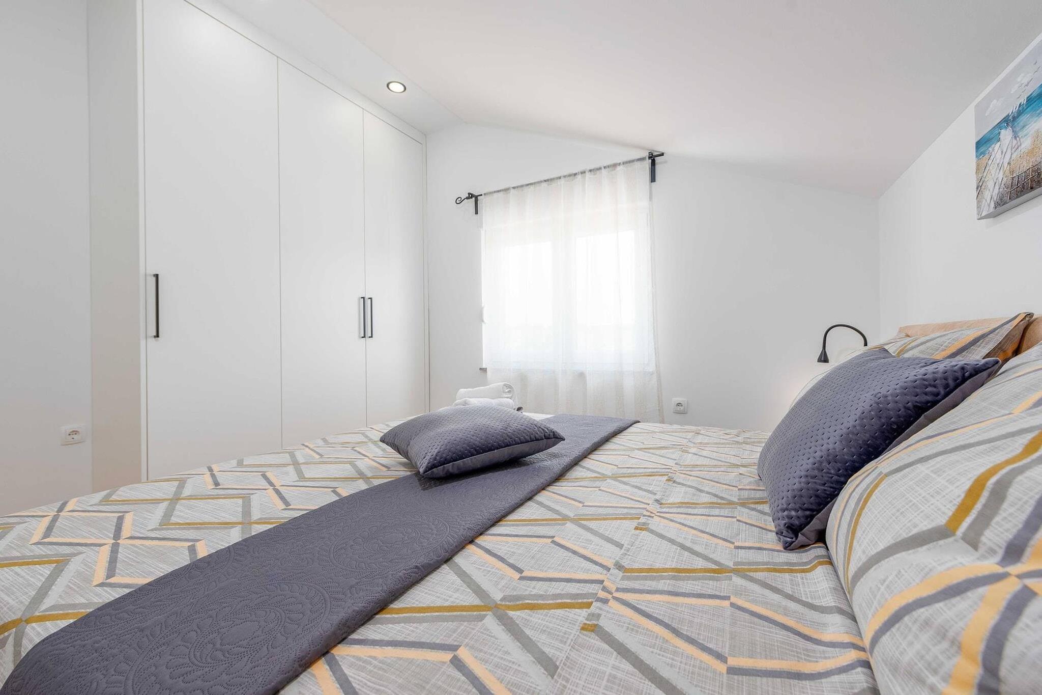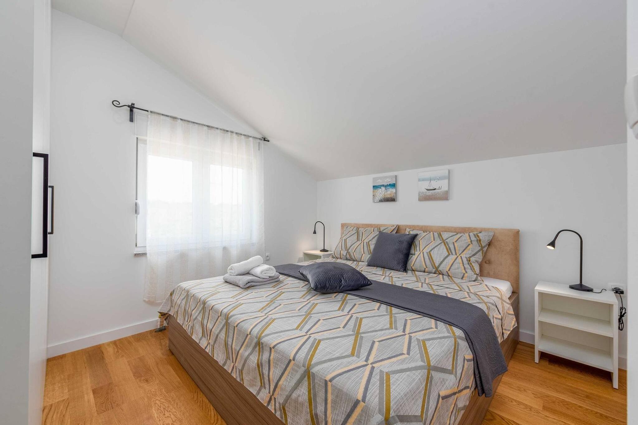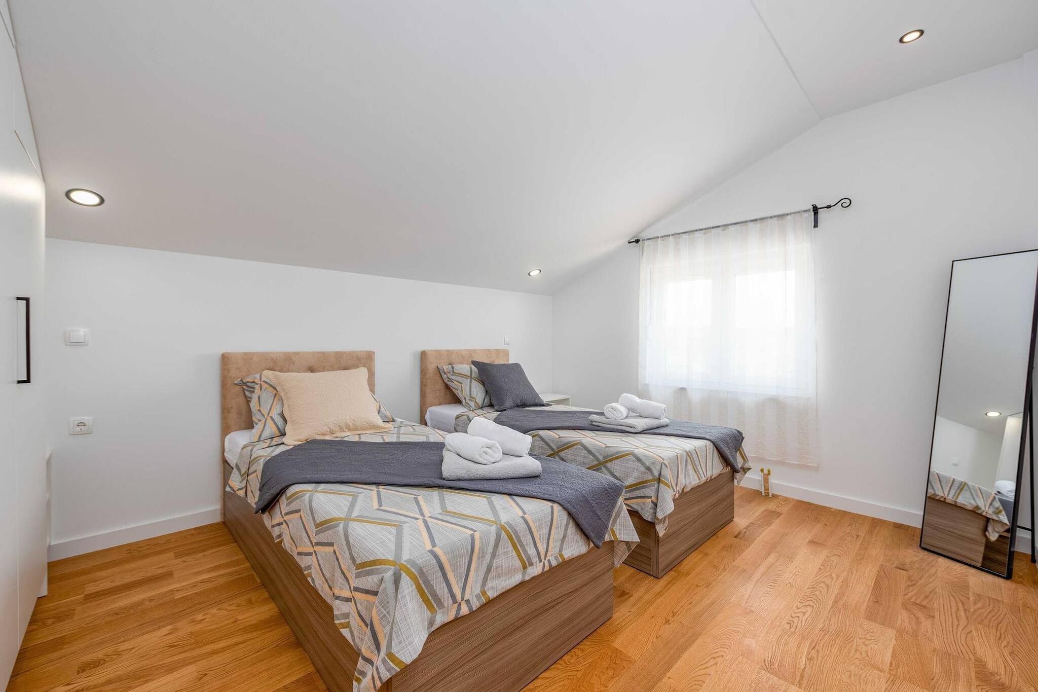 Lokaler Charme, tolle Aussichten und viel komfortablen Platz. Diese wundervolle neu gebaute Villa befindet sich in der Nähe von Benkovac, im Hinterland von Zadar, genannt Ravni Kotari. Diese Region ist bekannt für ihre hochwertigen Weine, Steinproduktion und Landwirtschaft. Mit einem fantastischen privaten Swimmingpool, Sauna und Jacuzzi kann sie bequem eine Gruppe von bis zu 10 Personen aufnehmen. Zadar mit seiner berühmten Altstadt ist in nur 35 Minuten Fahrtzeit erreichbar und der nächstgelegene Strand in Karin ist nur 10 km entfernt. Während eines Besuchs von My Dalmatia waren wir von den atemberaubenden Ausblicken beeindruckt, die dieses Ferienhaus bietet. Das Innere der Villa Pezer besteht aus 2 erstaunlichen, voll ausgestatteten Apartments (zusammen als eine Einheit vermietet). Insgesamt gibt es 4 liebevolle Schlafzimmer, 3 moderne Badezimmer, 2 geräumige Wohn-/Essbereiche, 2 Küchen und 2 überdachte Terrassen mit spektakulären Ausblicken auf die umgebende Natur. Jede Terrasse verfügt über eigene Grillmöglichkeiten und einen Esstisch, ideal zum Genießen Ihrer Mahlzeiten im Freien. Die Wohnzimmer sind beide mit einem Doppelschlafsofa ausgestattet, wodurch die Villa Pezer eine perfekte Unterkunft für 2 Familien oder eine Gruppe von bis zu 10 verantwortungsvollen Erwachsenen ist. Draußen finden Sie in Ihrem charmanten eingezäunten Garten Ihren privaten beheizten Swimmingpool, Sonnenliegen, eine Outdoor-Dusche und reichlich privaten, eingezäunten Parkraum. Der nächste Lebensmittelladen befindet sich 800 Meter entfernt, während Restaurants, große Supermärkte, ein Wochenmarkt mit frischem Gemüse in Benkovac, 2-3 km entfernt, zu finden sind. Der Zugang zur nahe gelegenen Autobahn macht dieses Gebiet gut erschlossen. Sowohl Zadar als auch Šibenik können in einer halben Stunde Fahrtzeit besucht werden, ebenso wie Biograd, ein bekanntes Touristenziel an der Küste. Dies macht die Villa Pezer zu einer idealen Basis, von der aus Sie den Rest dieser wunderbaren Region erkunden können.