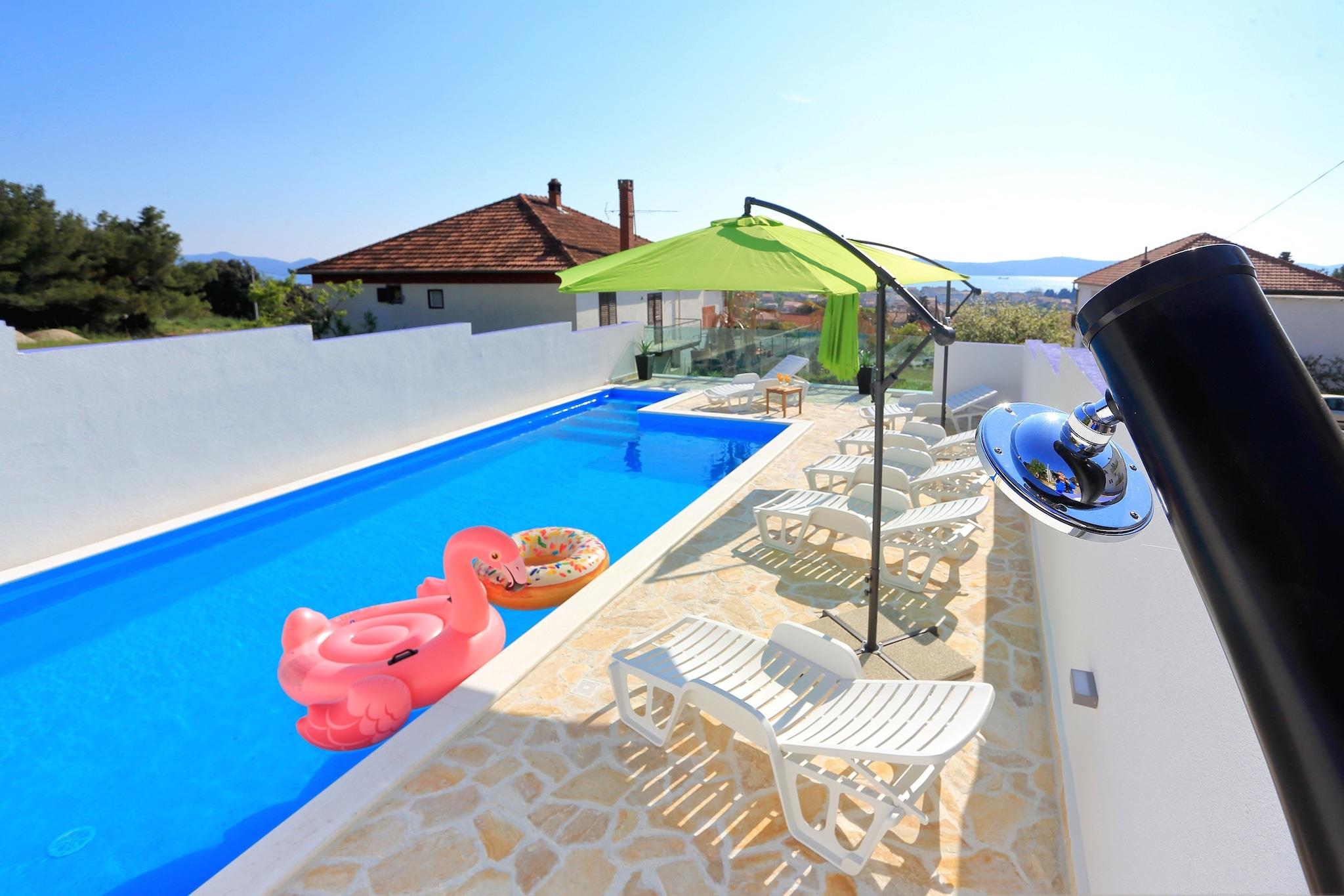 In der 1. Etage: (offene Küche(Wasserkocher, Kochherd(4 Kochplatten, Induktion), Backofen, Kühlschrank, Tiefkühlschrank), Wohn/Esszimmer(Doppelschlafcouch, TV(Flatscreen, Satellit, internationale TV-Kanäle), Esstisch(6 Personen), Klimaanlage), Schlafzimmer(Doppelbett), Schlafzimmer(Doppelbett), Schlafzimmer(Doppelbett), Badezimmer(Dusche, Waschbecken, Toilette)) Liegen, Grill, Parkplatz, Pool(alleinige Nutzung, umzäunt, 9 x 4 m.)