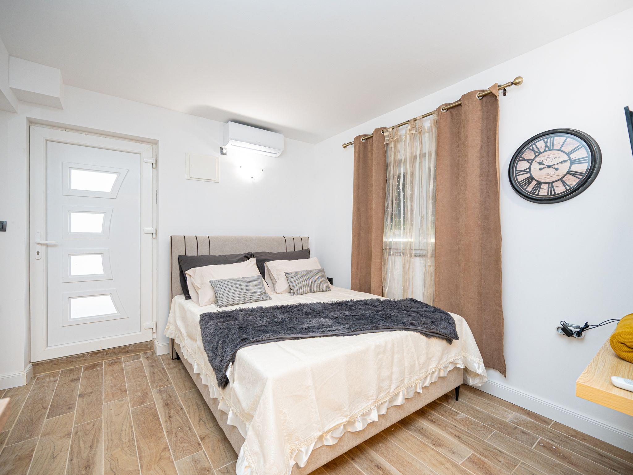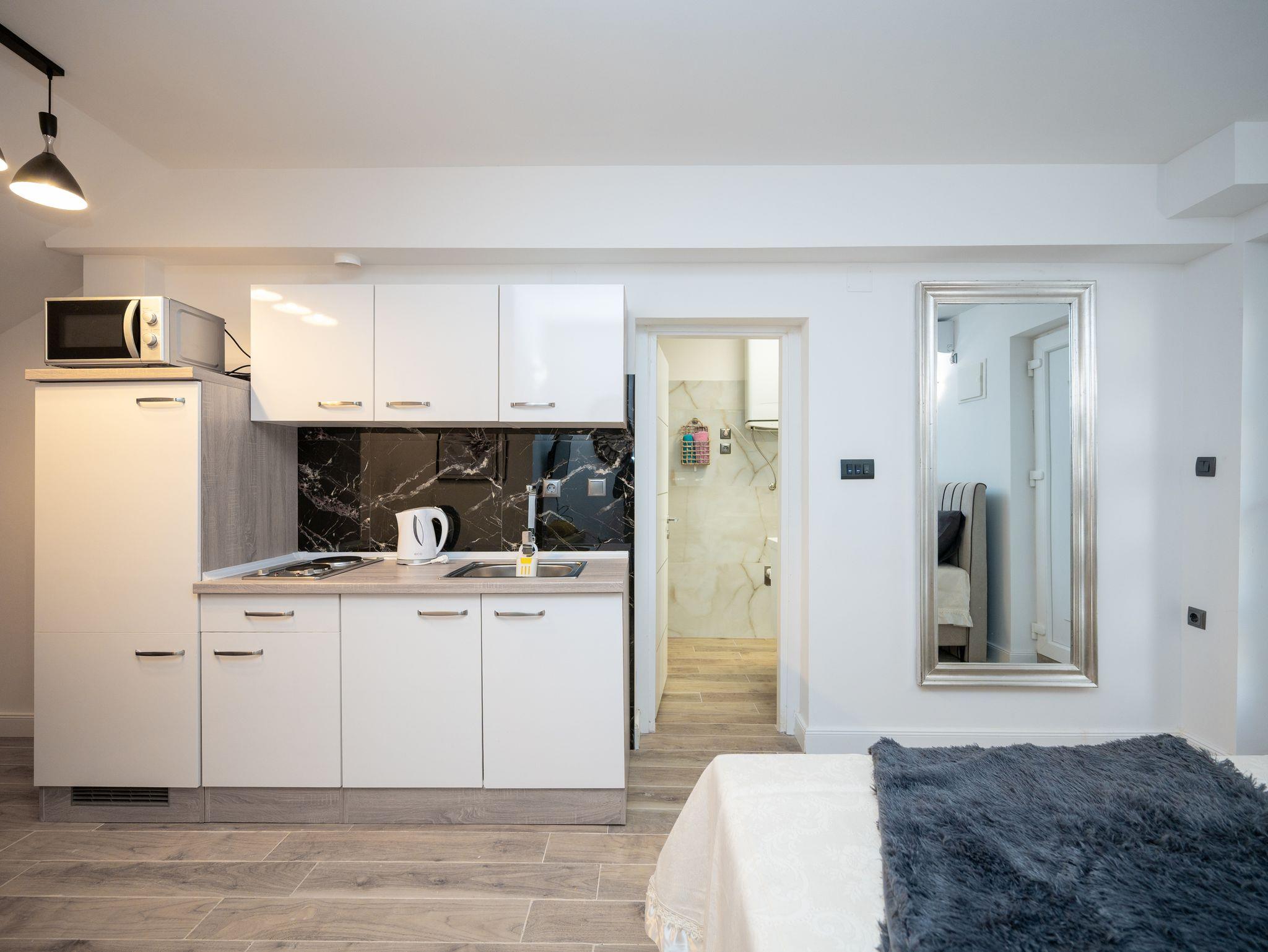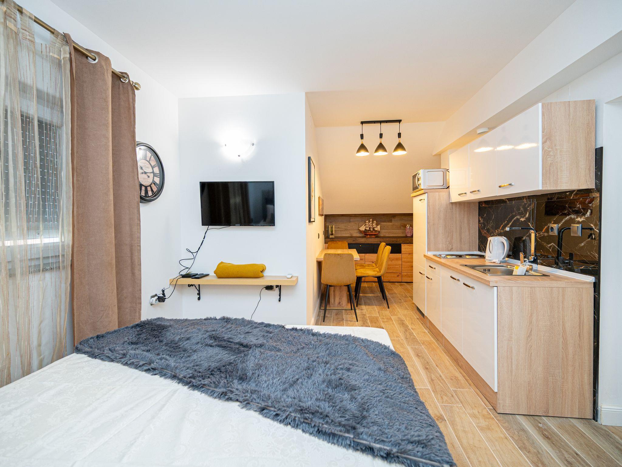 Studio bietet Platz für 2 Gäste. Die Betten sind in Schlafzimmern, die es 1 gibt, innerhalb einer Gesamtfläche von 21m2, angeordnet. Es ist erlaubt, Speisen auf dem Gemeinschafts-Grill vorzubereiten. Die reservierte Unterkunftseinheit hat keinen Balkon und keine Terrasse. IM PREIS INBEGRIFFEN: Kurtaxe, Endreinigung, Klimatisierung, Parkplatz, Internet, Bügeleisen, Bügelbrett, Föhn. VERBINDLICHE ZUSÄTZLICHE KOSTEN: Aufzahlung für Kurzaufenthalte (prozentualer Zuschlag pro Nächtigungsanzahl: 30% - 1, 20% - 2, 10% - 3). Die Verfügbarkeit zusätzlicher Dienstleistungen in Ihrem reservierten Termin und die Preise derselben (falls nicht aufgeführt) müssen im Voraus überprüft werden. Zusätzliche Dienstleistungen die in der Zahlungsaufforderung nicht aufgeführt sind werden direkt beim Vermieter bezahlt, angenommen der Gast nutzt auch diese. Ermäßigung auf den Grundpreis: Gratistag 14=13 (bei einem Aufenthalt von 14 Tagen oder mehr erhalten Sie einen Gratistag für den Aufenthalt bis 31.12.26).