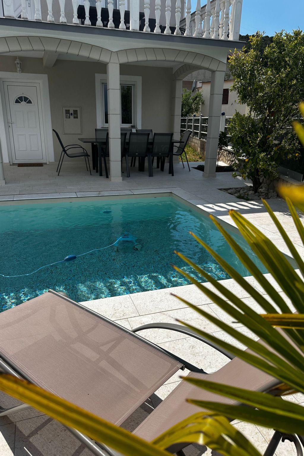 Der Außenbereich des Hauses ist ein ist schön mediterran gehalten. Der private Pool verspricht Erfrischung an warmen Tagen und der Ausblick von hier ist einfach unvergleichlich. Eine Terrasse und ein Balkon laden zu gemütlichen Stunden unter der Sonne oder Sternen ein, während der ausschließlich Ihnen gehörende Garten eine Oase der Ruhe für Entspannung im Grünen bietet. Das Grundstück ist komplett eingezäunt, womit es auch für den mitreisenden kleinen Hund bis zu einer Schulterhöhe von 30 cm sicher und perfekt ist.