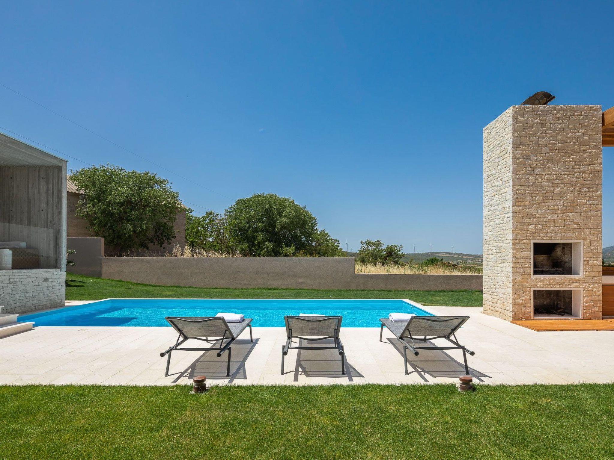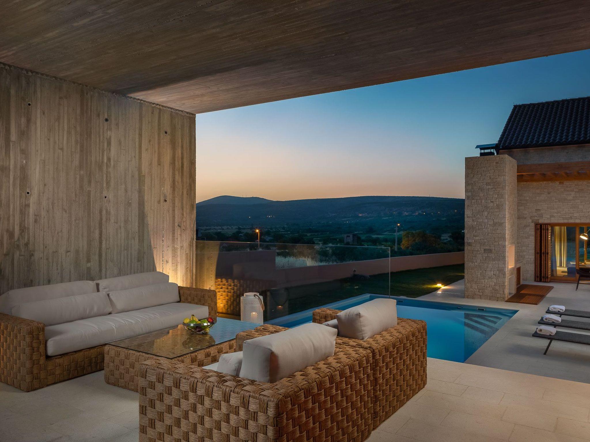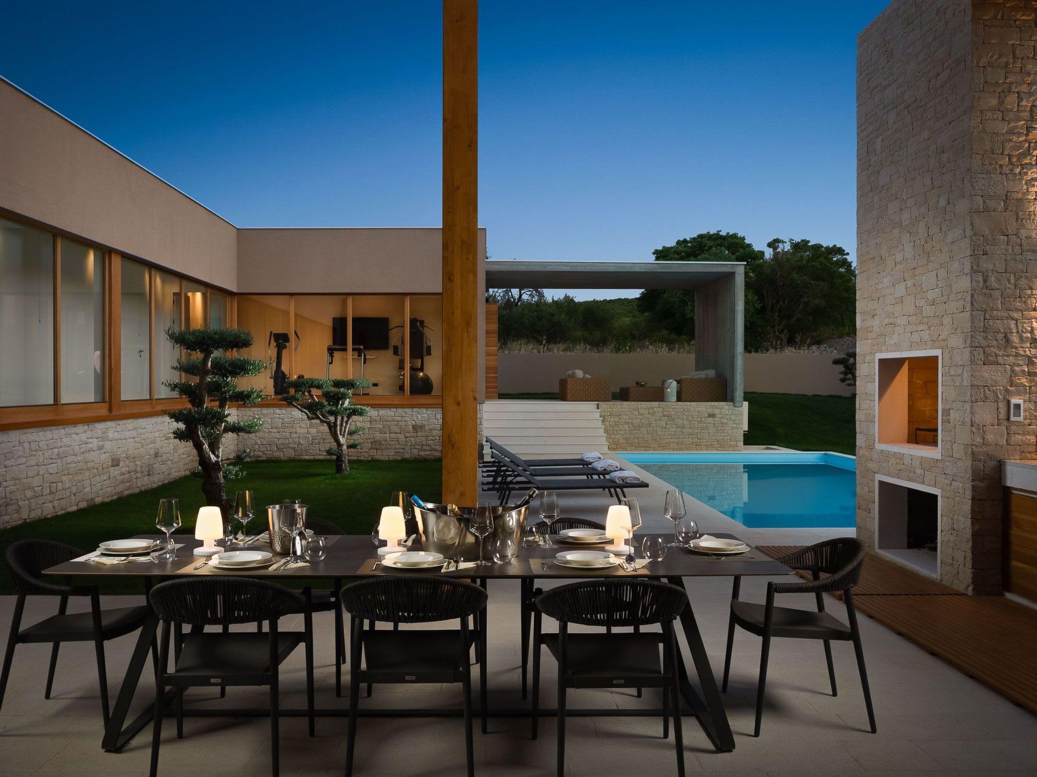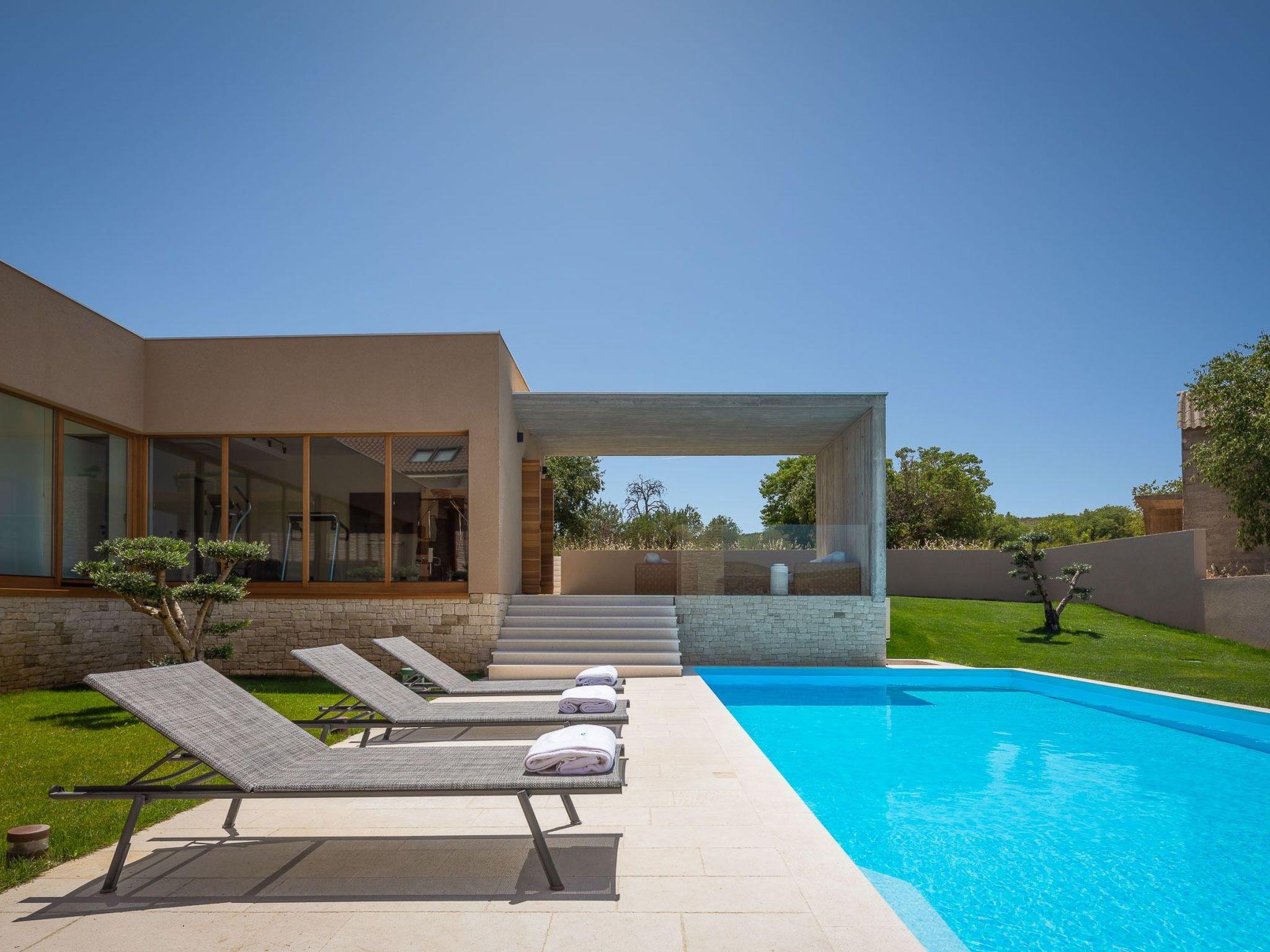 Der Außenbereich der Villa Sound of Silence ist eine Oase der Erholung und Unterhaltung. Der vollständig umzäunte Garten bietet nicht nur Privatsphäre, sondern auch einen beheizten Pool, der endlosen Spaß in der Sonne verspricht. Mit seinen Liegestühlen und Sonnenschirmen ist er ein idealer Ort zum Sonnenbaden oder für ein erfrischendes Bad. Der Speisesaal im Freien lädt zu Grillabenden unter dem Sternenhimmel ein und macht jede Mahlzeit zu einem besonderen Ereignis. Die Mischung aus mediterranem Charme mit Steinelementen, Olivenbäumen und minimalistischem Industriedesign ergänzt die Schönheit der natürlichen Umgebung und schafft einen einladenden Lebensraum im Freien.