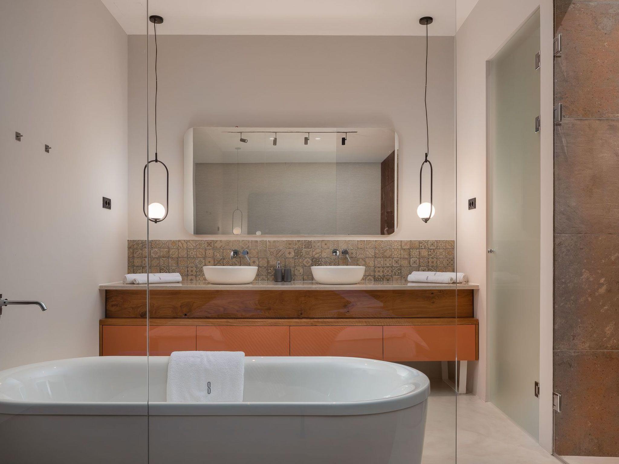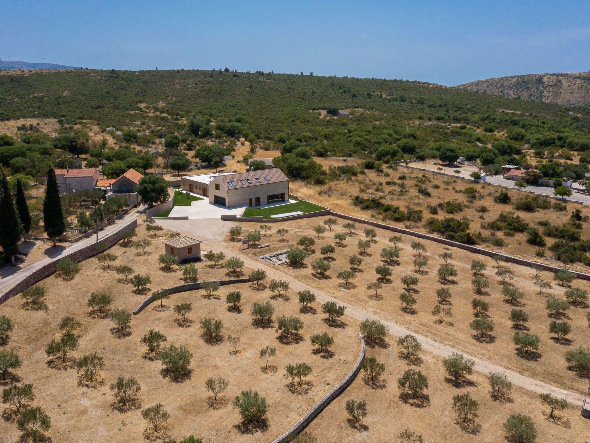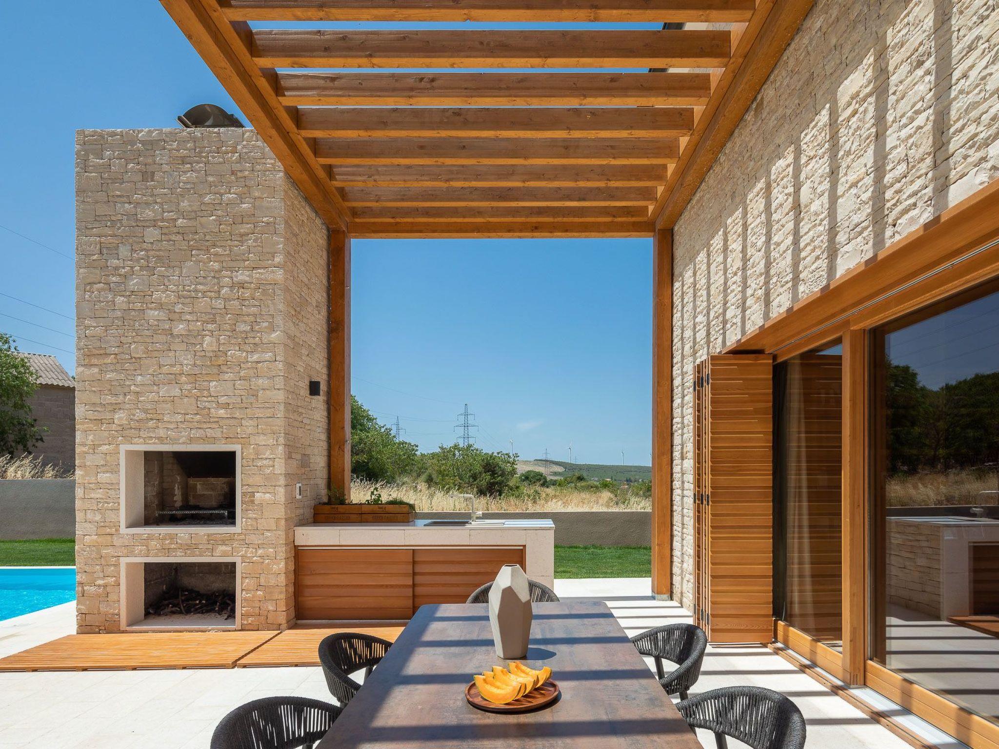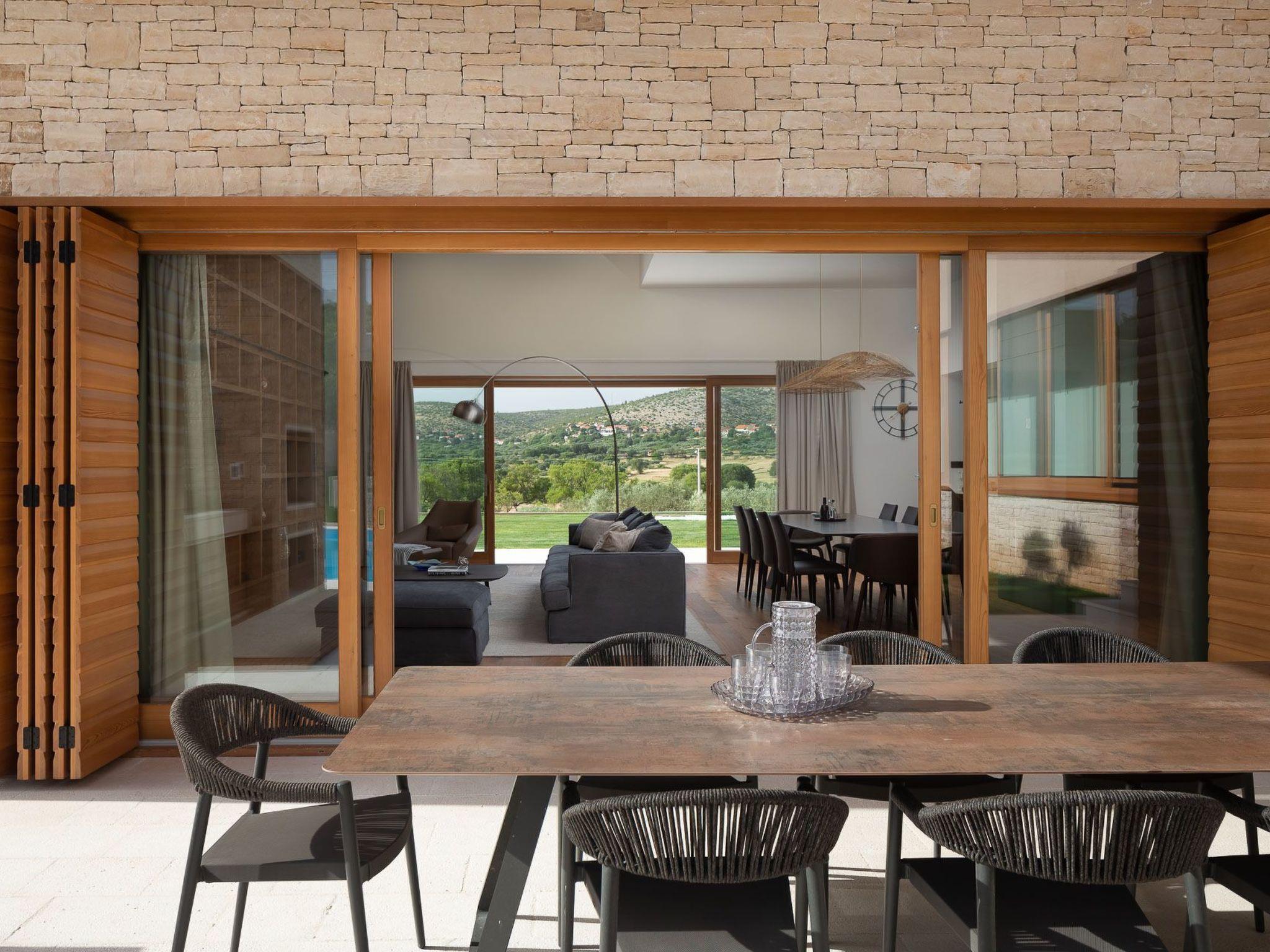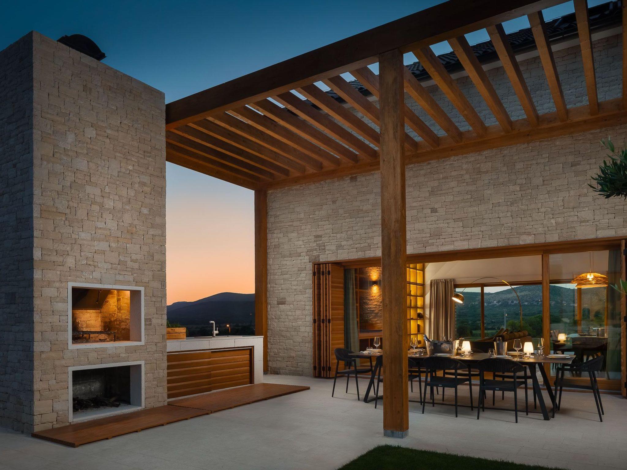 Der Außenbereich der Villa Sound of Silence ist eine Oase der Erholung und Unterhaltung. Der vollständig umzäunte Garten bietet nicht nur Privatsphäre, sondern auch einen beheizten Pool, der endlosen Spaß in der Sonne verspricht. Mit seinen Liegestühlen und Sonnenschirmen ist er ein idealer Ort zum Sonnenbaden oder für ein erfrischendes Bad. Der Speisesaal im Freien lädt zu Grillabenden unter dem Sternenhimmel ein und macht jede Mahlzeit zu einem besonderen Ereignis. Die Mischung aus mediterranem Charme mit Steinelementen, Olivenbäumen und minimalistischem Industriedesign ergänzt die Schönheit der natürlichen Umgebung und schafft einen einladenden Lebensraum im Freien.
