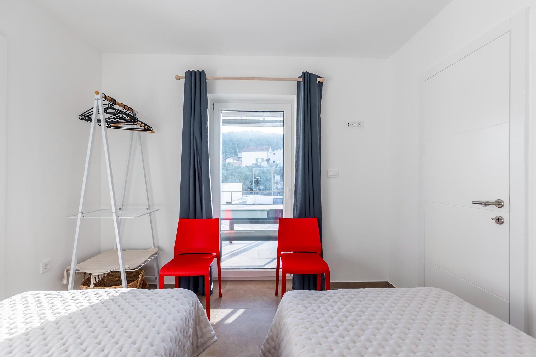 Die elegante, freistehende Villa Paloma wurde 2022 auf einem 1000 m² großen Grundstück in ruhiger Lage im Naturschutzgebiet Krka erbaut. Die drei komfortablen Schlafzimmer, jedes mit eigenem Bad, bieten Ihnen Entspannung und Erholung während Ihres Urlaubs. In Kroatien, dem Land der wunderbaren Sonne, können Sie an unserem 10 x 5 Meter großen, beheizten Swimmingpool und auf den zahlreichen Terrassen rund um das Anwesen zu jeder Tageszeit Sonne oder Schatten genießen. In 4 Minuten zu Fuß haben Sie Ihre Füße im riesigen Prokljan-See, der Sie mit seinem halbweichen Wasser verzaubern wird, in dem Sie ein längeres Schwimmen genießen oder die wunderschönen Fische beobachten können. Die Villa befindet sich in ruhiger Lage abseits des Dorfzentrums. Mehrere Restaurants, Geschäfte, Bars oder Eisdielen befinden sich jedoch in unmittelbarer Nähe. Gourmets und Feinschmecker werden sich für die gut ausgestattete Küche (Induktionsherd, Kombidampfgarer, Kenwood Cooking Chef, ...) oder die Außenküche auf der Terrasse, die von einer modernen Pergola geschützt wird, entscheiden. Die hübsche Stadt Sibenik, die nur 5 Autominuten entfernt liegt, wird Sie mit ihren Fußgängergassen aus weißem Naturstein und ihrem Morgenmarkt begeistern, der Sie jeden Tag mit den Produkten der lokalen Erzeuger versorgt. Ein ausgezeichneter Ausgangspunkt für verschiedene Ausflüge wie die Krka-Wasserfälle, das Naturschutzgebiet der Plitvicer Seen, die Halbinsel Primosten, die Meeresorgeln der Stadt Zadar, die Städte Split, Vodice oder Trogir. Und für die Kinder können Sie den Aquapark in Solaris in nur 15 Minuten erreichen.