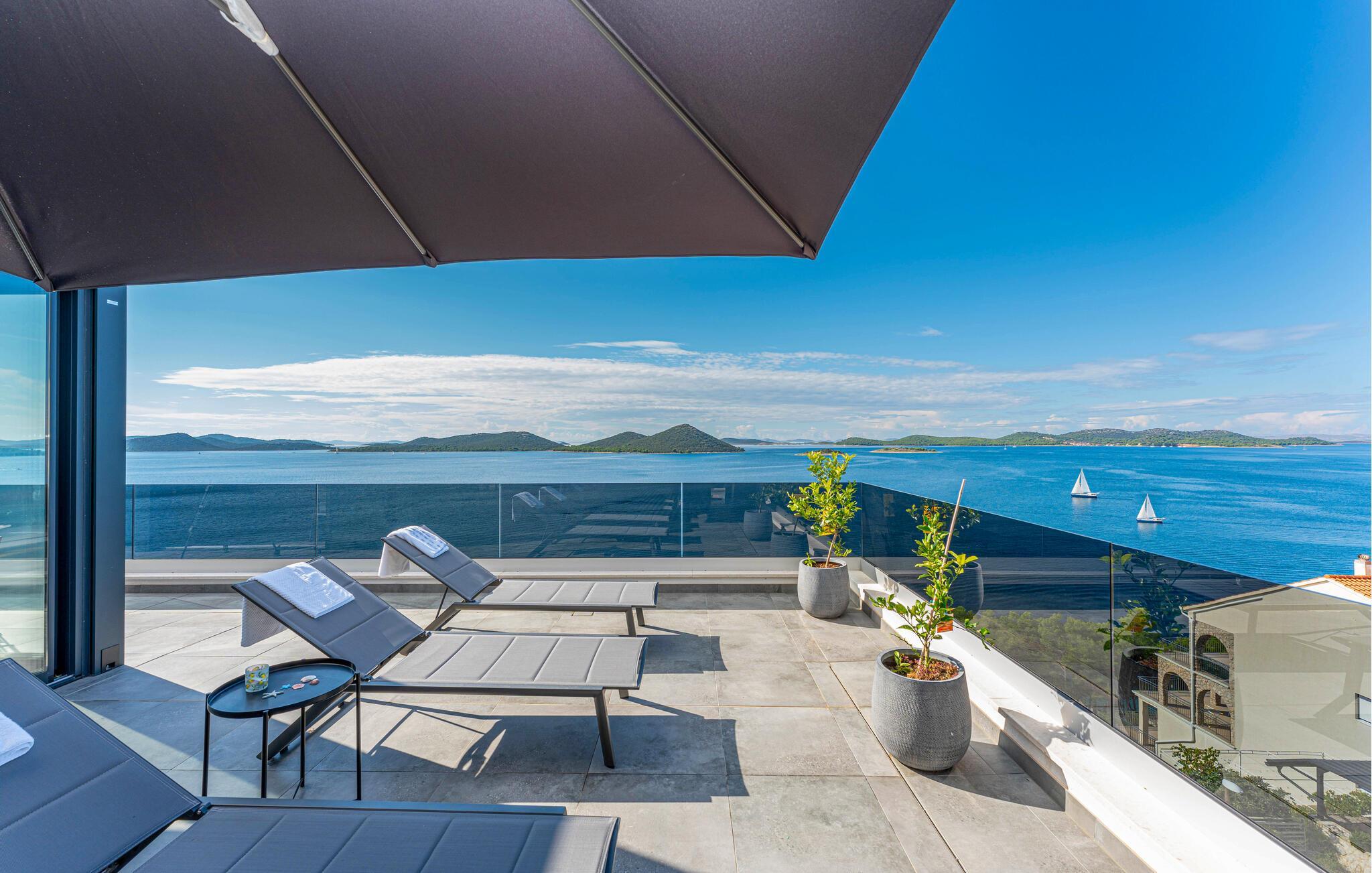 Verbringen Sie schöne Stunden im Freien, die Terrasse lädt dazu ein, ausgiebig die Sonne und kalte Getränke zu genießen und dabei den Blick weit über das blaue Meer schweifen zu lassen. Whirlpool, Sauna und Außenküche, die gemeinschaftlich genutzt werden, erwarten Sie auf der atemberaubenden gemeinsamen Dachterrasse.