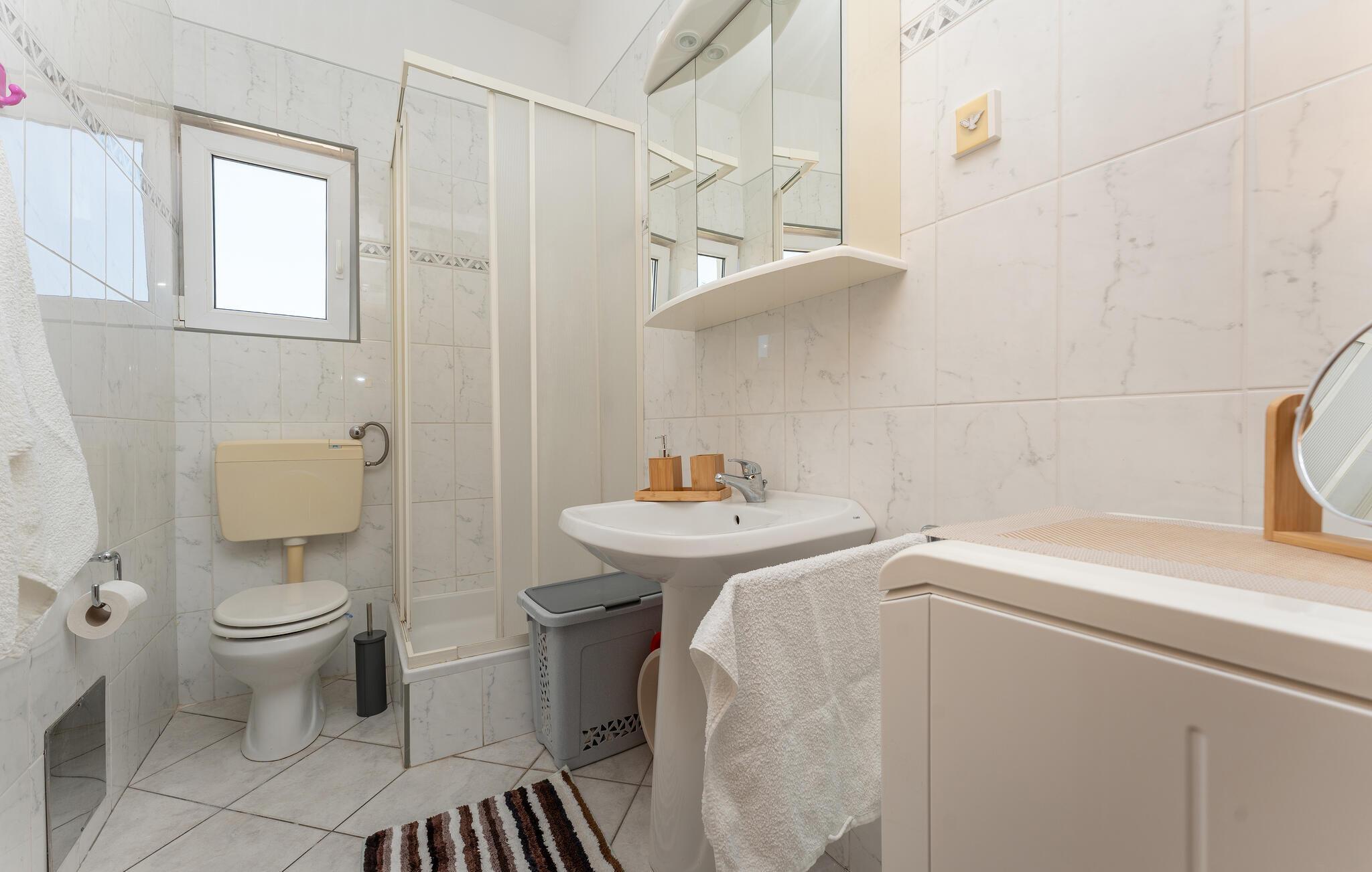 Verbringen Sie erholsame Urlaubstage in dieser einladenden Ferienwohnung. Die zentrale Lage nahe der Küste, das familiäre Wohnumfeld und die schöne Aussicht auf das Meer machen diese Unterkunft zu einem idealen Ausgangspunkt für Ihren Aufenthalt an der Adria. Machen Sie es sich im großzügigen Wohnbereich bequem. Der Raum ist mit einer gemütlichen Eckcouch, einem Fernseher und einer Vitrine ausgestattet und lädt zum Entspannen nach einem erlebnisreichen Tag ein. Bereiten Sie Ihre Mahlzeiten in der geräumigen Essküche zu und genießen Sie Ihre Speisen am großen Esstisch.