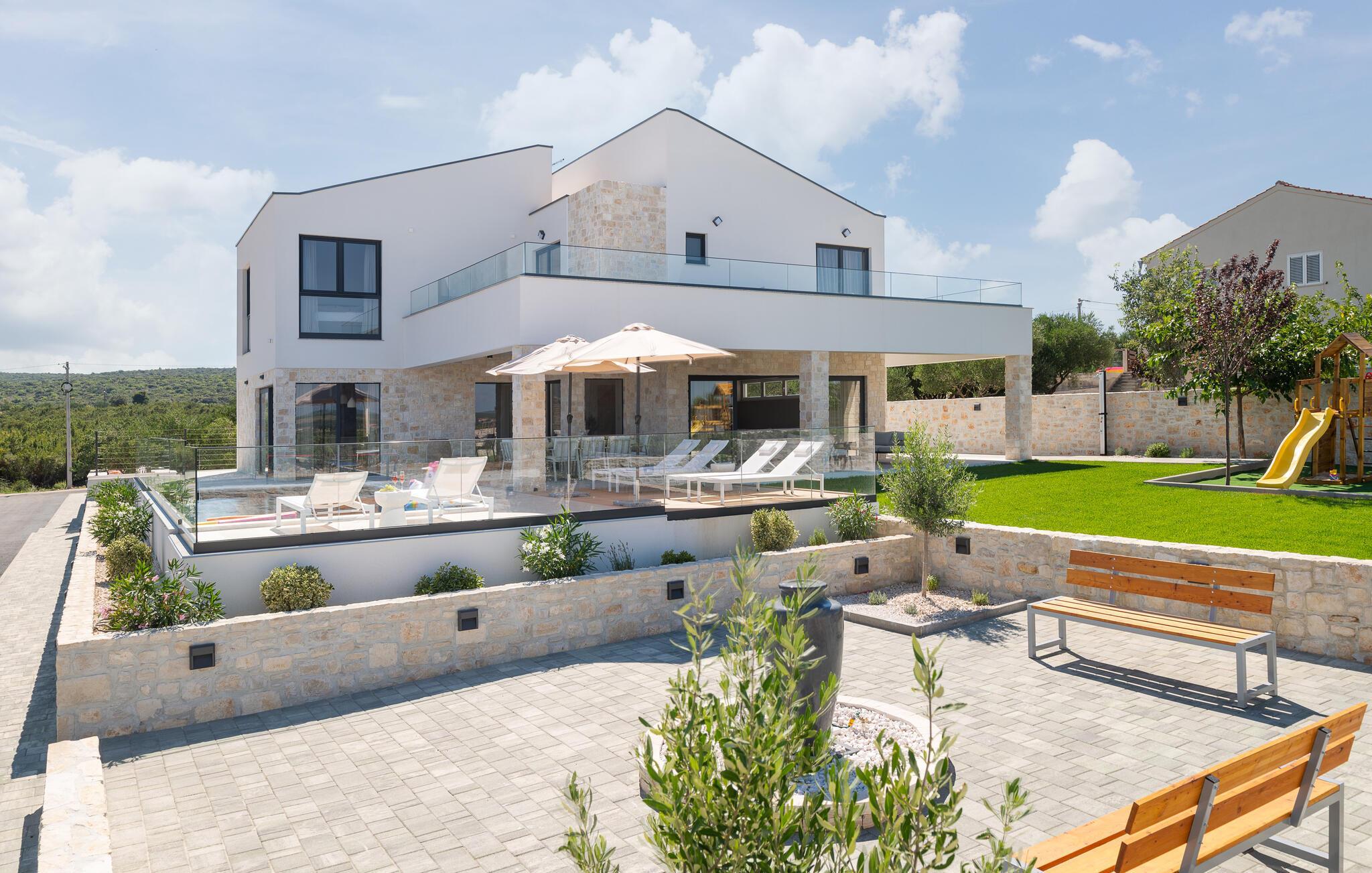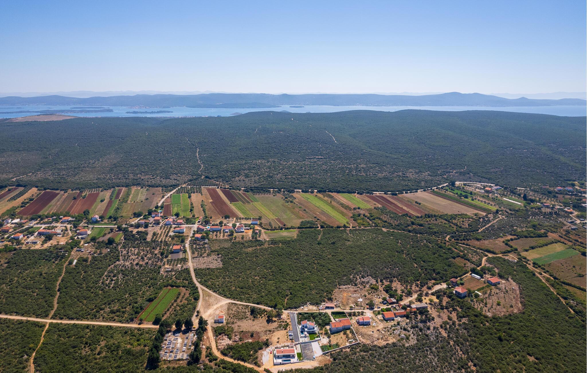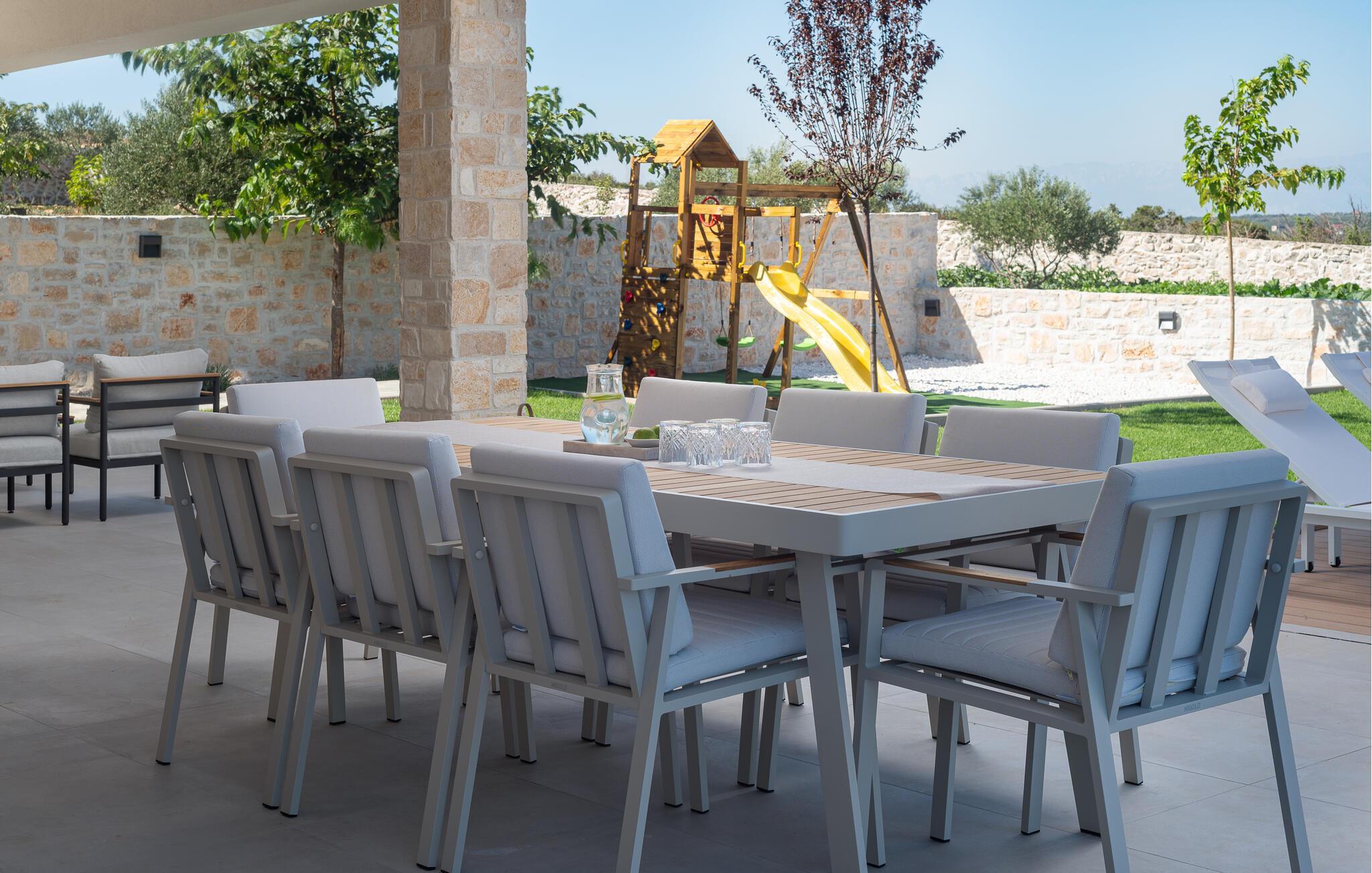 Genießen Sie den atemberaubenden Ausblick auf das grüne Hinterland der Region Zadar, der sich Ihnen von der großzügigen Terrasse und dem Poolbereich aus bietet. Entspannen Sie sich auf den bequemen Sonnenliegen und lassen Sie die Seele baumeln. Nehmen Sie Ihre Kinder mit auf den gemeinsamen Spielplatz, der mit dem benachbarten Haus geteilt wird, und genießen Sie unbeschwerte Stunden. Oder betätigen sich sportlich auf den Sportplätzen.