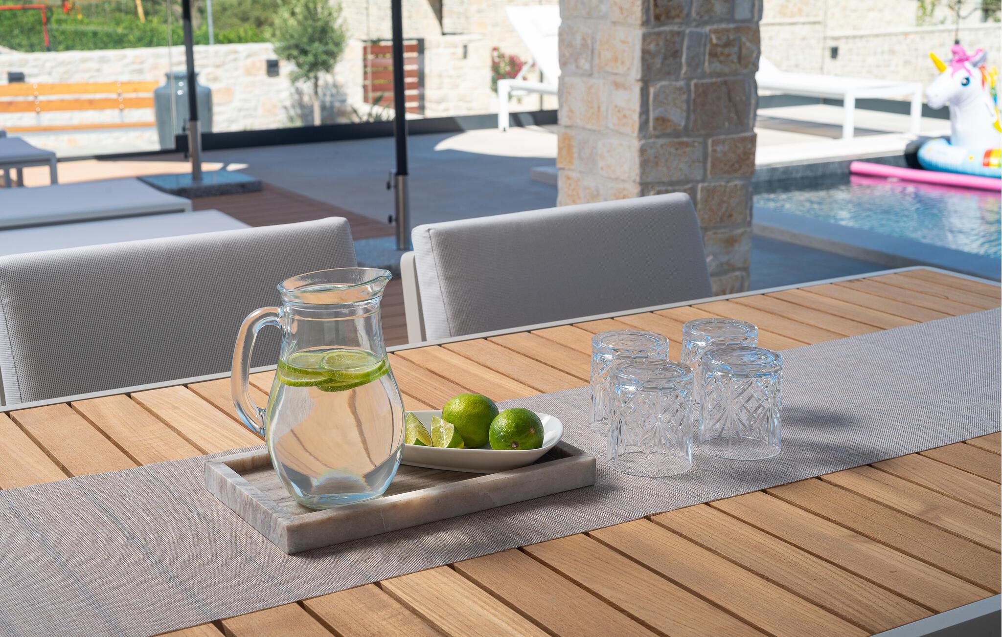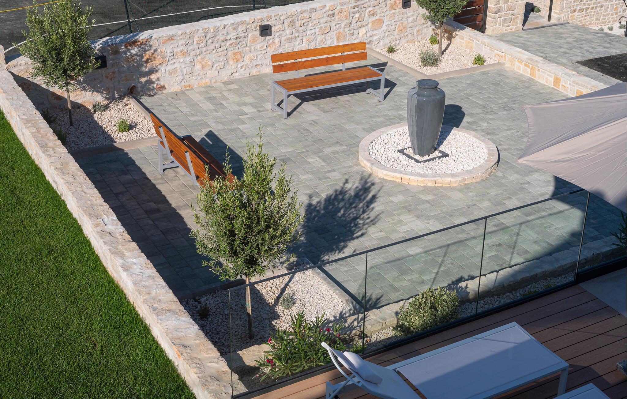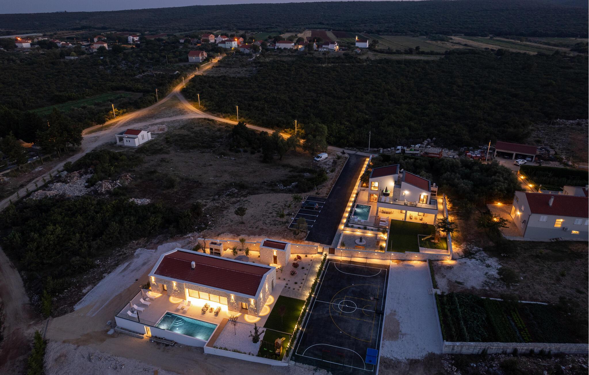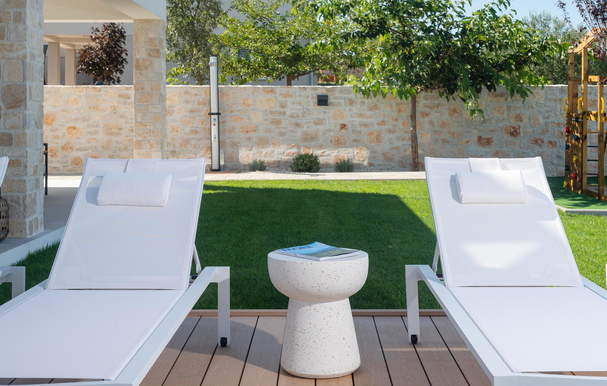 Genießen Sie den atemberaubenden Ausblick auf das grüne Hinterland der Region Zadar, der sich Ihnen von der großzügigen Terrasse und dem Poolbereich aus bietet. Entspannen Sie sich auf den bequemen Sonnenliegen und lassen Sie die Seele baumeln. Nehmen Sie Ihre Kinder mit auf den gemeinsamen Spielplatz, der mit dem benachbarten Haus geteilt wird, und genießen Sie unbeschwerte Stunden. Oder betätigen sich sportlich auf den Sportplätzen.