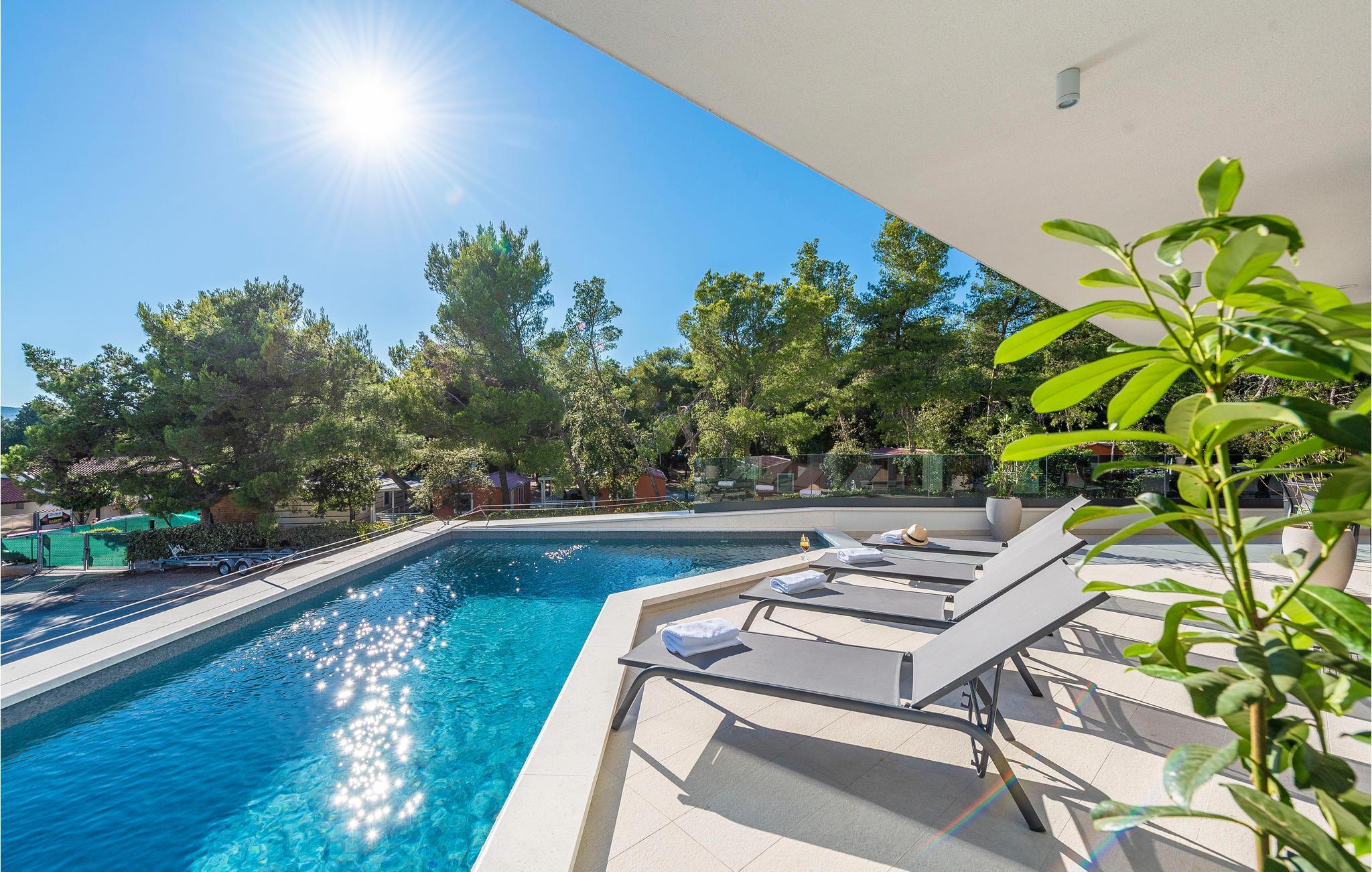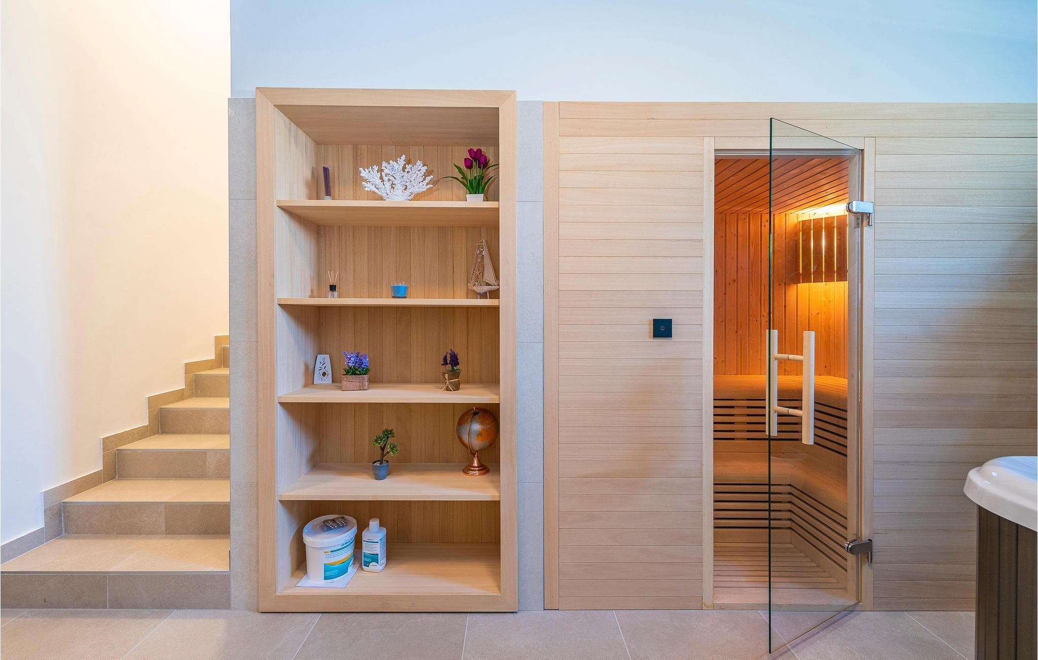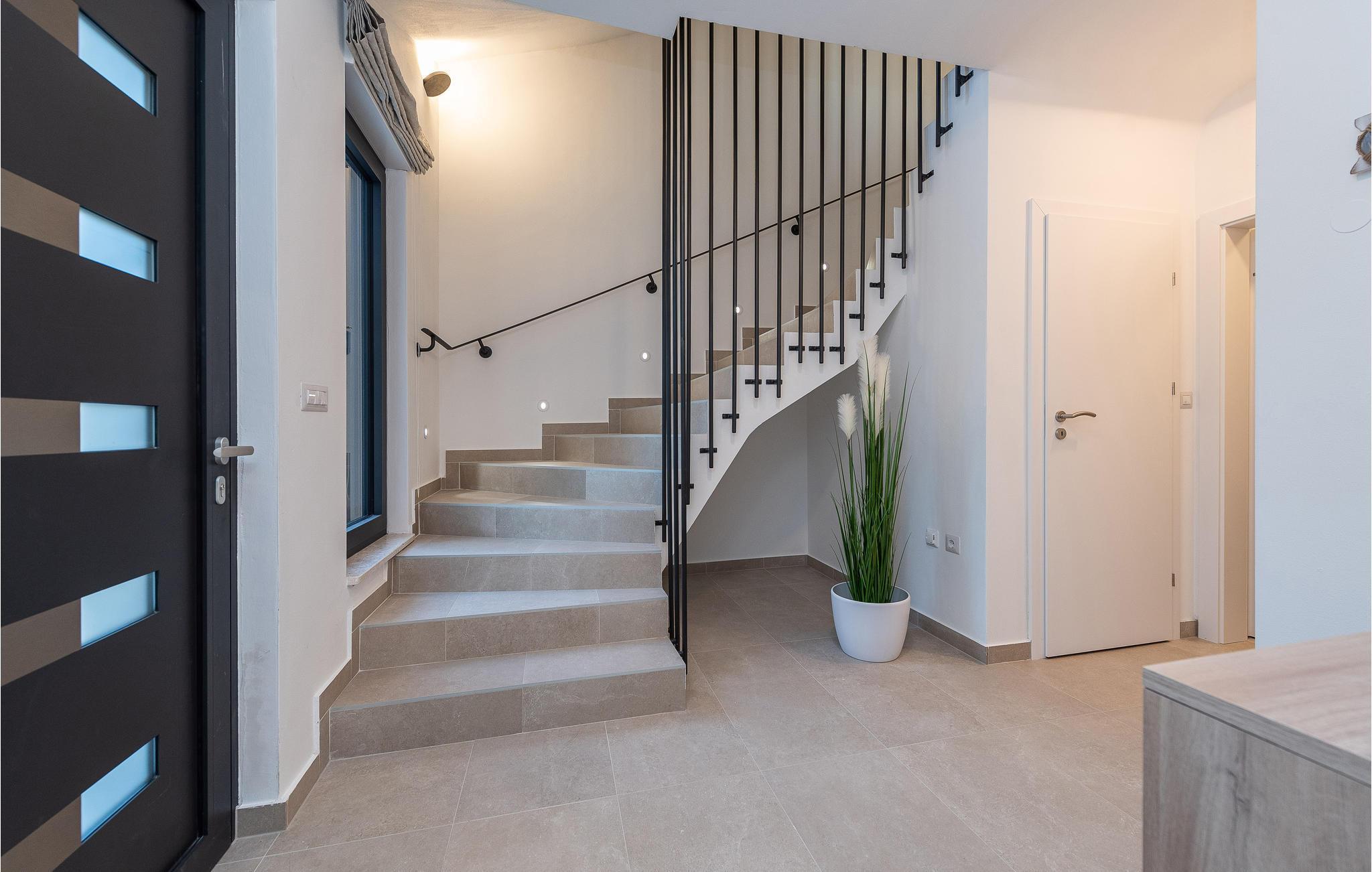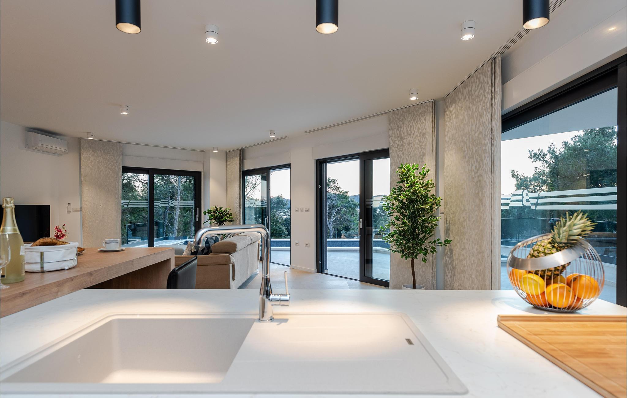 Dieses außergewöhnliche Ferienhaus mit eigenem Pool besticht durch moderne Architektur. Es wird Sie mit seiner einzigartigen Einrichtung und durch seine Qualität überzeugen. Im Erdgeschoss mit zwei Schlafzimmern befindet sich auch ein Spielzimmer und eine Fitness- und Wellnessoase. Im ersten Stock liegt ein großer Raum mit Küche, Essbereich und Wohnzimmer sowie Zugang von allen Seiten auf eine Terrasse mit Pool. Im zweiten Stock befinden sich drei Schlafzimmer mit Bädern und eine weitere überdachte Terrasse.
