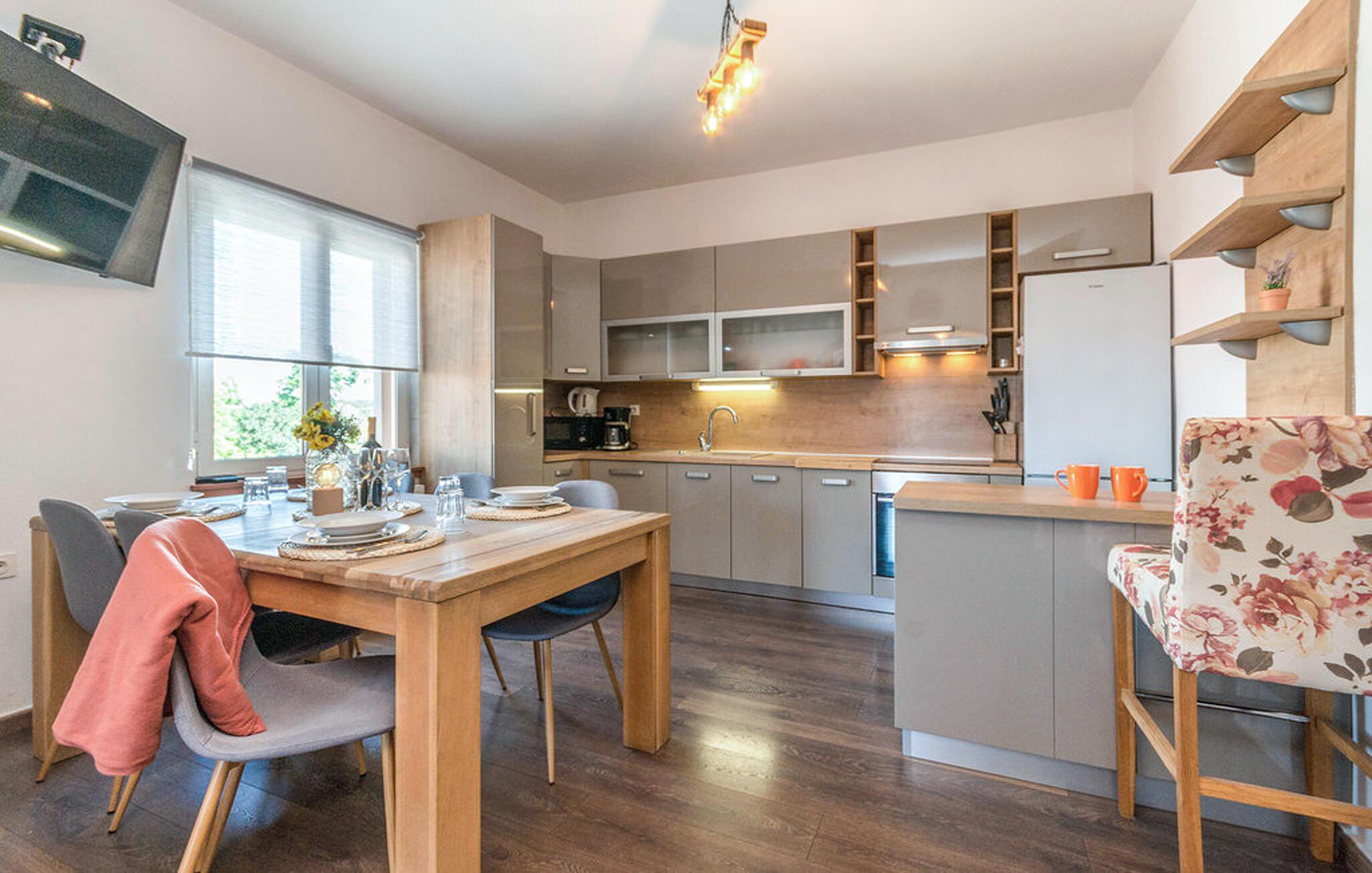 Diese großzügige Ferienwohnung bietet Ihnen und Ihrer Familie alles für einen unvergesslichen Urlaub. Die geschmackvoll eingerichteten Innenräume schaffen eine einladende Atmosphäre, ideal für gesellige Stunden. Ruhe Sie sich in den schönen Schlafzimmern aus oder kommen Sie zum gemeinsamen Kochen in der modernen Küche zusammen.