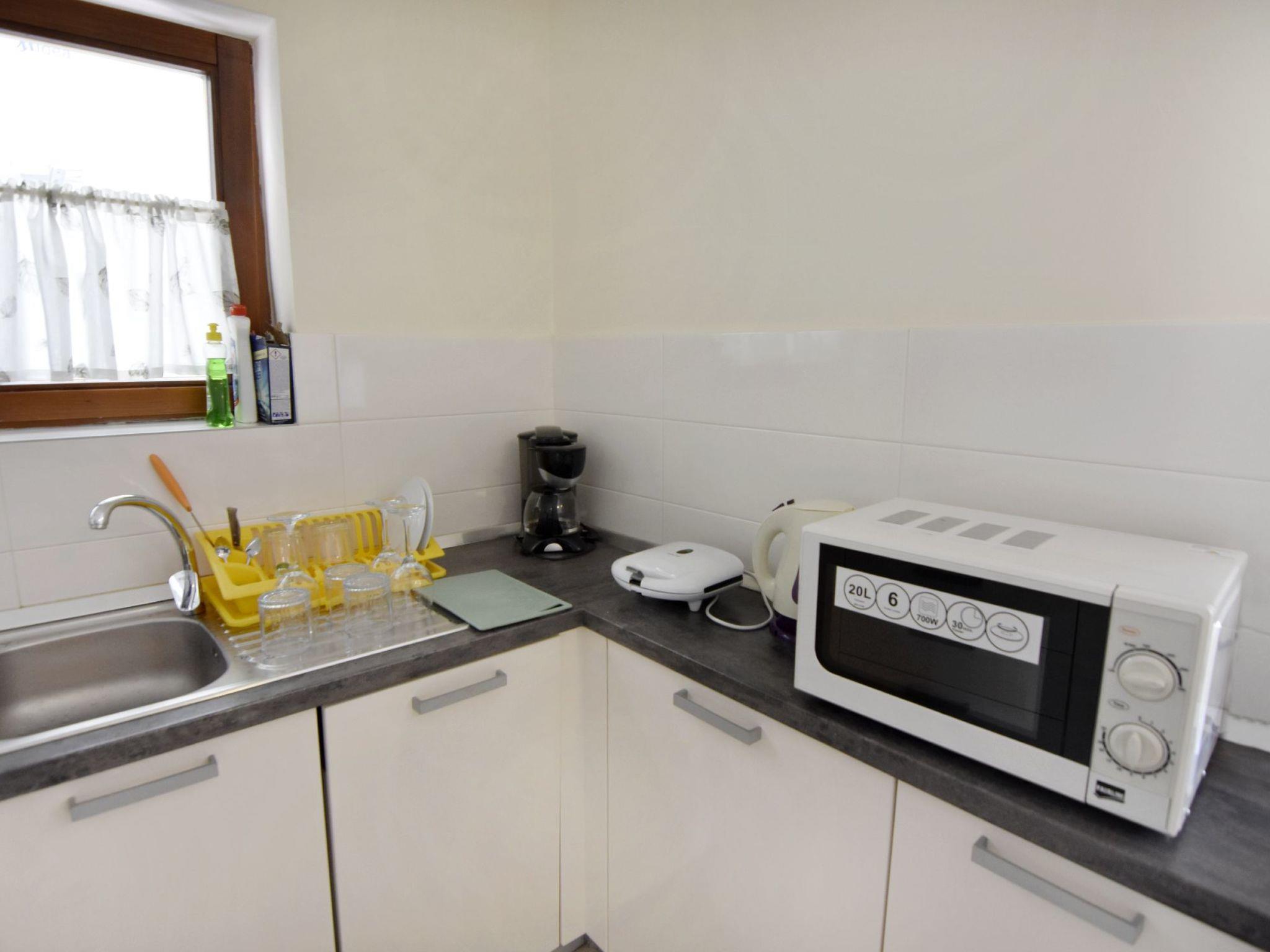 Die voll ausgestattete Küche ist mit einem Geschirrspüler, einem Kühlschrank mit Gefrierfach, einer Mikrowelle, einem Toaster, einer Kaffeemaschine, einem Wasserkocher und allen notwendigen Küchenutensilien ausgestattet. Angrenzend an die Küche bietet der Essbereich einen Tisch mit Stühlen. Im Eingangsbereich lädt ein einladender Wohnbereich mit Schlafsofa und Sat-TV zum Entspannen ein.