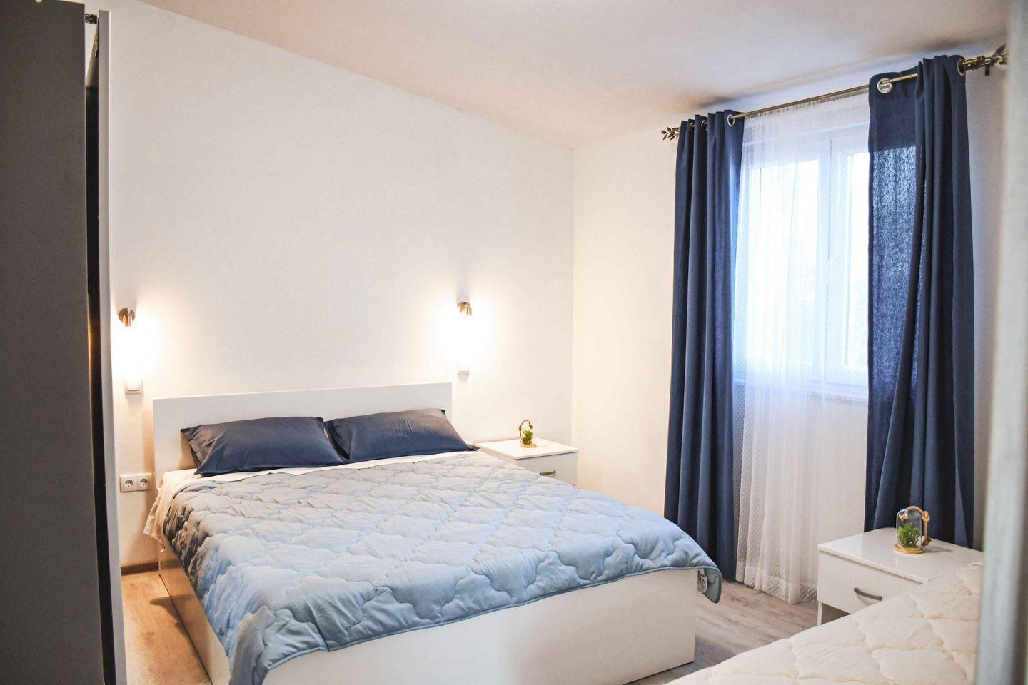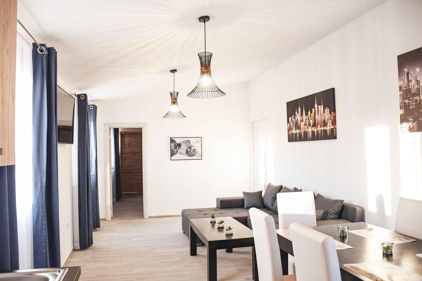 Modernes, klimatisiertes Apartment mit eigenem Eingang, zwei Schlafzimmern, großzügigem Wohnzimmer und Bad mit ebenerdiger Dusche. Voll ausgestattete Küche, Grill, schallisolierte Wände, Flachbild-TV mit Streaming-Diensten sowie Tee- und Kaffeemaschine – ideal für entspannte Urlaubstage mit Komfort.