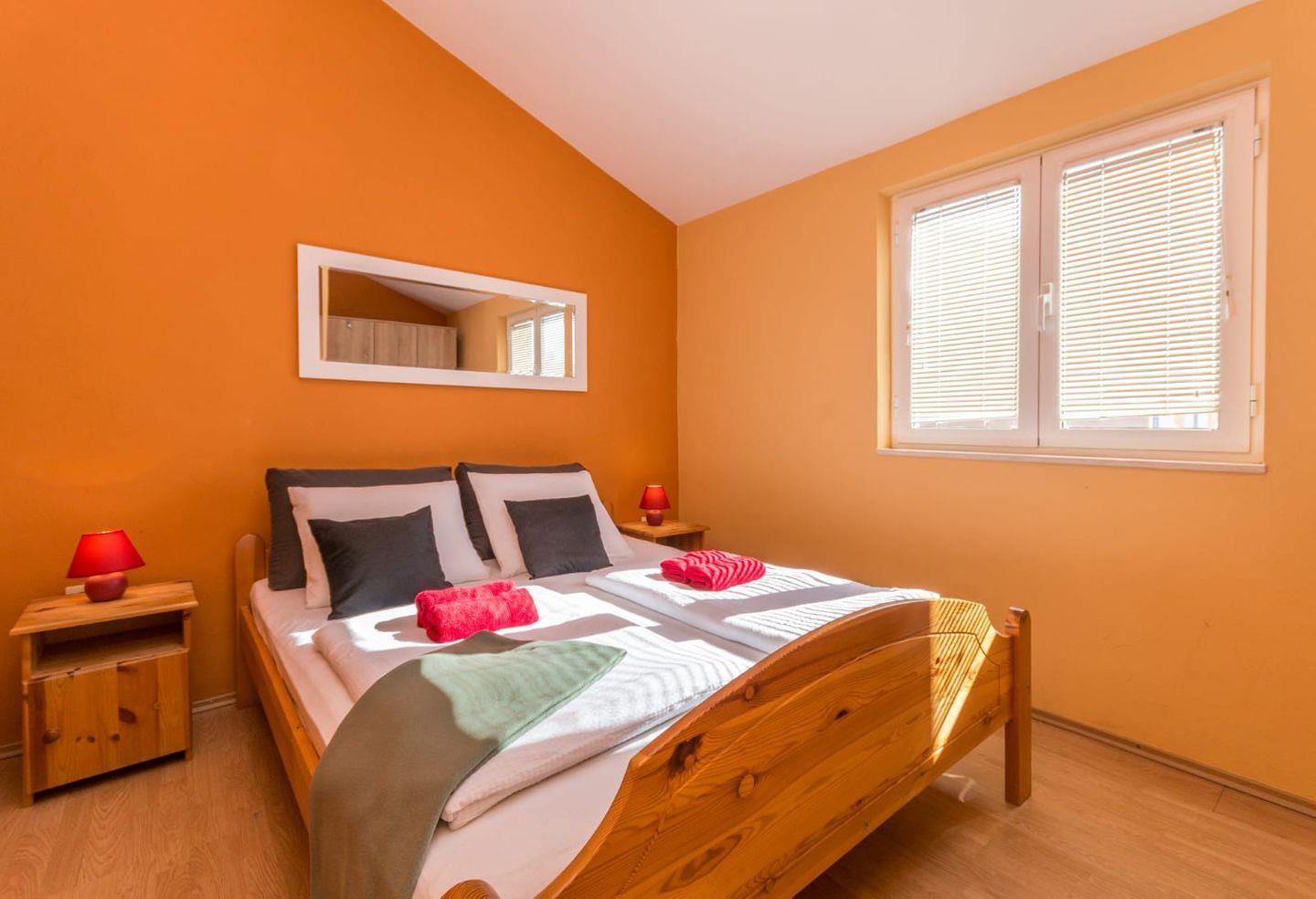Gemütliche Wohnung im 1. Stock mit überdachtem Balkon und Gartenmöbeln. Zwei Schlafzimmer mit Doppelbetten, ein Badezimmer mit Dusche und Fenster. Offener Wohn- und Essbereich mit voll ausgestatteter Küche (Herd, Mikrowelle, Wasserkocher), Sitzgruppe sowie Sofa und TV. Ideal für Familien oder Paare – ruhig gelegen und gut ausgestattet.