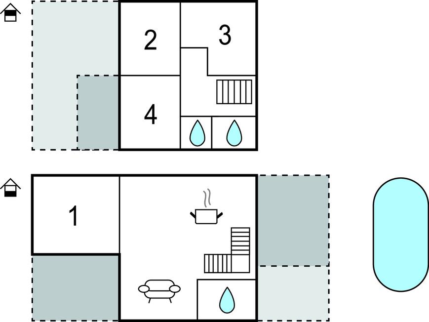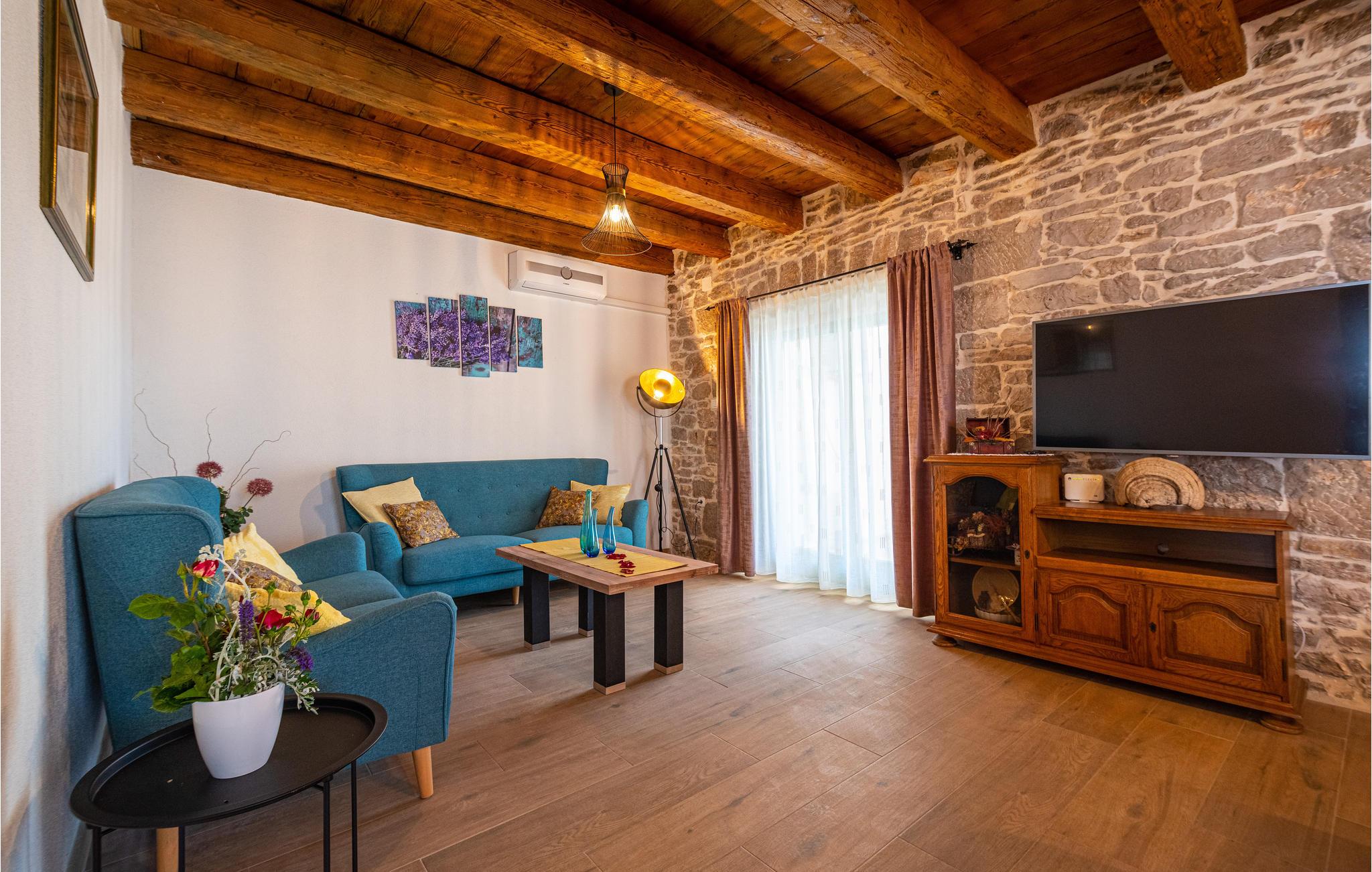 Dieses Ferienhaus bietet viel Platz und eine gemütliche Atmosphäre mit moderner Einrichtung und Holz- und Steinelementen. Im Erdgeschoss begrüßt Sie das Wohnzimmer mit offener Küche und Essplatz. Versammeln Sie sich hier am Abend für schöne Stunden mit der Familie auf den gemütlichen Sofas und planen Sie die Aktivitäten des nächsten Tages. Hier finden Sie auch eines der Schlafzimmer. Über Treppen erreichen Sie den 1. Stock, wo sich drei Schlafzimmer und 2 Badezimmer und befinden. Ein weiteres Bad finden Sie im Erdgeschoss.
