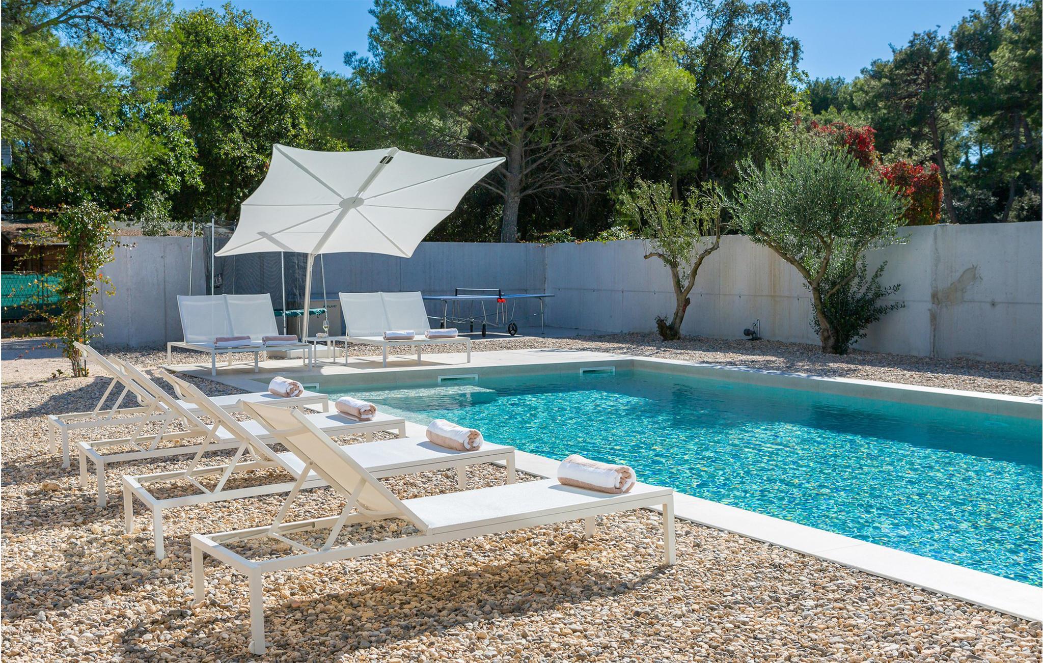 Pure Erholung erwartet Sie auch im wunderschönen Pool, der mit bequemen Sonnenliegen ausgestattet ist. Nutzen Sie den Fitnessbereich für Ihr Workout oder gönnen Sie sich wohlige Momente im Whirlpool. Spielen Sie Tischtennis oder Badminton, während sich die Kinder auf dem Spielplatz austoben, und plaudern Sie bei einem Glas Wein in der Lounge bis tief in die lauen Sommernächte hinein. Die Sommerküche mit einladender Essgelegenheit ist der ideale Ort für stimmungsvolle Grillabende.