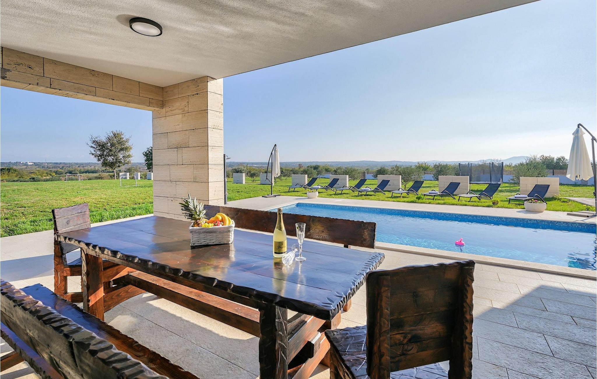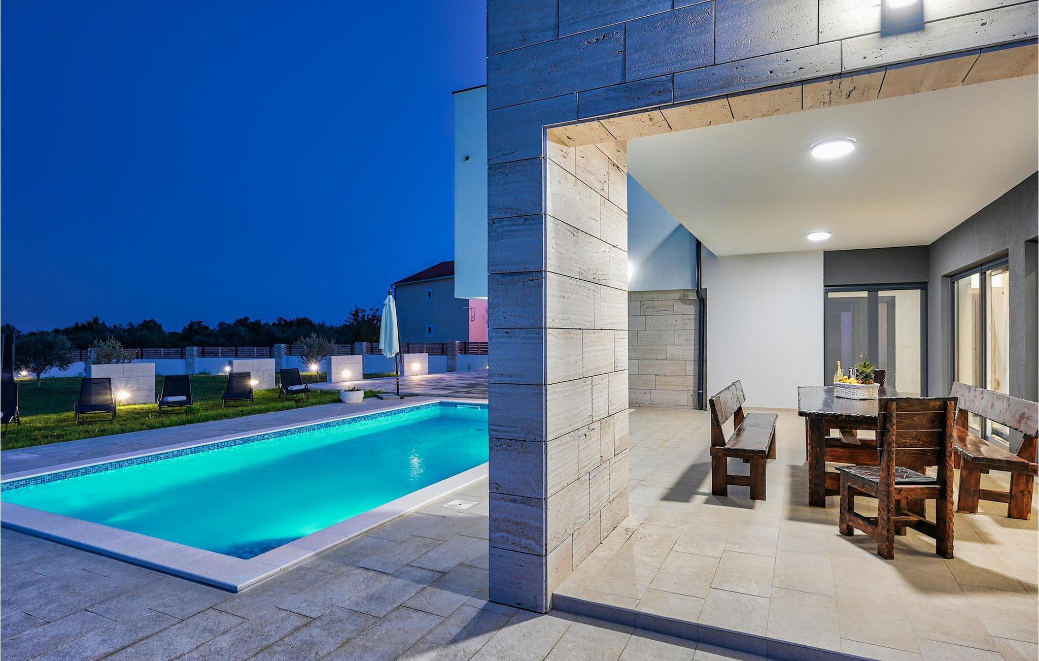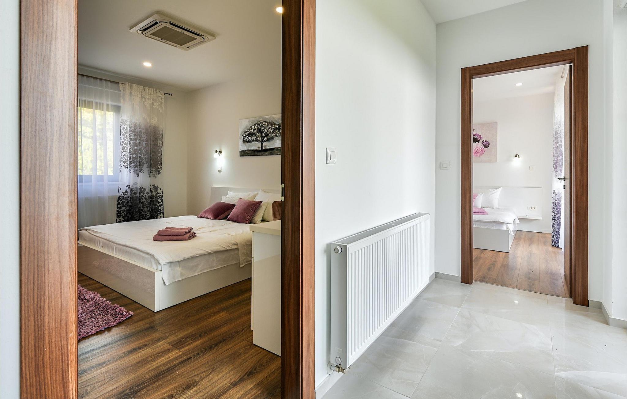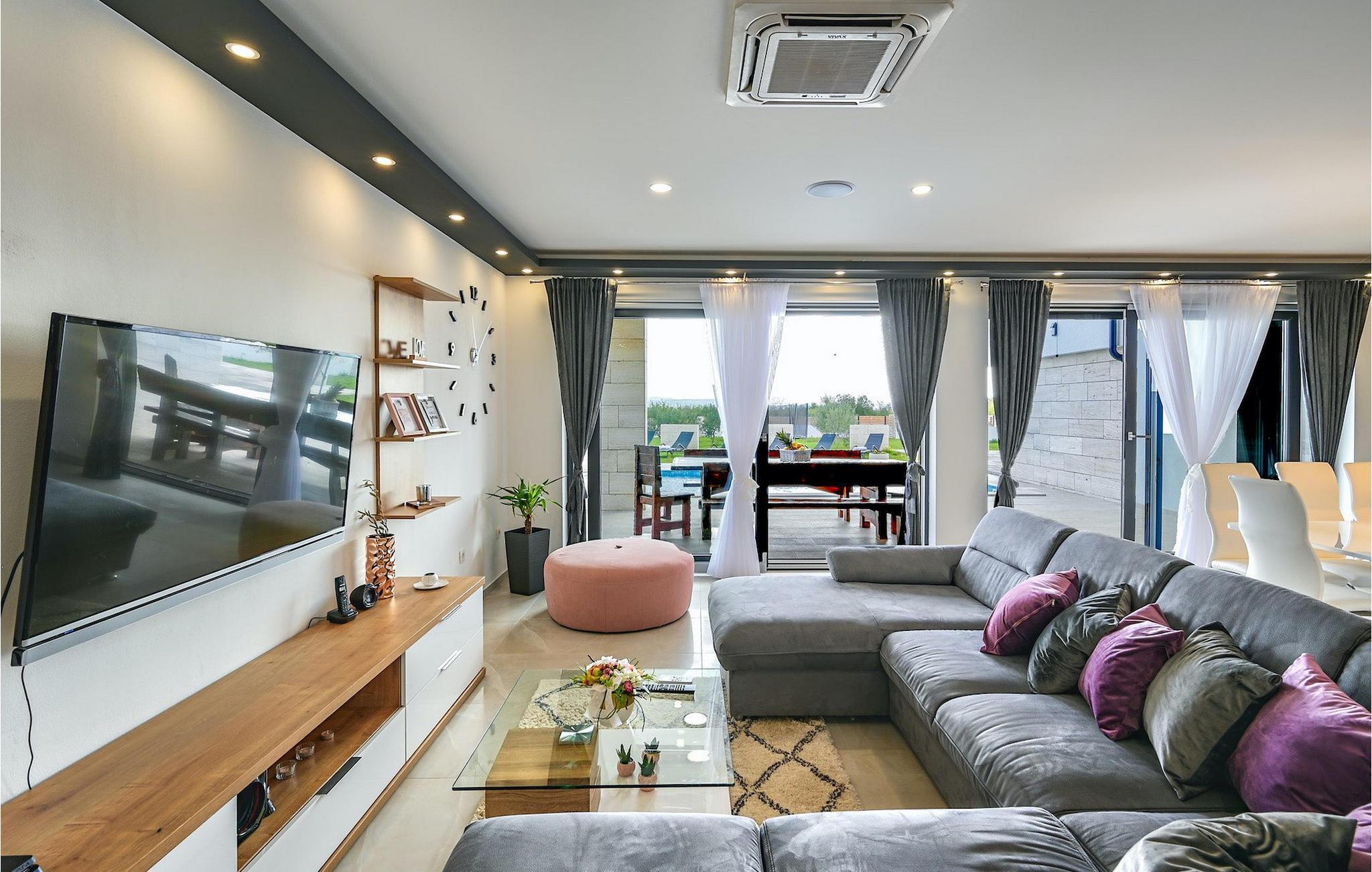 If you are looking for a beautiful, modern villa close to the sea and untouched nature, Villa FA Exclusive is your right choice! This wonderful villa can accommodate 8 guests in 4 bedrooms and it has much more to offer. If you are looking for entertainment or a little work-out session you will find some fitness equipment and darts on the ground floor. The ground floor also offers a spacious, contemporary furnished area with a living and dining room and a nice, furnished kitchen. Here you will also find a bedroom, while the other 3 are located on the first floor. All the bedrooms have double beds, air conditioners and TVs at disposal and the ones on the floor also have en suite bathrooms. The outdoor area with the inviting pool is the perfect place for sunbathing and relaxation on one of the sun loungers. If you are traveling with kids the garden disposes over a playground for children as well as a trampoline. For al fresco dinner nights there is also a grill available and the first beach is only 3 km away.Die Villa FA Exclusive befindet sich in einen kleinen Ort Donje Rastane gegenüber der Pasman Insel und nur etwa 20 km entfernt von einem der sehenswerten Touristenzentrums Dalmatiens - Zadar. Diese Lage ist perfekt für diejenigen die gerne am Strand ausruhen, aber auch für aktive Urlauber da der Nationalpark Paklenica nur 50 km entfernt ist. In der Nähe befindet sich auch der Vrana See mit schöner Natu, zwischen Meer und den Bergen. Hier kann man schön wandern, Radtouren machen und die Natur bewundern. Besuchen Sie auch unbedingt die wunderschöne Stadt Zadar mit zahlreichen kulturellen und gastronomischen Angebot. Besuchen Sie viele Museen, bewundern Sie die antike Architektur oder genießen Sie natürliche Strände und das aktive Nachtleben. Im Stadtzentrum von Zadar dürfen Sie nicht verpassen das alte Forum mit der Kirche des hl. Donatus (aus den 9. Jahrhundert) zu besuchen. Dies ist eines der wichtigsten Denkmale von Zadar, mit der Kirche im romanischen Stil erbaut.