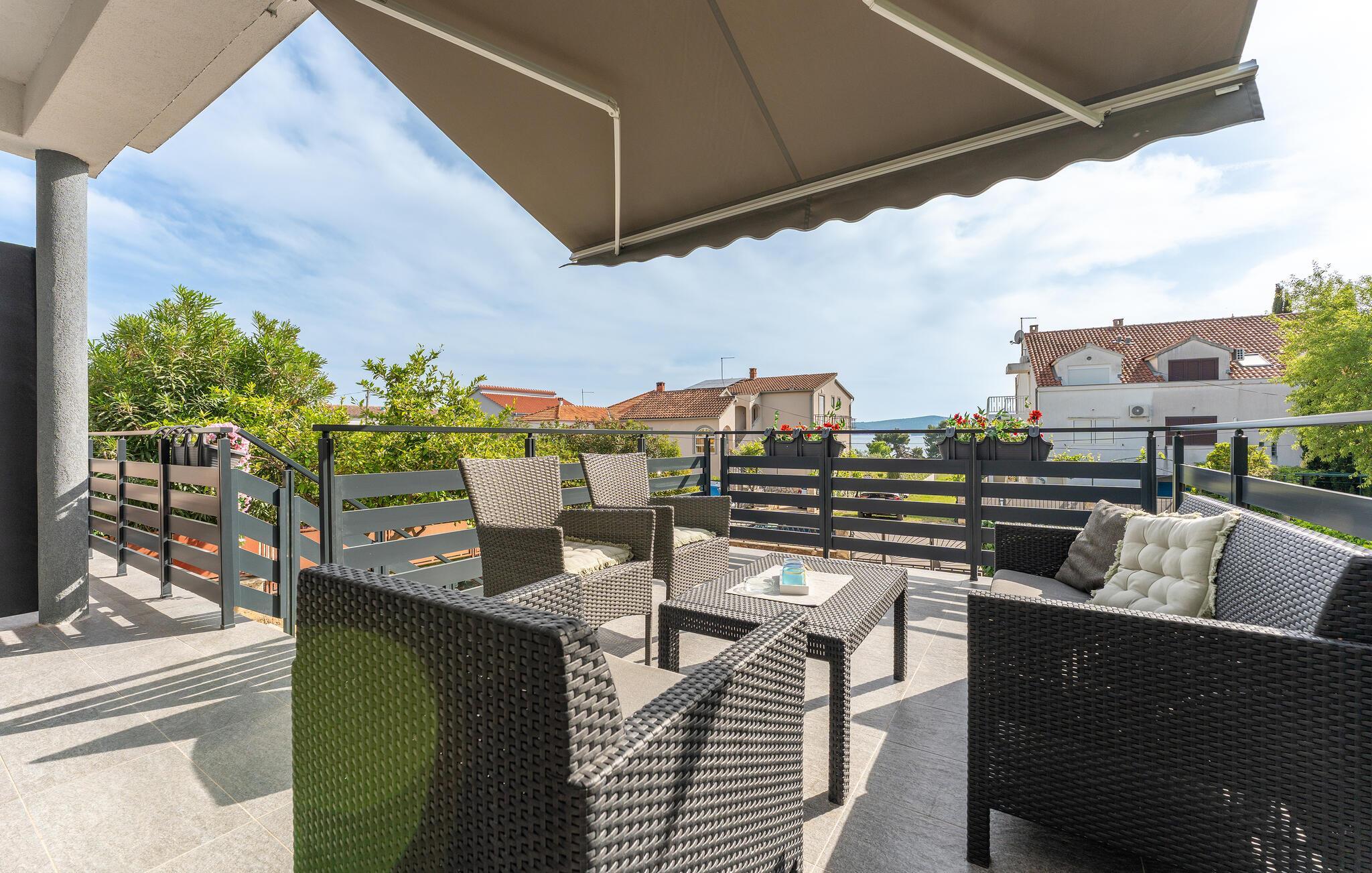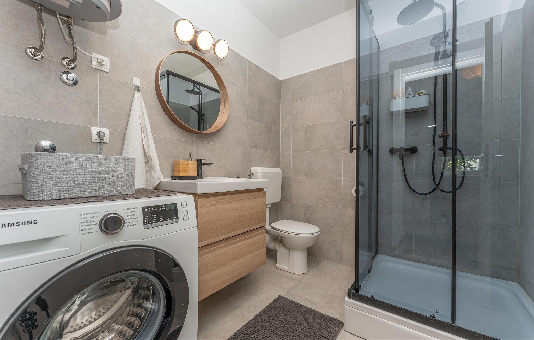 Im Außenbereich erwartet Sie eine großzügige Terrasse mit bequemen Sitzmöglichkeiten – ideal für gesellige Abende oder ruhige Momente bei einem Glas kroatischen Weins. Genießen Sie den Ausblick auf die Umgebung und die sanfte Brise vom Meer. Nutzen Sie den Gemeinschaftsgrill, um ein köstliches Barbecue unter freiem Himmel zu zaubern.