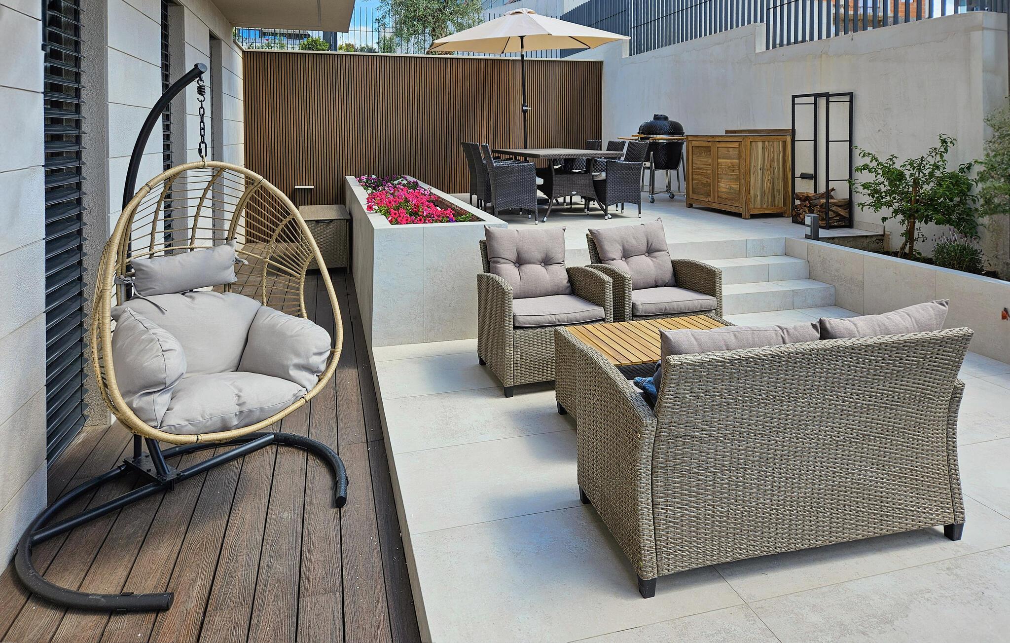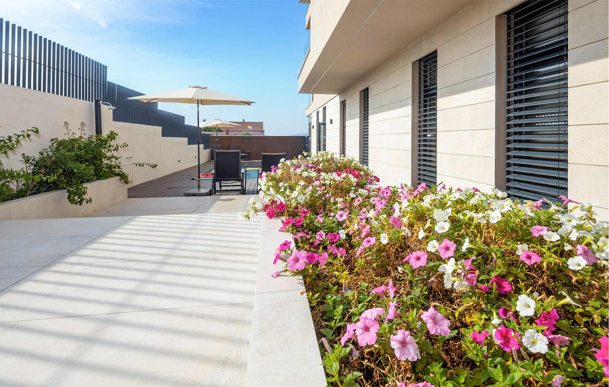 Neben Sonnenbäder auf Ihrem privaten Balkon können Sie auch im Gemeinschaftsgarten mit Pool und Terrasse zusammenkommen. Erfrischen Sie sich im Pool und lesen auf den Sonnenliegen ein Buch.