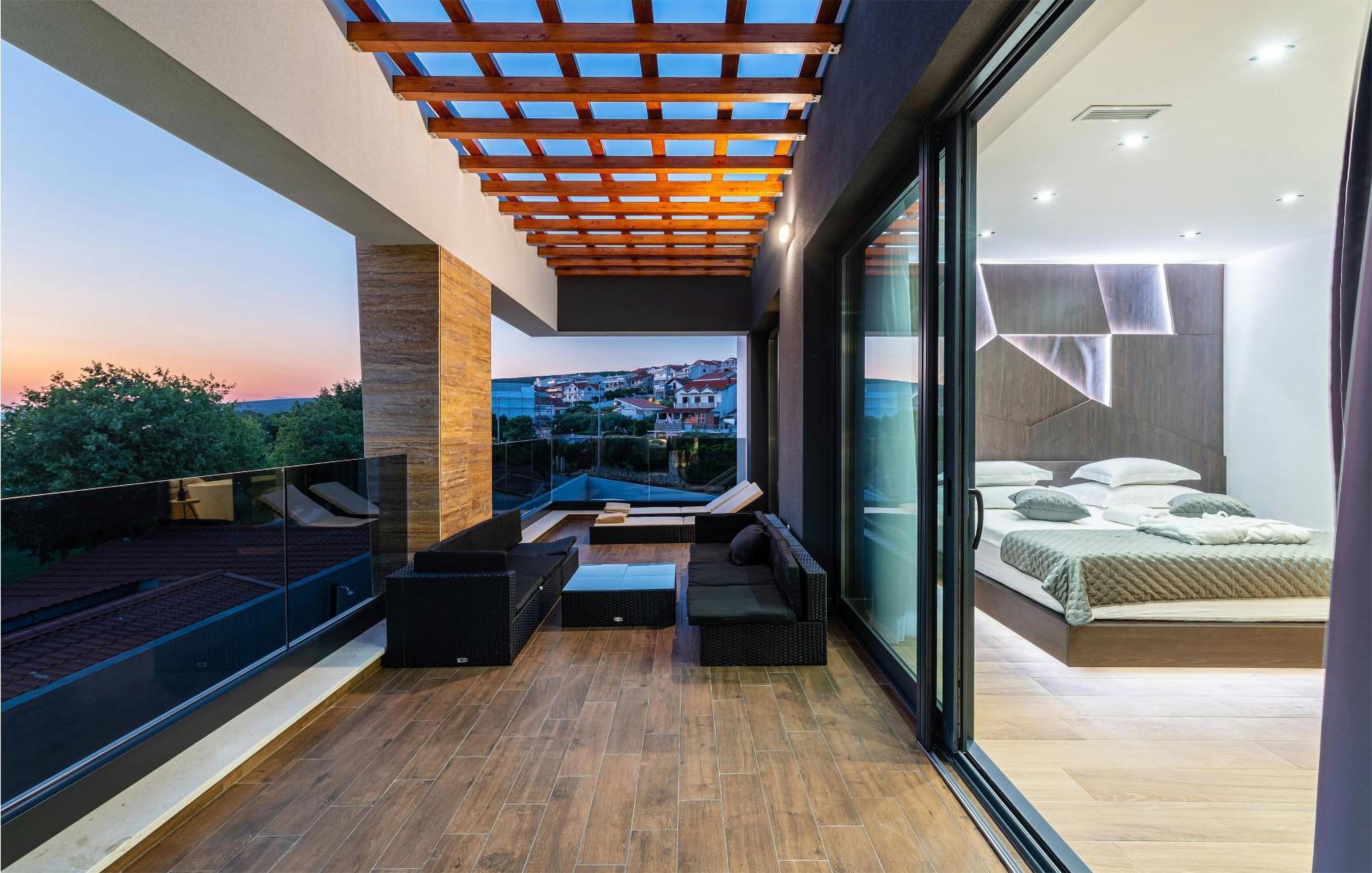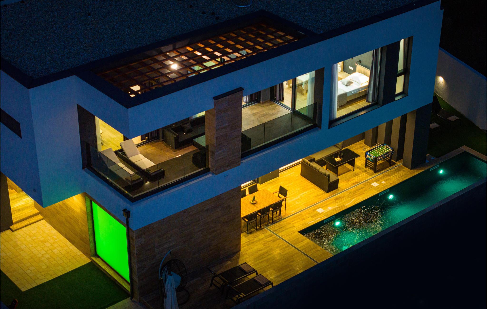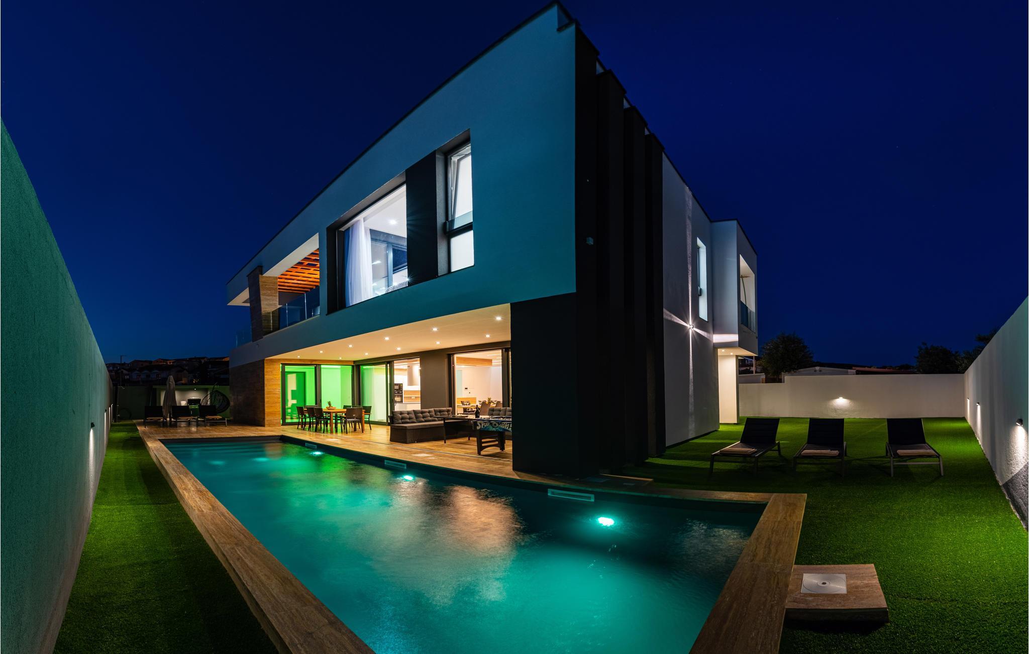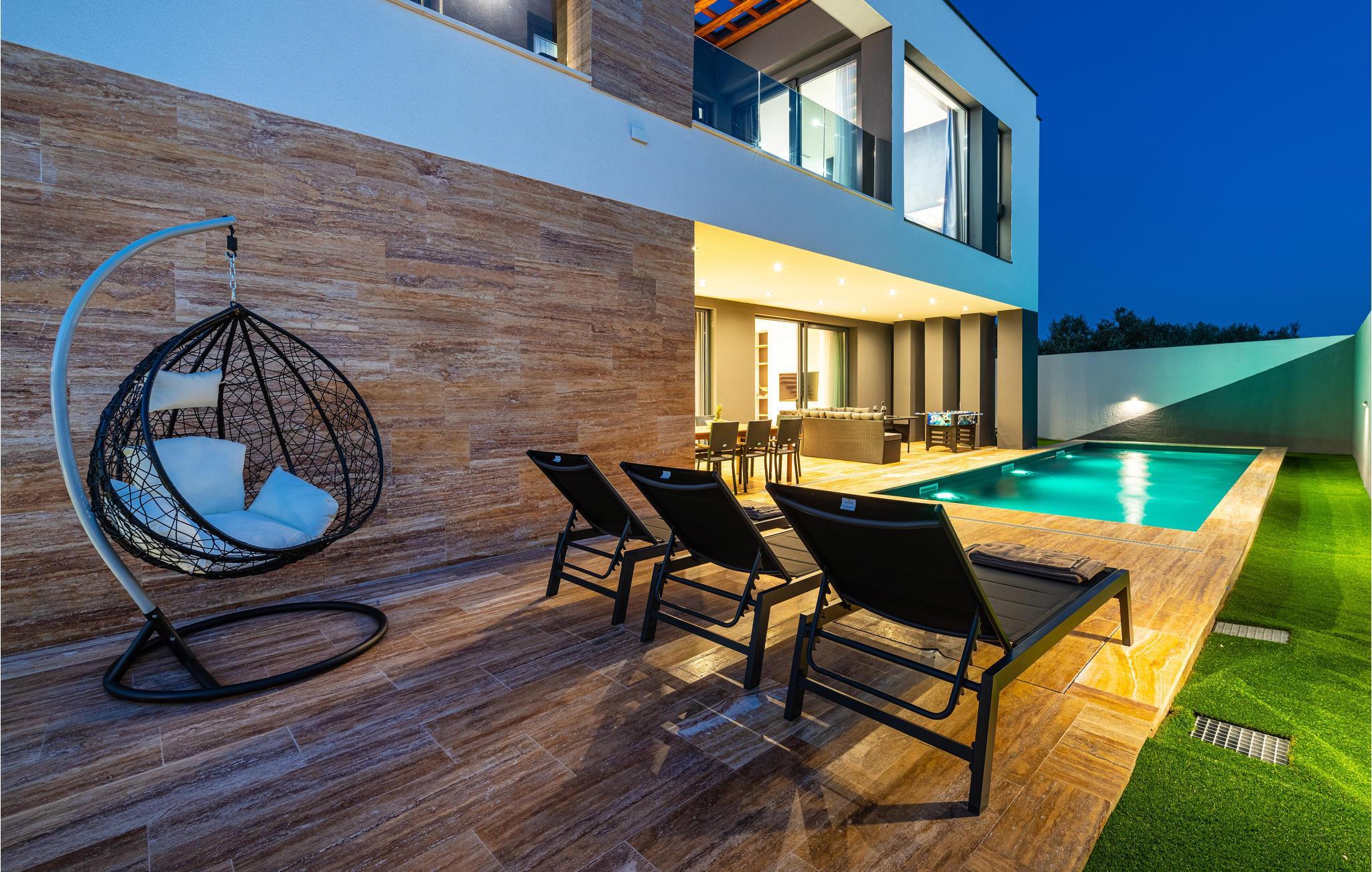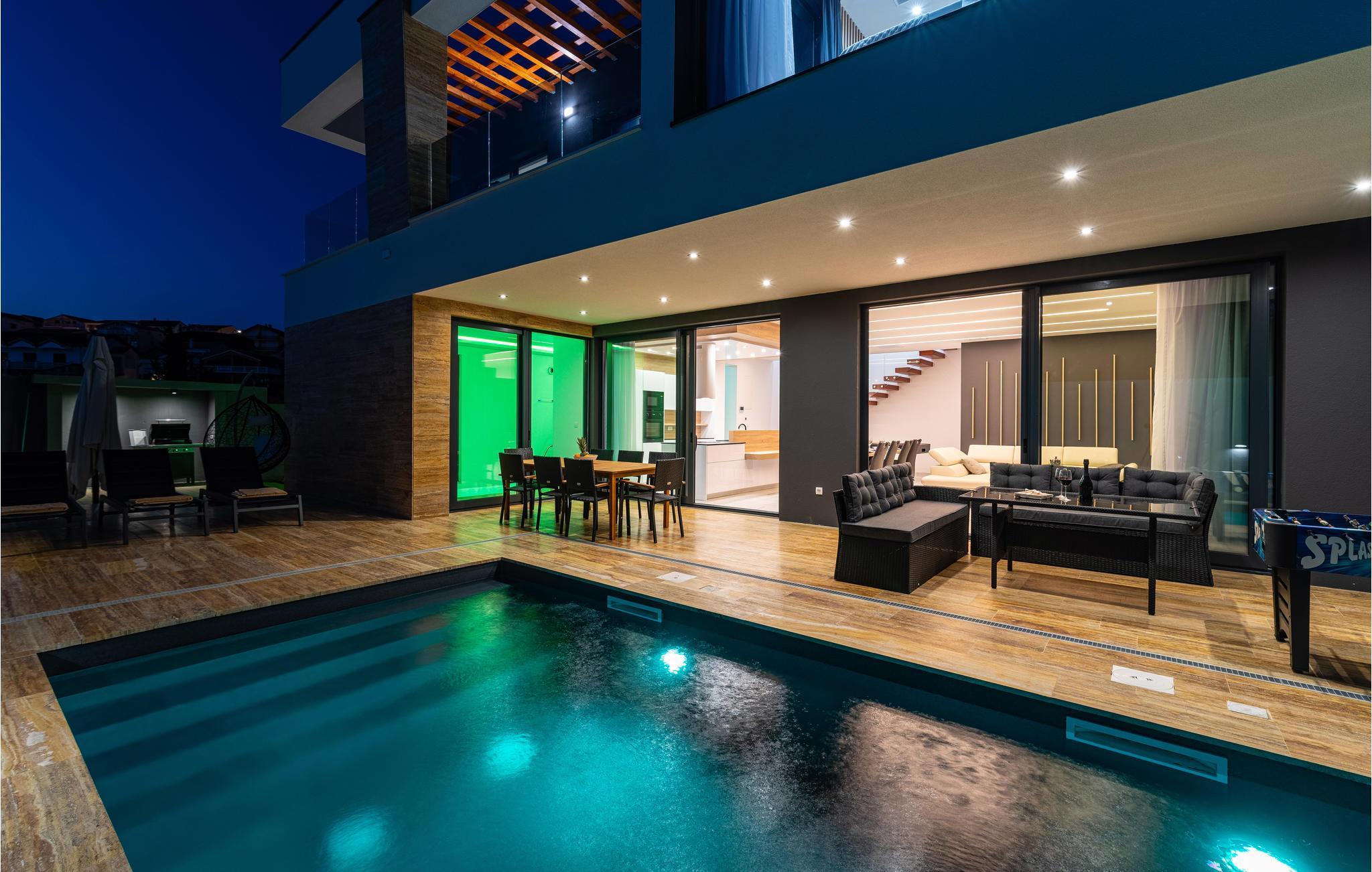 Dieses moderne und fantastische Ferienhaus wird Ihnen einen unvergesslichen Urlaub bereiten. Verbringen Sie gemeinsam mit Ihrer Großfamilie oder befreundeten Paaren einen sehr schönen Urlaub in diesem Haus, das Ihnen fast alles bietet, was Sie sich nur erträumen können. Auf zwei Etagen finden Sie Luxus, hochwertige Möbel und bestens ausgestattete Räume. Fühlen Sie sich wie zuhause und genießen die Annehmlichkeiten, wie einen innenliegenden Pool, Kaminofen und eine große, moderne Küche, in der Sie neue Rezepte kochen können. Entdecken Sie auch den Balkon und die Terrasse, sowie den Garten. Nicht nur der Blick auf das Meer wird Sie verzücken, sondern auch die Terrasse mit Grill und der einladende Pool im Freien.