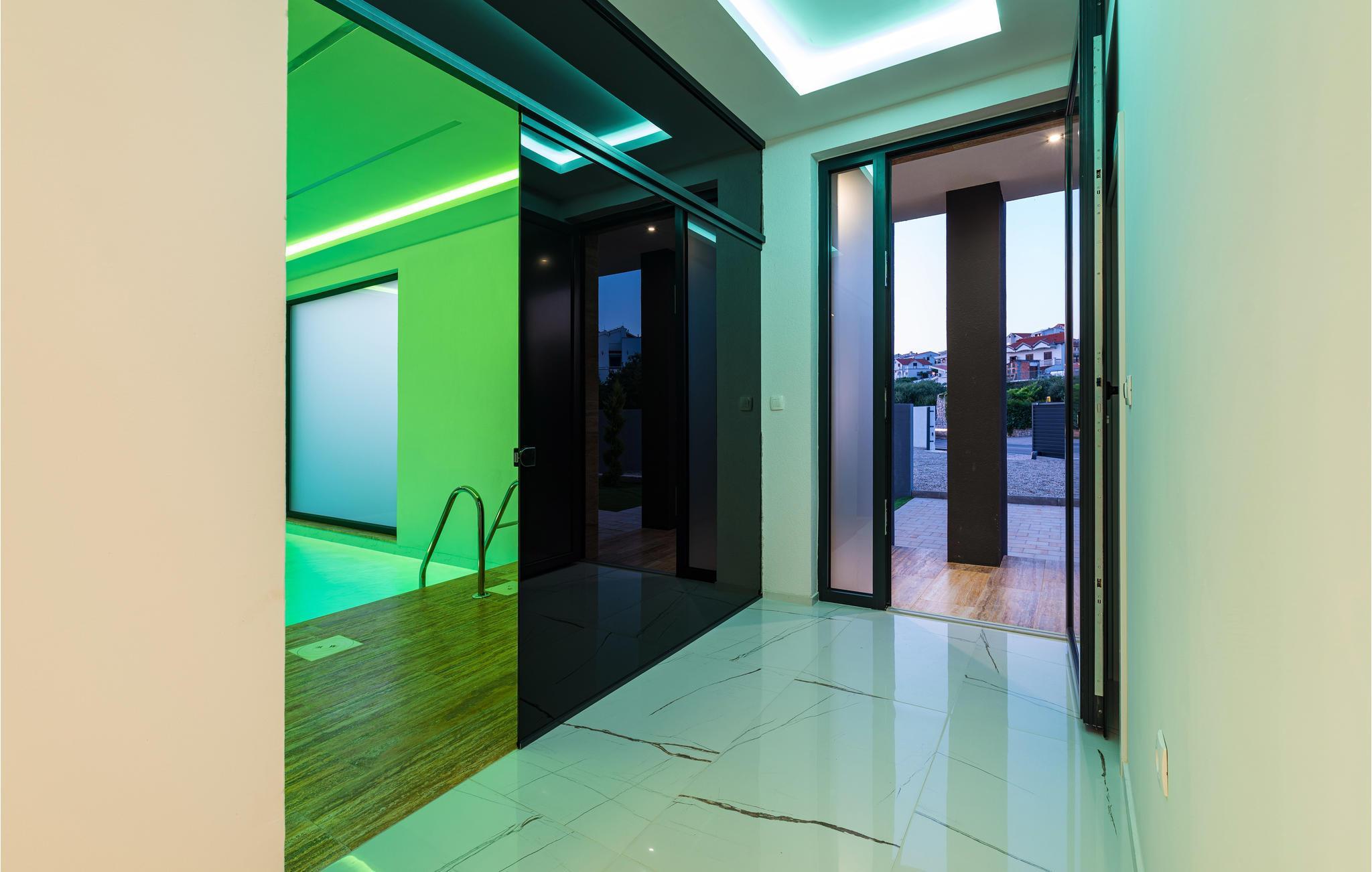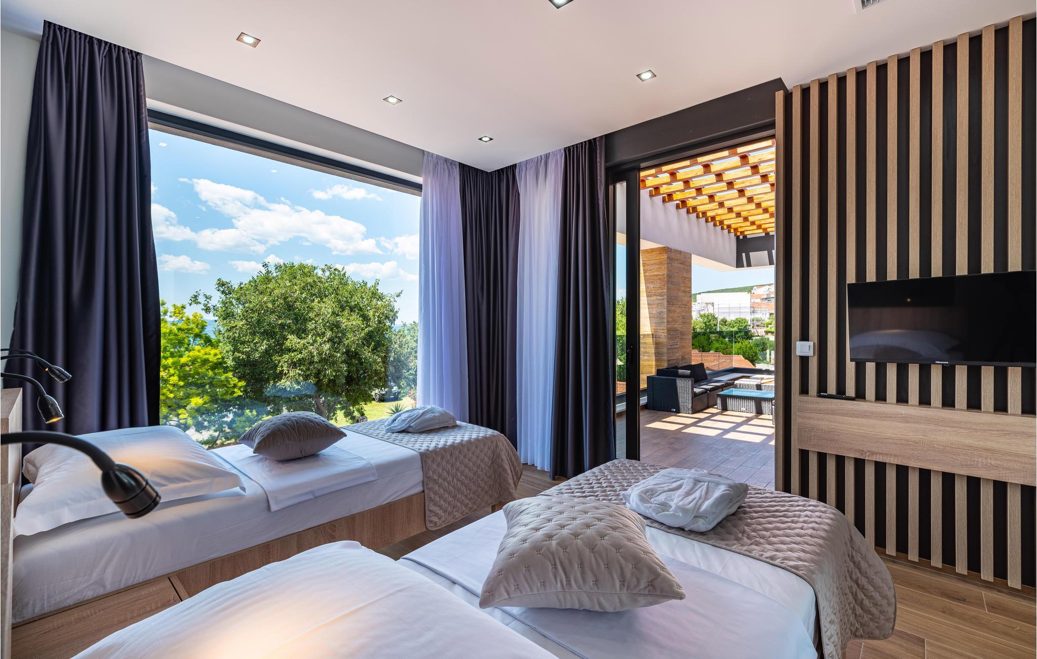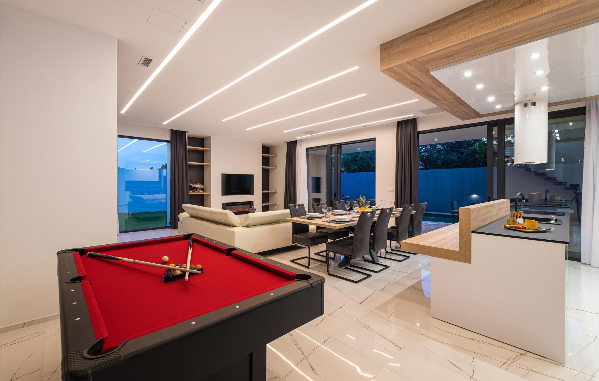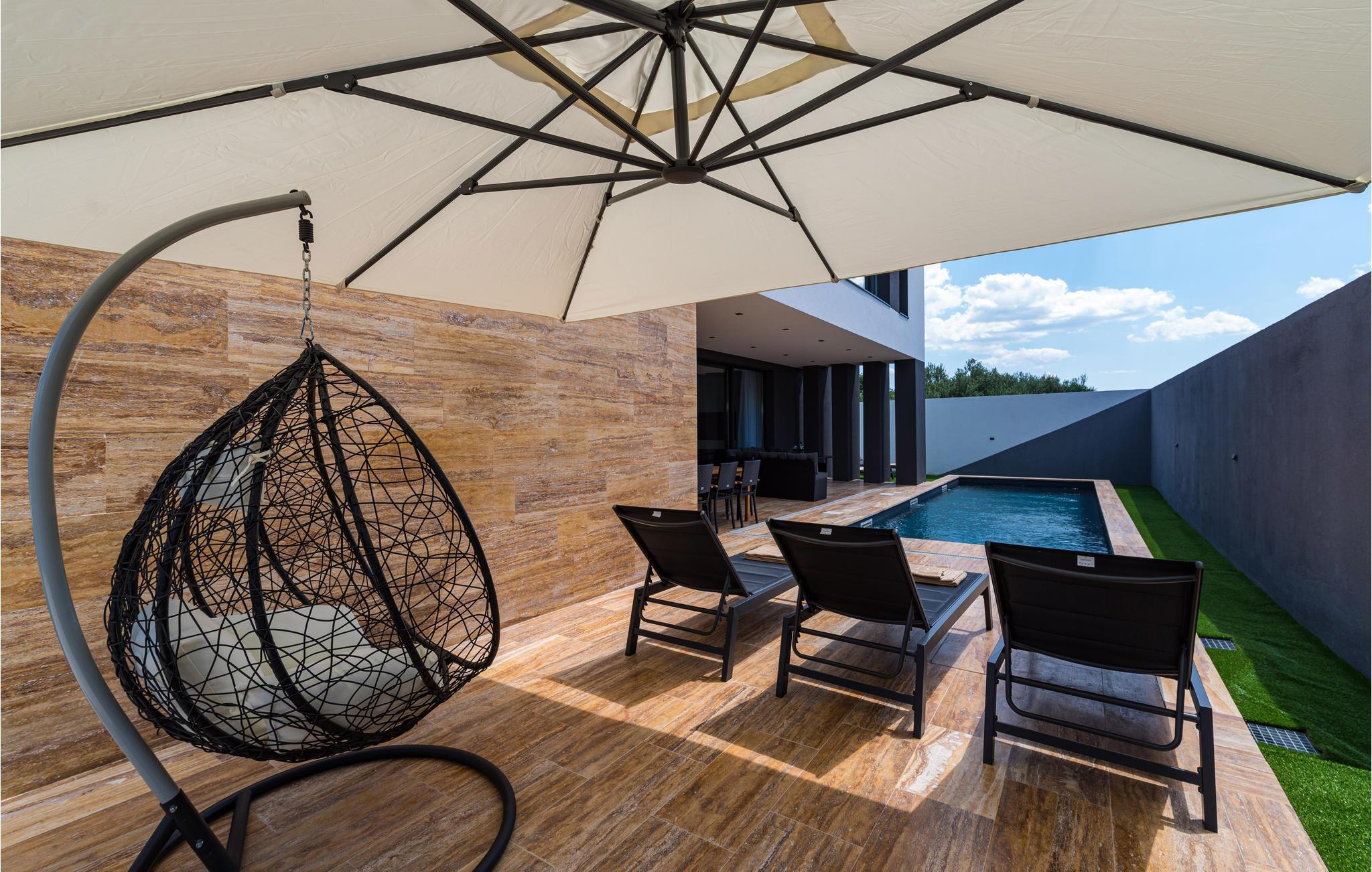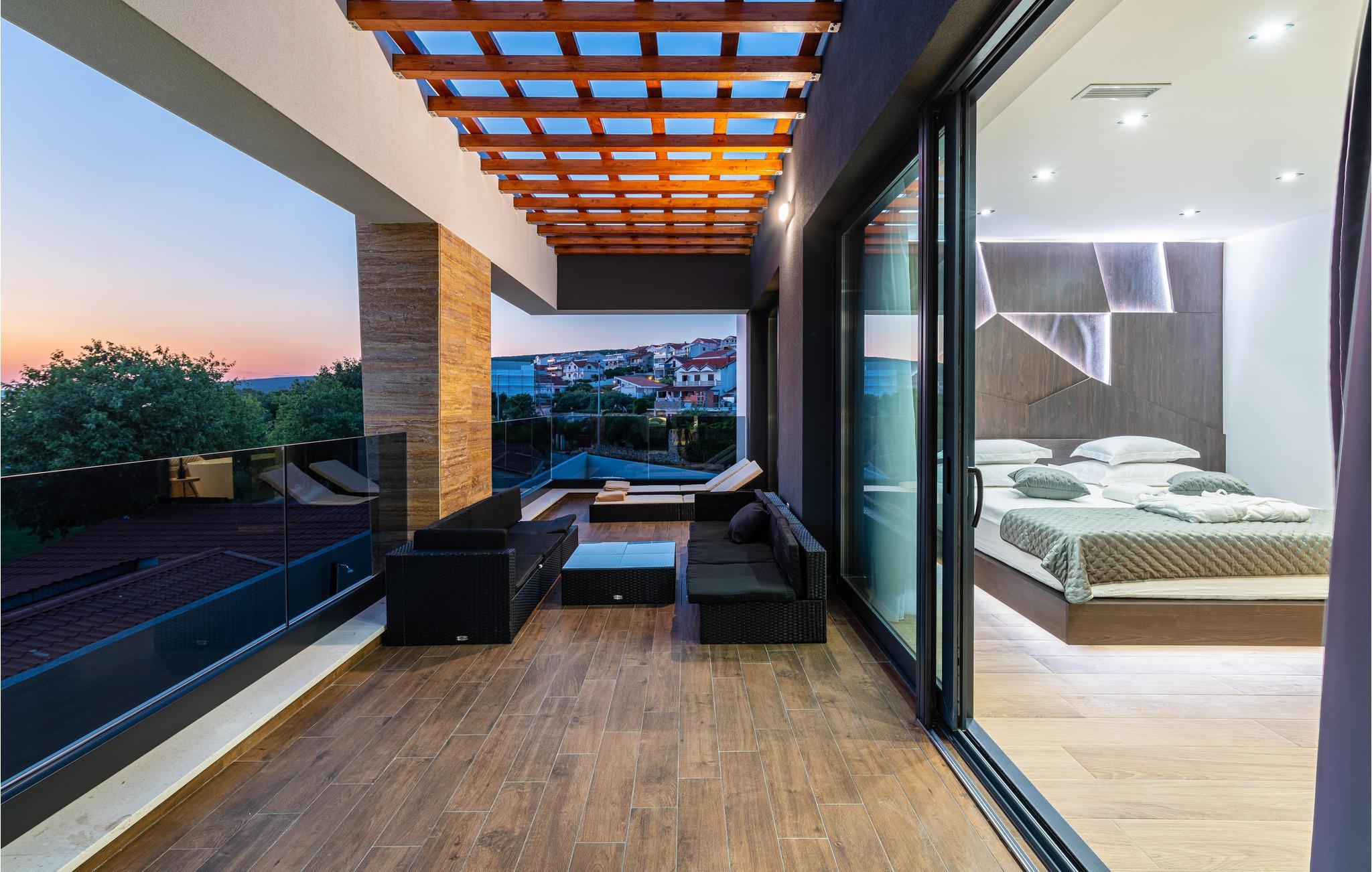 Dieses moderne und fantastische Ferienhaus wird Ihnen einen unvergesslichen Urlaub bereiten. Verbringen Sie gemeinsam mit Ihrer Großfamilie oder befreundeten Paaren einen sehr schönen Urlaub in diesem Haus, das Ihnen fast alles bietet, was Sie sich nur erträumen können. Auf zwei Etagen finden Sie Luxus, hochwertige Möbel und bestens ausgestattete Räume. Fühlen Sie sich wie zuhause und genießen die Annehmlichkeiten, wie einen innenliegenden Pool, Kaminofen und eine große, moderne Küche, in der Sie neue Rezepte kochen können. Entdecken Sie auch den Balkon und die Terrasse, sowie den Garten. Nicht nur der Blick auf das Meer wird Sie verzücken, sondern auch die Terrasse mit Grill und der einladende Pool im Freien.