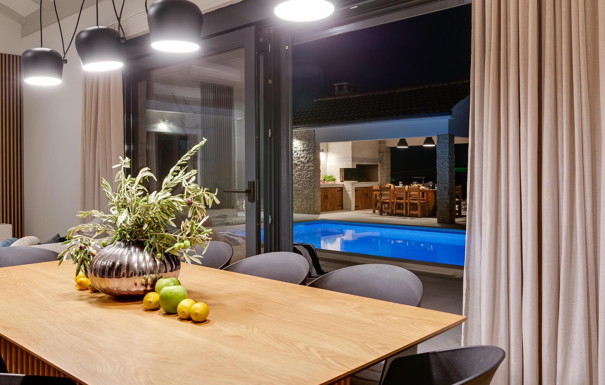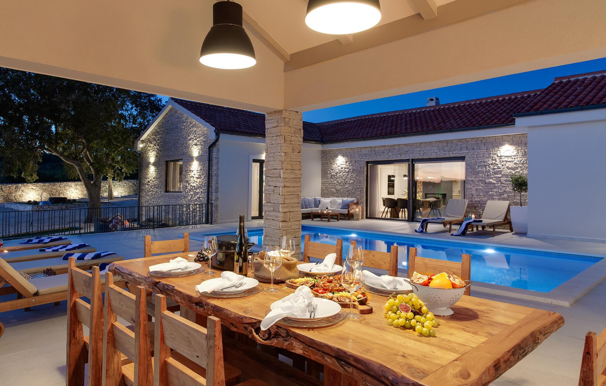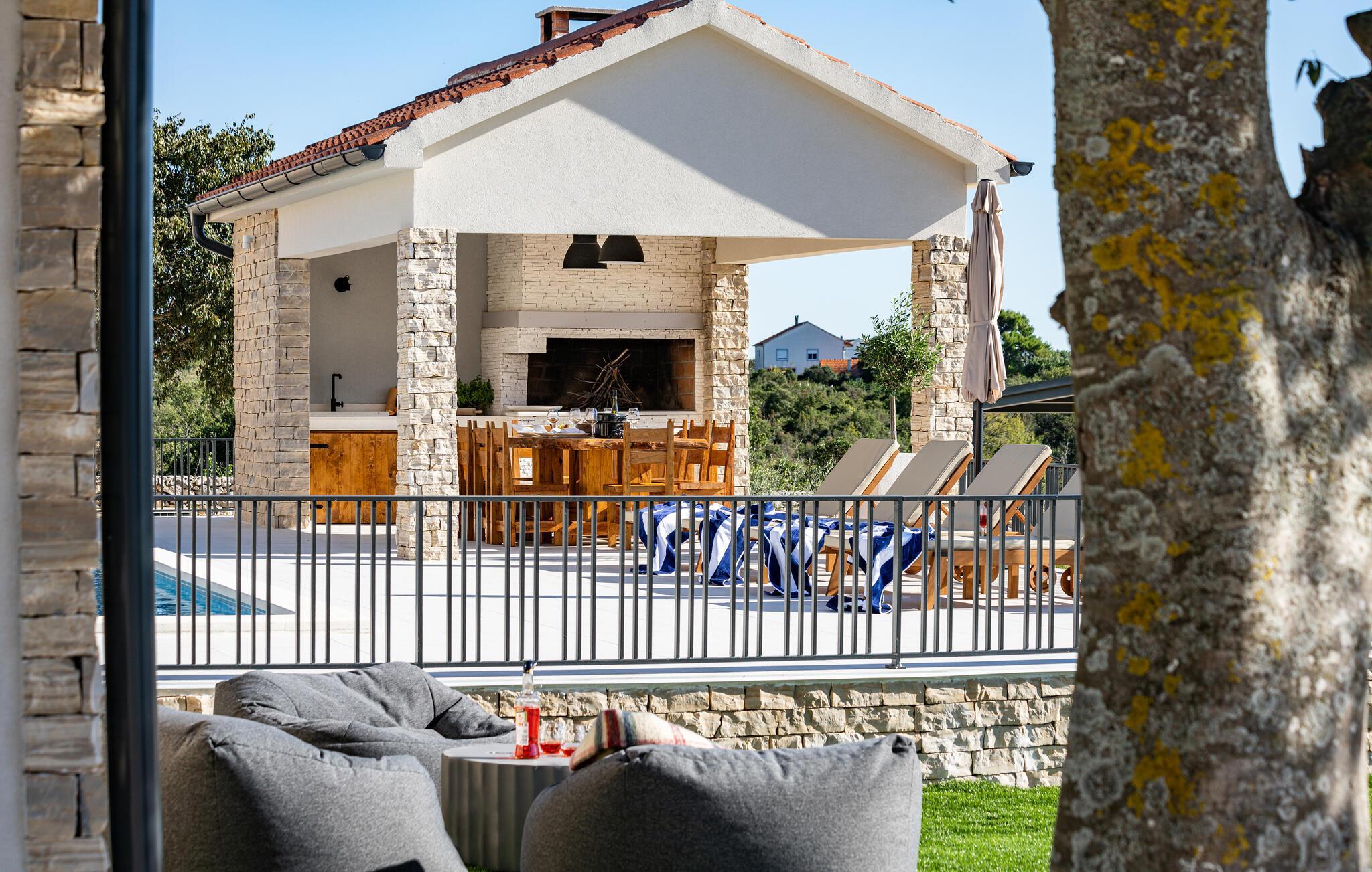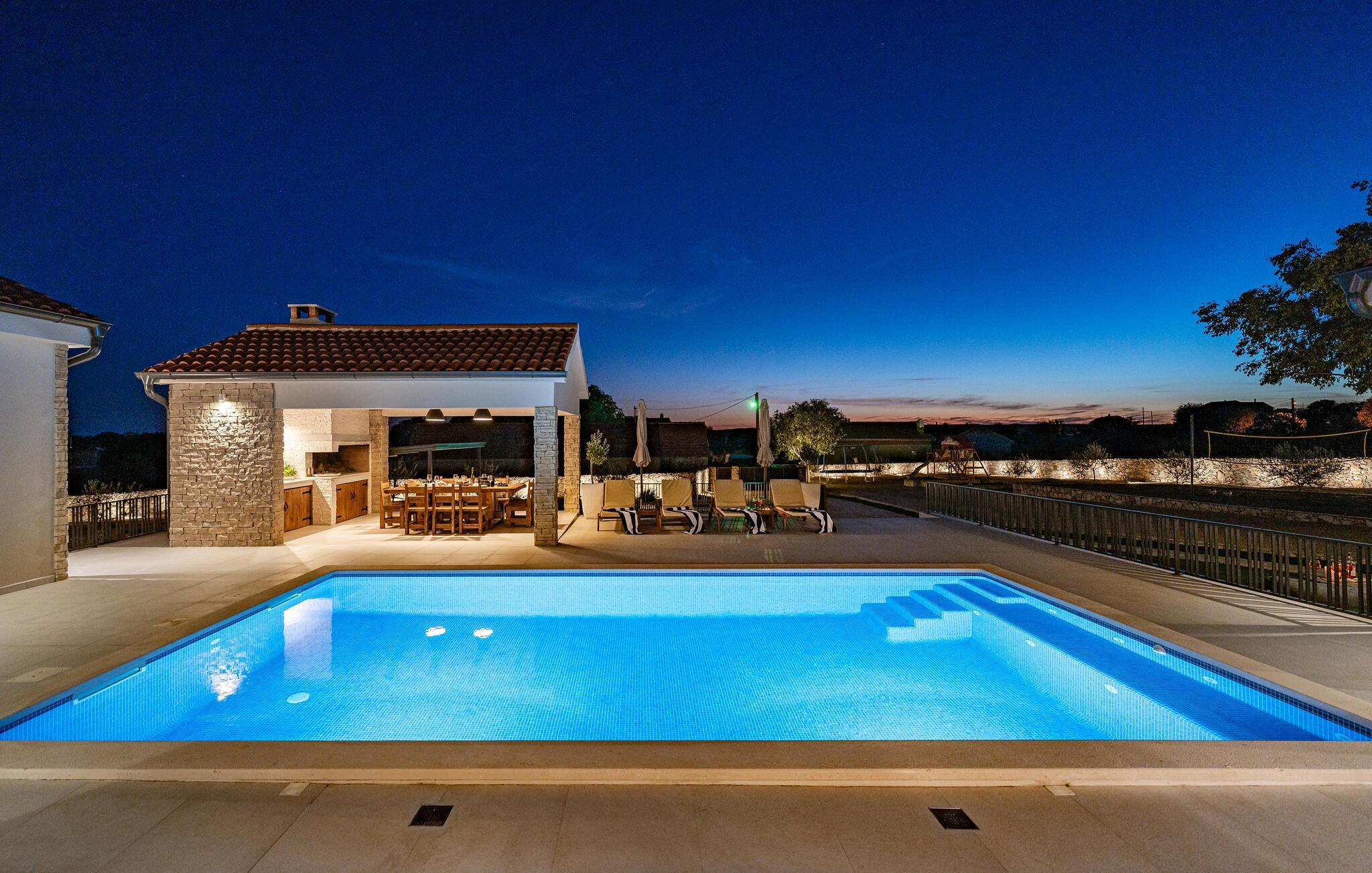 Im Außenbereich erwartet Sie eine großzügige Sonnenterrasse mit bequemen Liegen, komfortablen Loungemöbeln und einem herrlichen Pool, der abends stimmungsvoll beleuchtet werden kann. Genießen Sie pure Erholung unter der kroatischen Sonne und gesellige Grillabende, während die Kinder unbeschwert auf dem Spielplatz toben können.