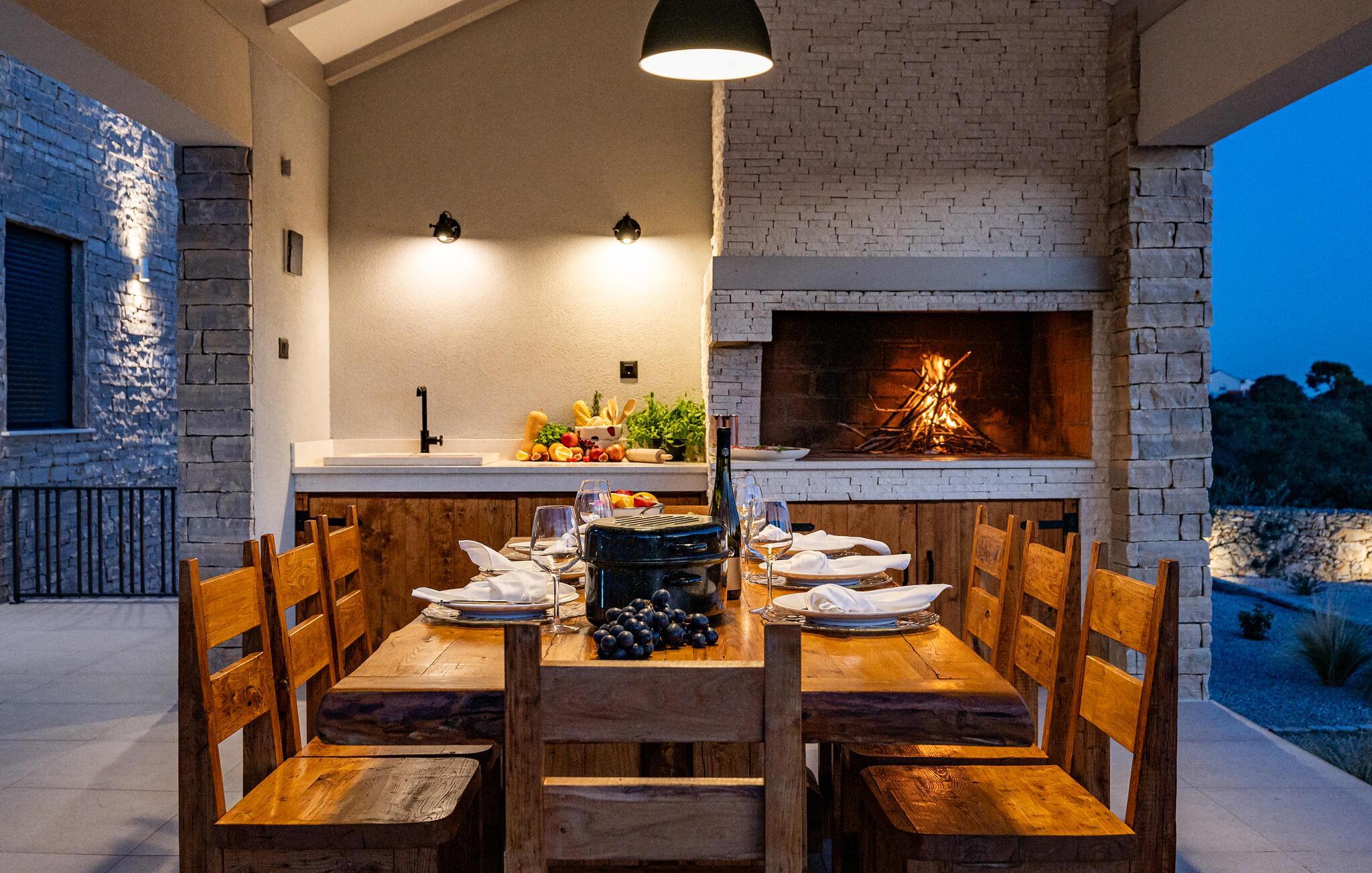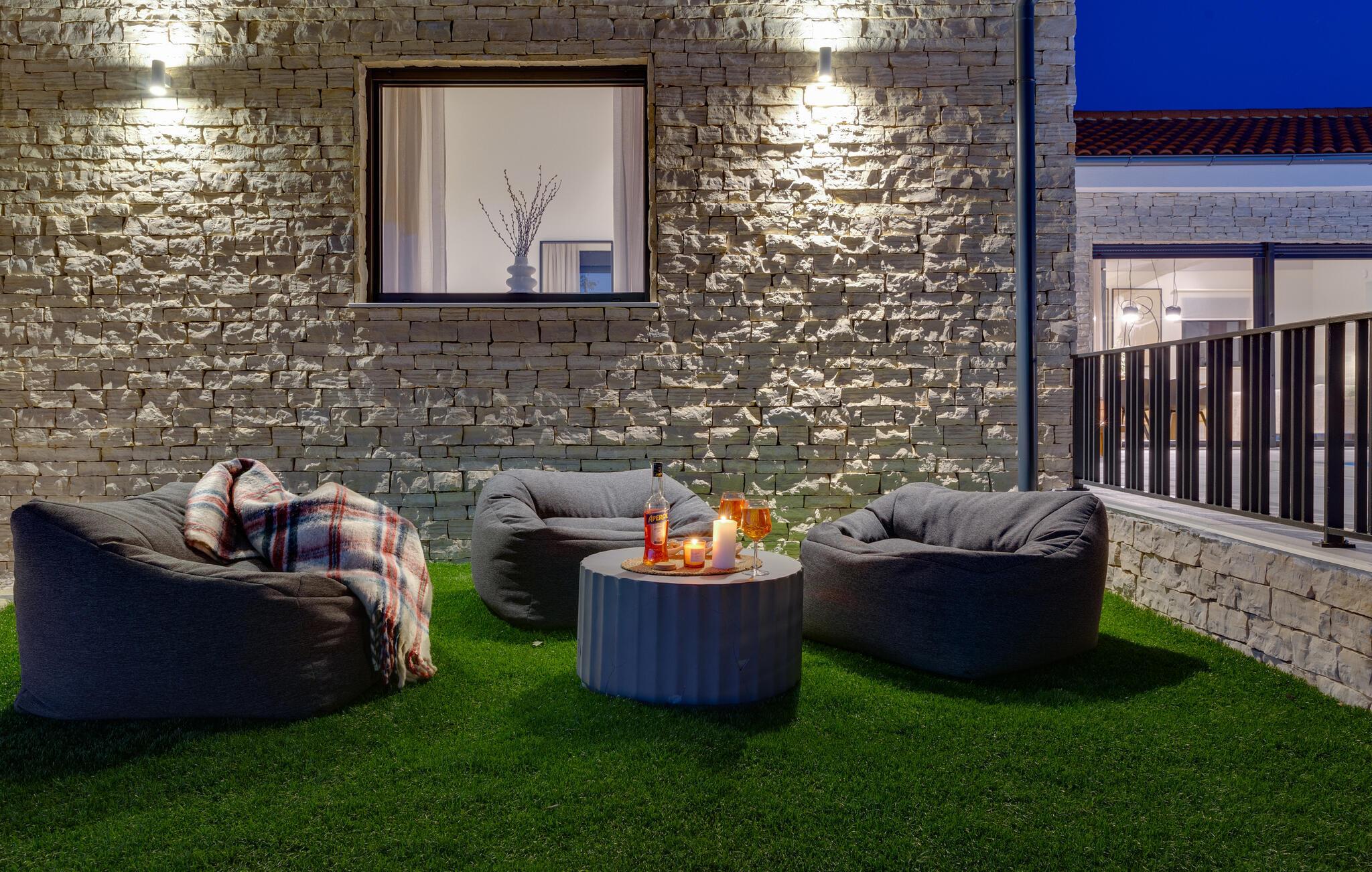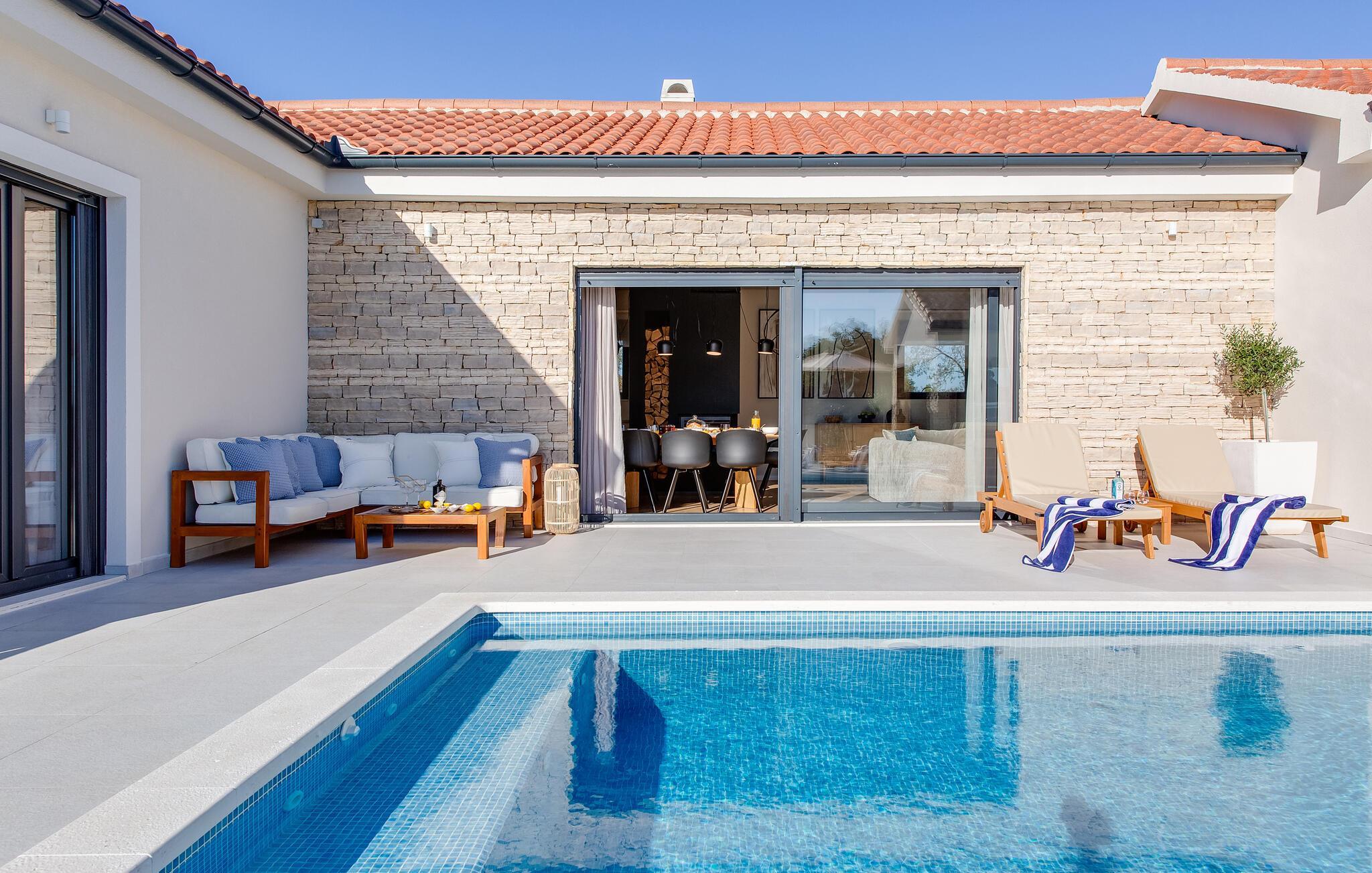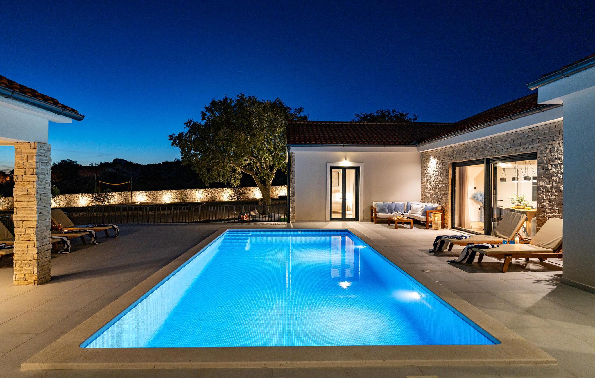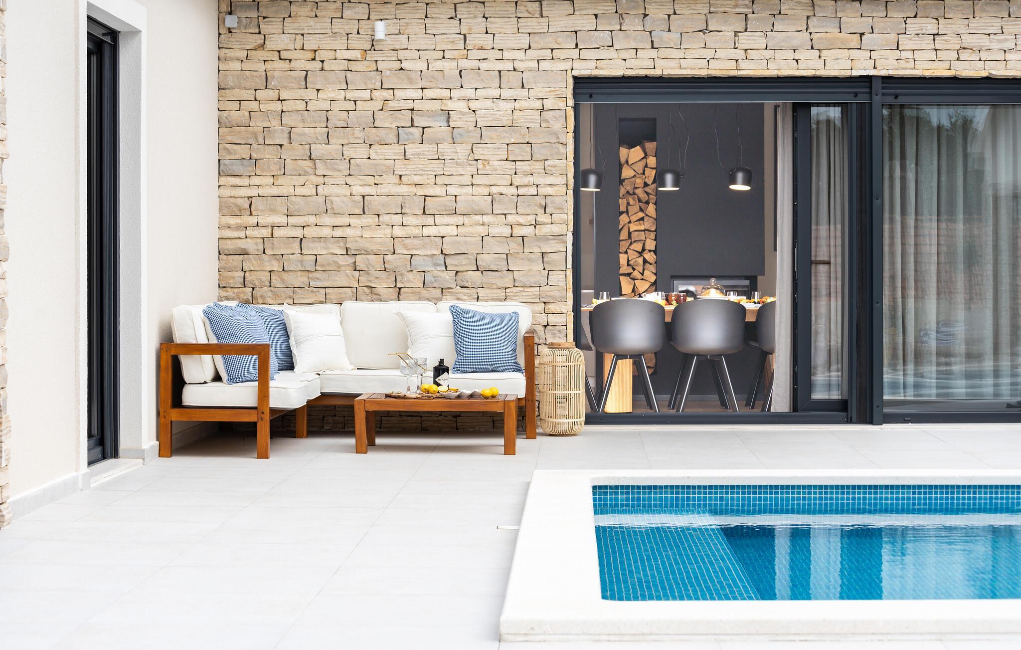 Im Außenbereich erwartet Sie eine großzügige Sonnenterrasse mit bequemen Liegen, komfortablen Loungemöbeln und einem herrlichen Pool, der abends stimmungsvoll beleuchtet werden kann. Genießen Sie pure Erholung unter der kroatischen Sonne und gesellige Grillabende, während die Kinder unbeschwert auf dem Spielplatz toben können.