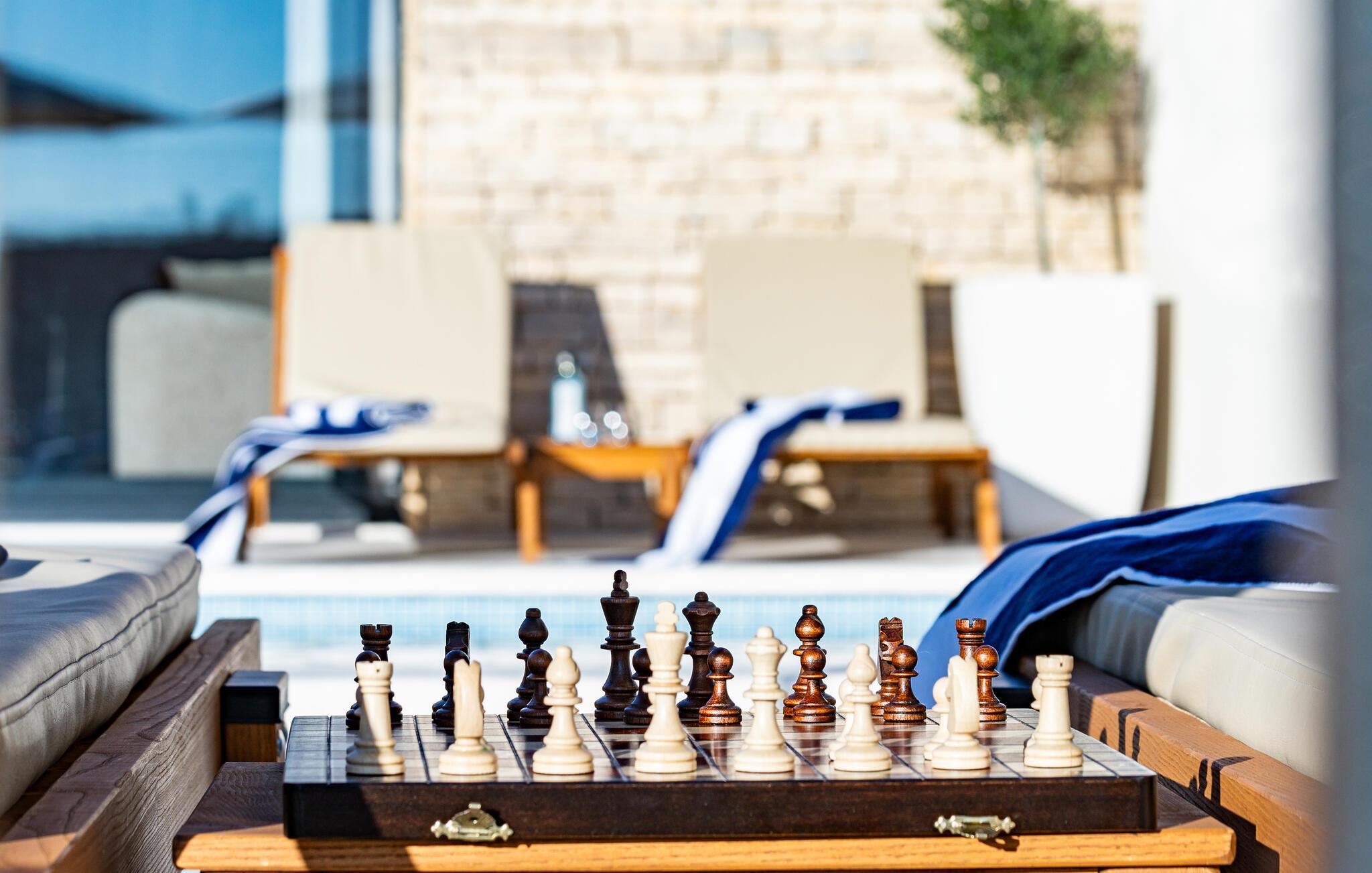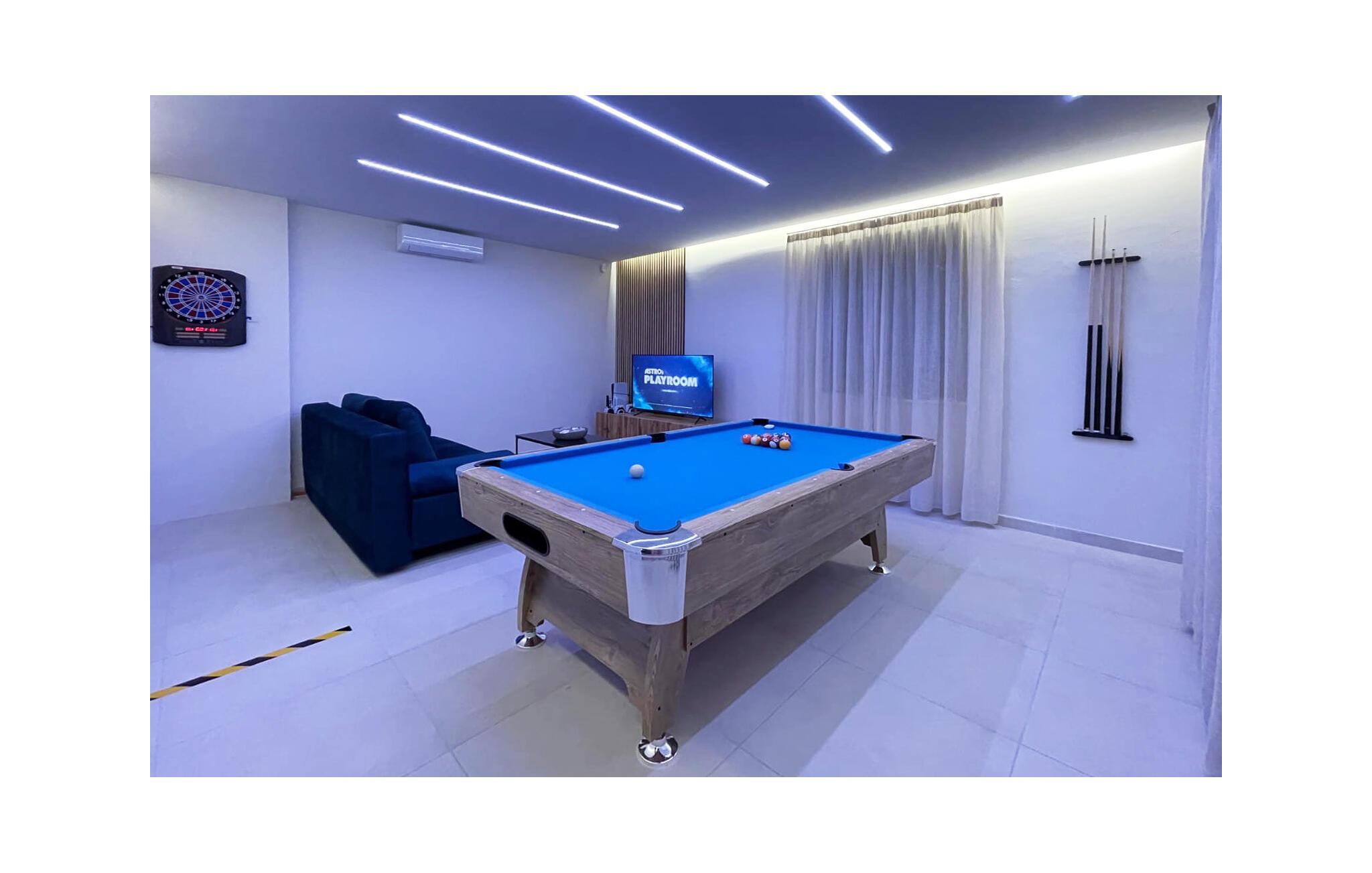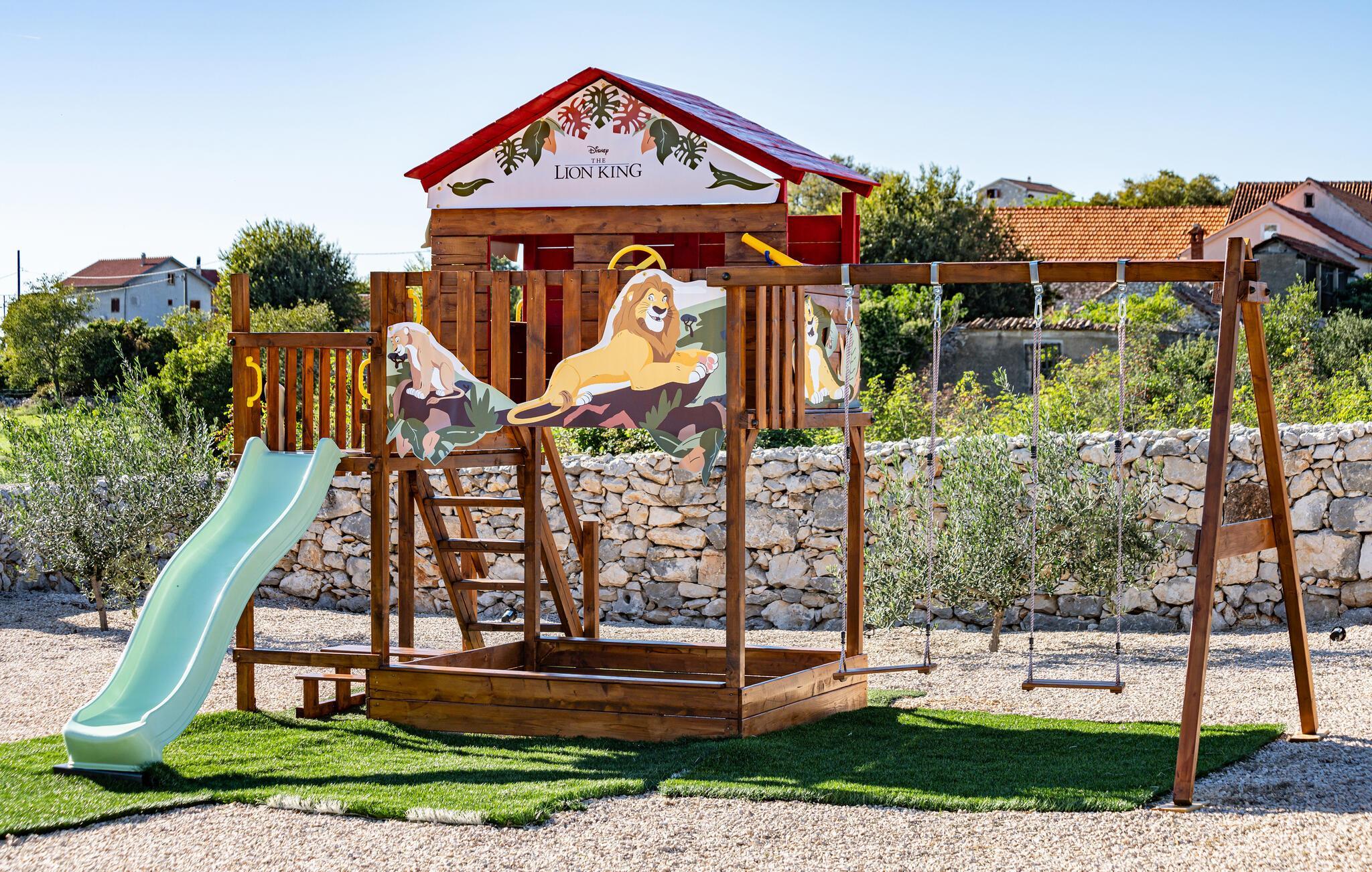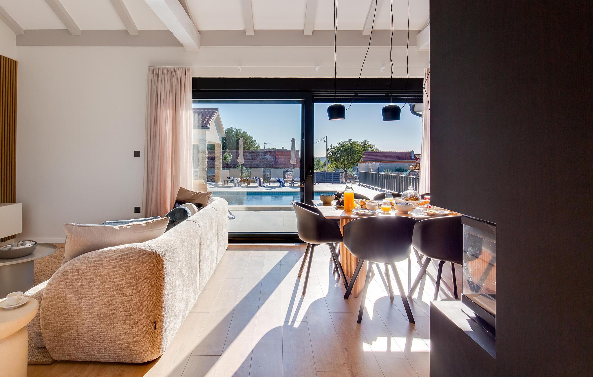 Im Außenbereich erwartet Sie eine großzügige Sonnenterrasse mit bequemen Liegen, komfortablen Loungemöbeln und einem herrlichen Pool, der abends stimmungsvoll beleuchtet werden kann. Genießen Sie pure Erholung unter der kroatischen Sonne und gesellige Grillabende, während die Kinder unbeschwert auf dem Spielplatz toben können.