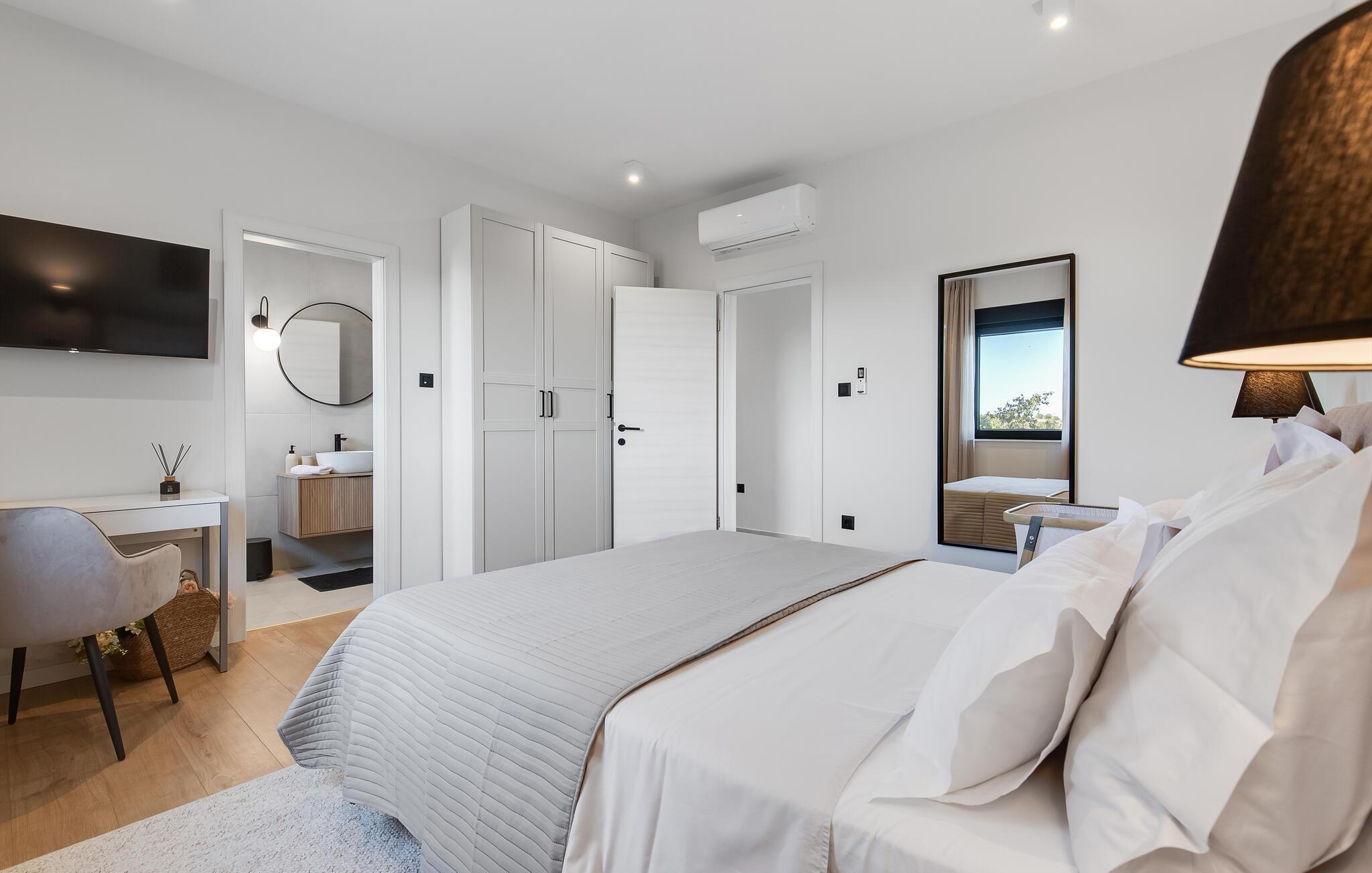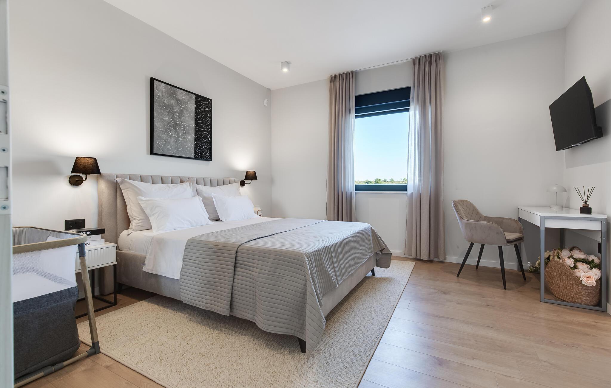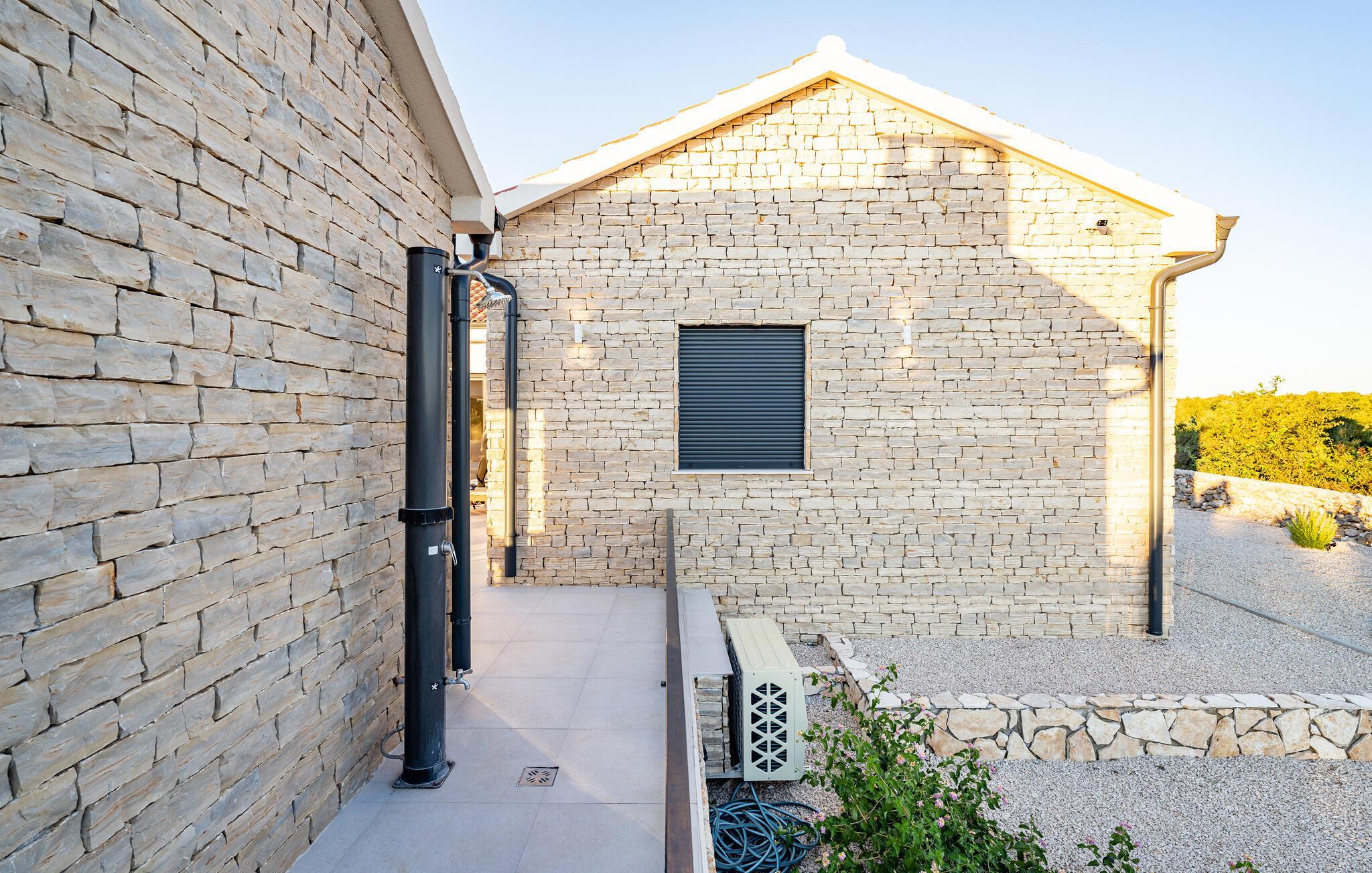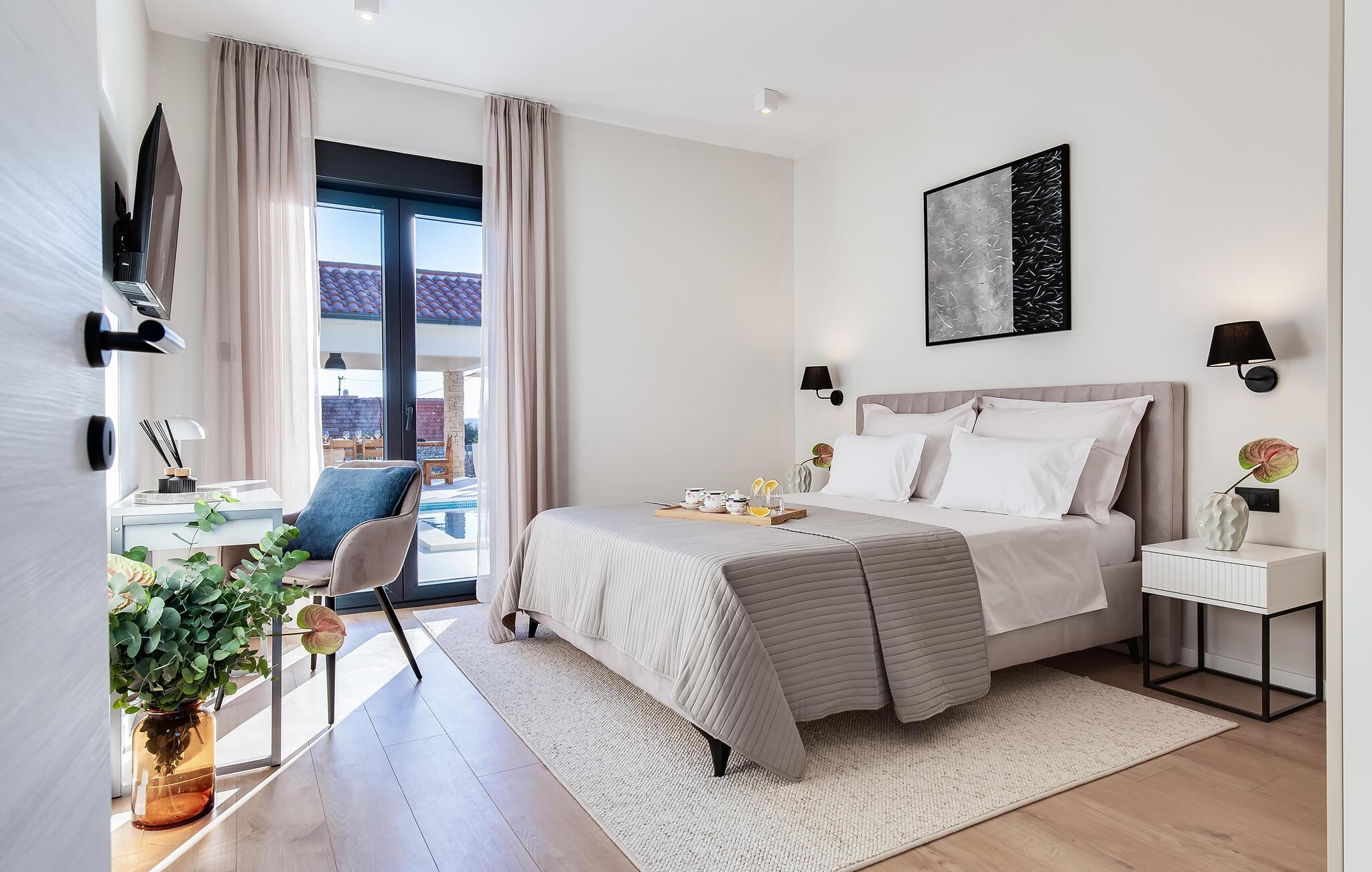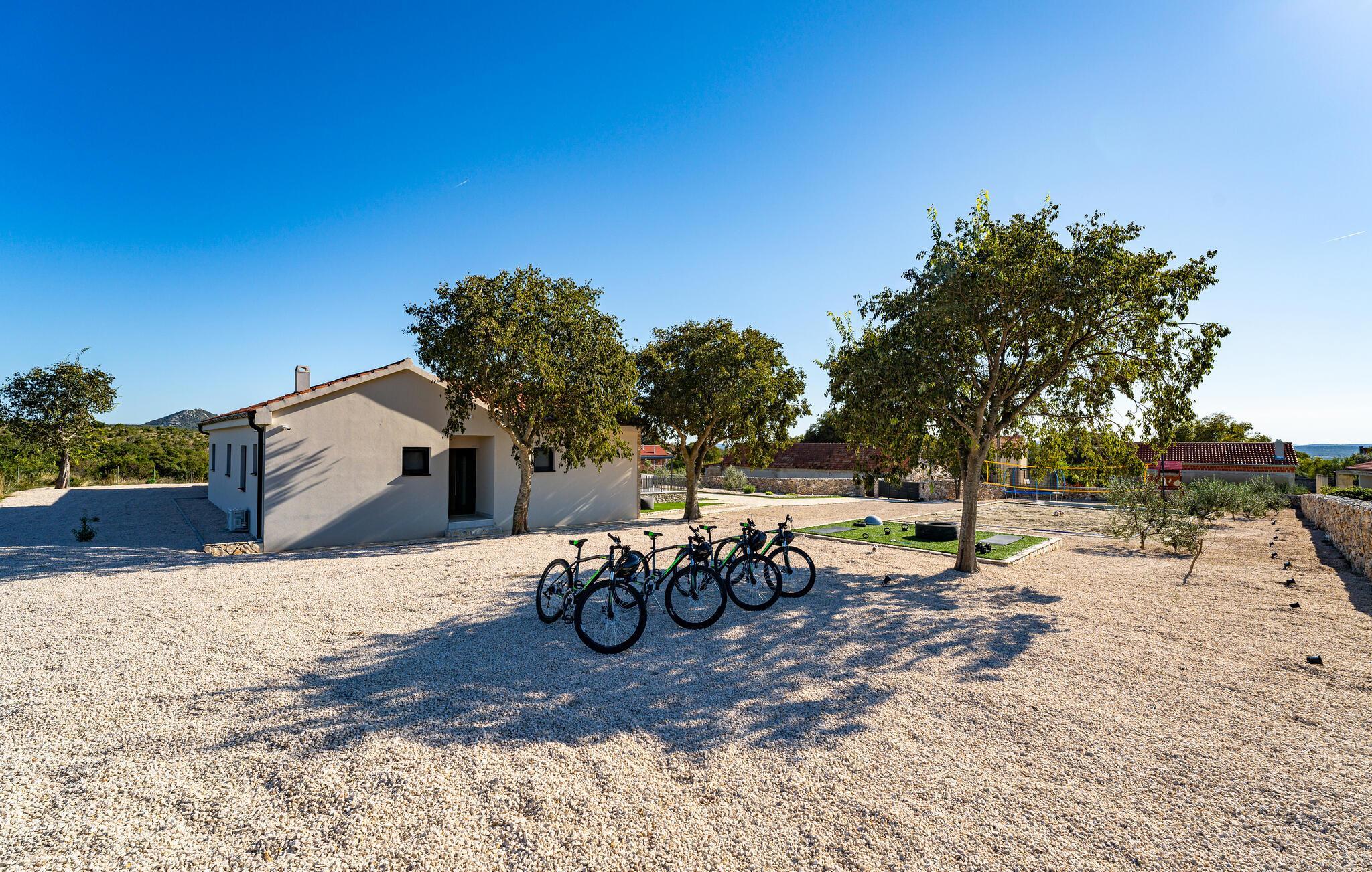 Im Außenbereich erwartet Sie eine großzügige Sonnenterrasse mit bequemen Liegen, komfortablen Loungemöbeln und einem herrlichen Pool, der abends stimmungsvoll beleuchtet werden kann. Genießen Sie pure Erholung unter der kroatischen Sonne und gesellige Grillabende, während die Kinder unbeschwert auf dem Spielplatz toben können.