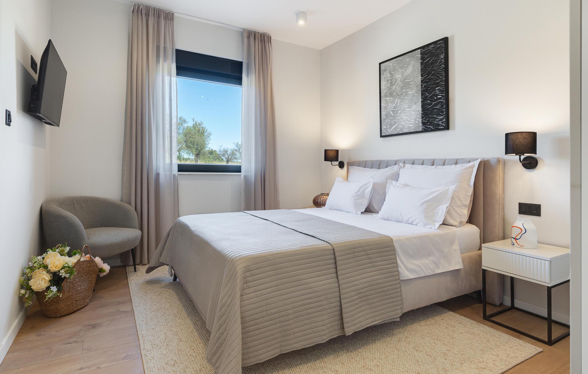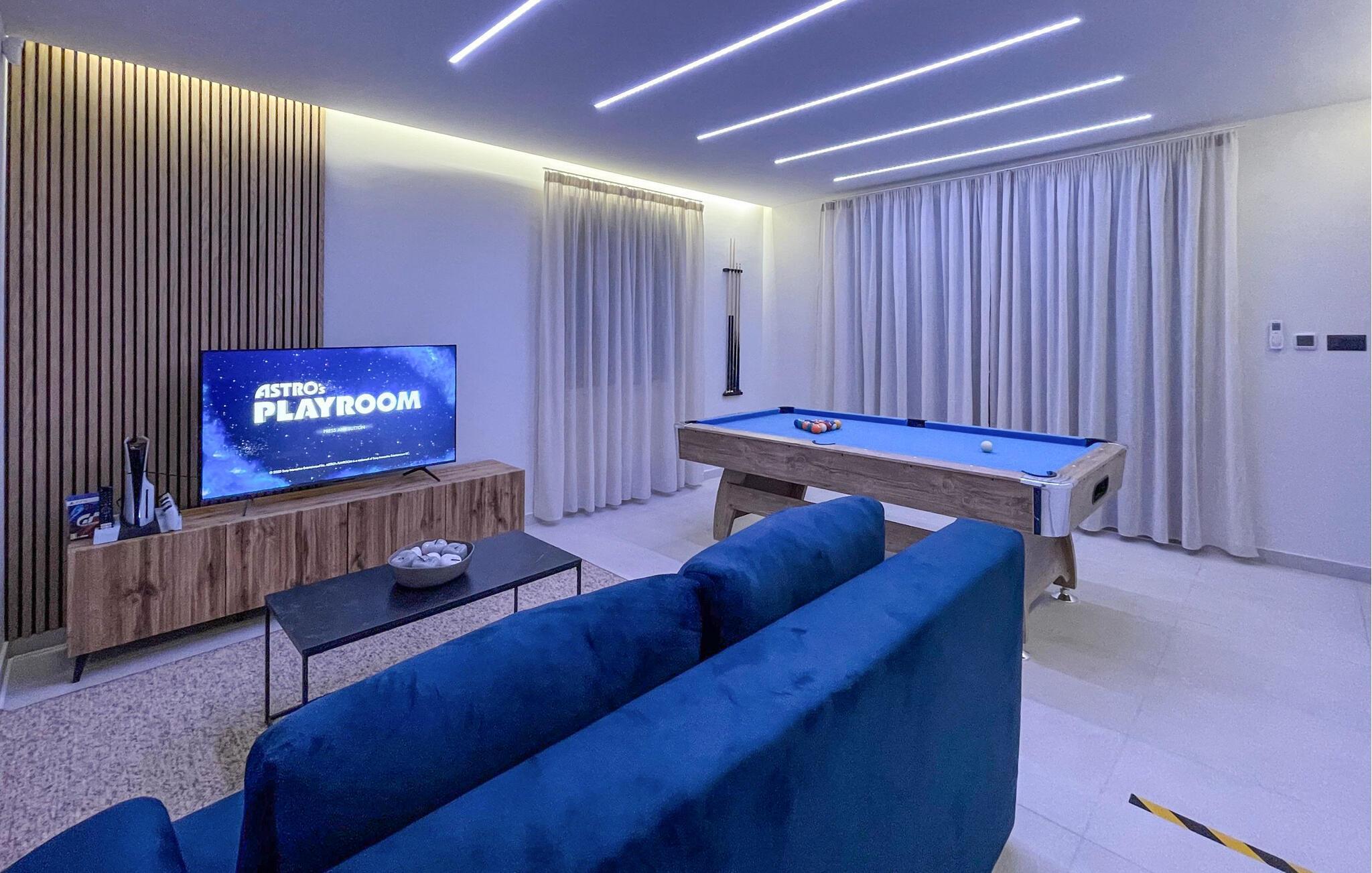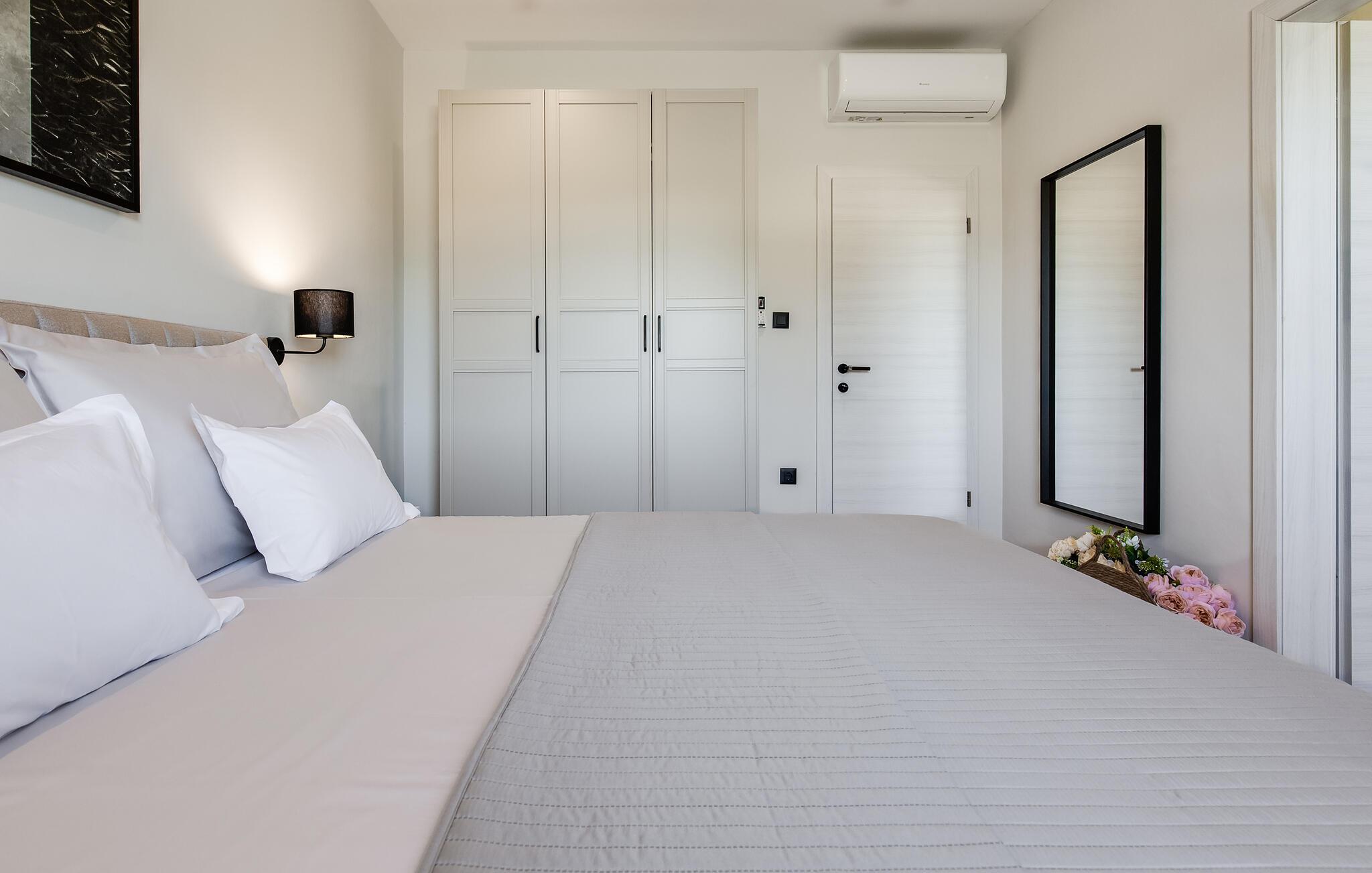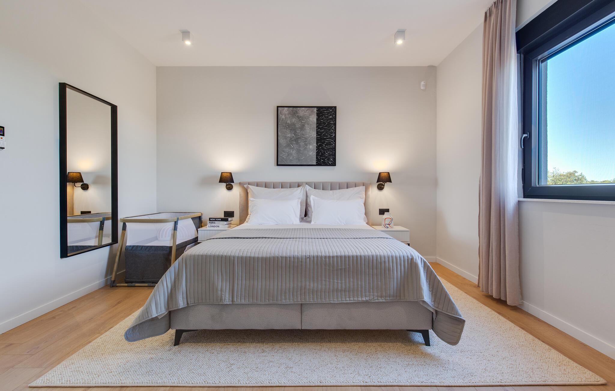 Im Außenbereich erwartet Sie eine großzügige Sonnenterrasse mit bequemen Liegen, komfortablen Loungemöbeln und einem herrlichen Pool, der abends stimmungsvoll beleuchtet werden kann. Genießen Sie pure Erholung unter der kroatischen Sonne und gesellige Grillabende, während die Kinder unbeschwert auf dem Spielplatz toben können.
