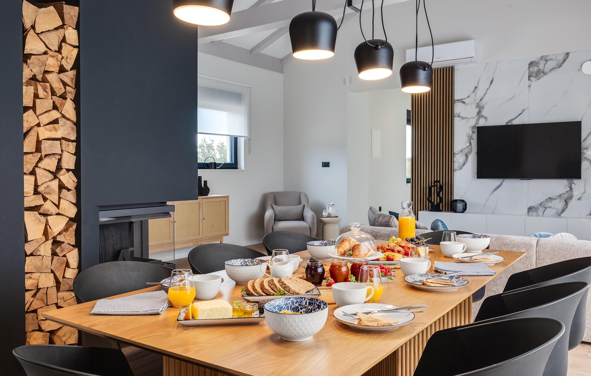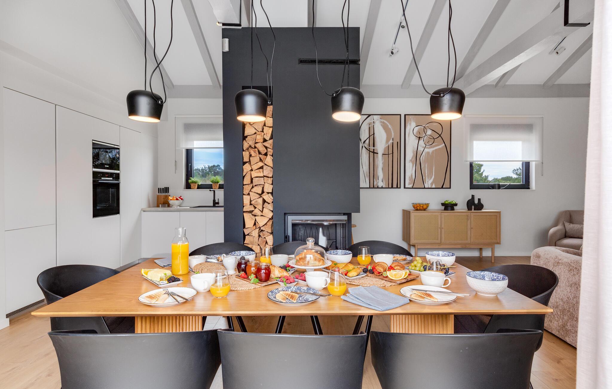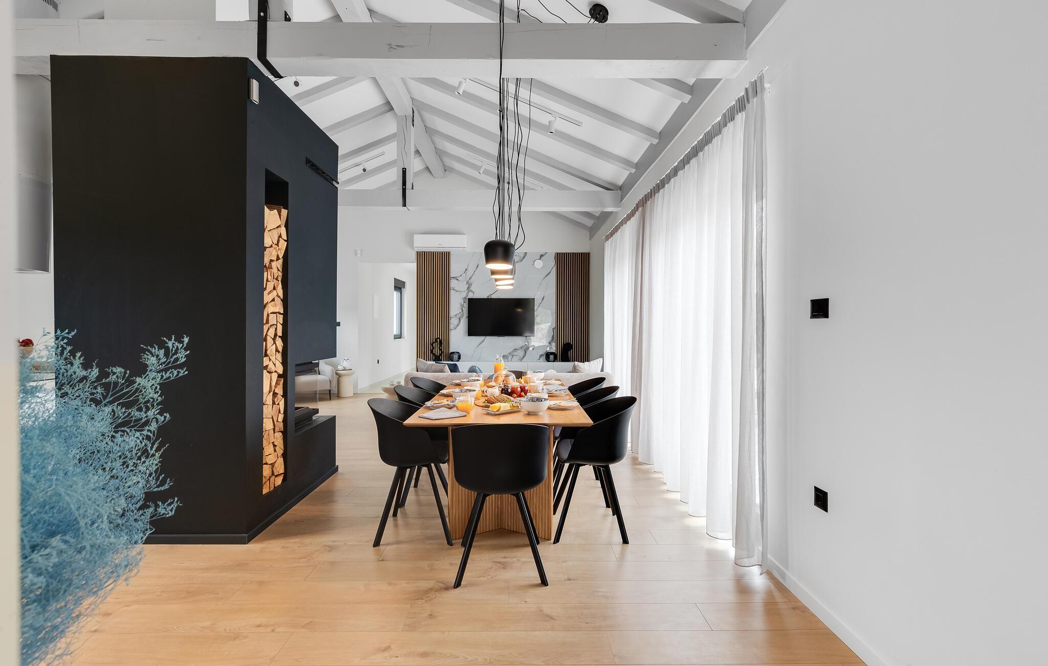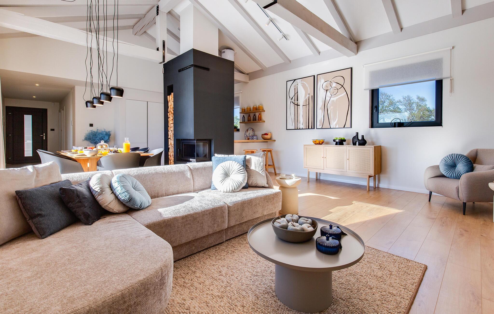Der stilvolle Wohnbereich besticht durch eine geschmackvolle Einrichtung und großzügige Fensterfronten, die den Raum mit Tageslicht durchfluten. Abends sorgen der eindrucksvolle Designer-Kamin und die durchdachte Beleuchtung für ein ausgesprochen behagliches Ambiente. Gemütliche Sofas und eine harmonische Farbgestaltung garantieren, dass Sie sich vom ersten Urlaubstag an rundum wohlfühlen.