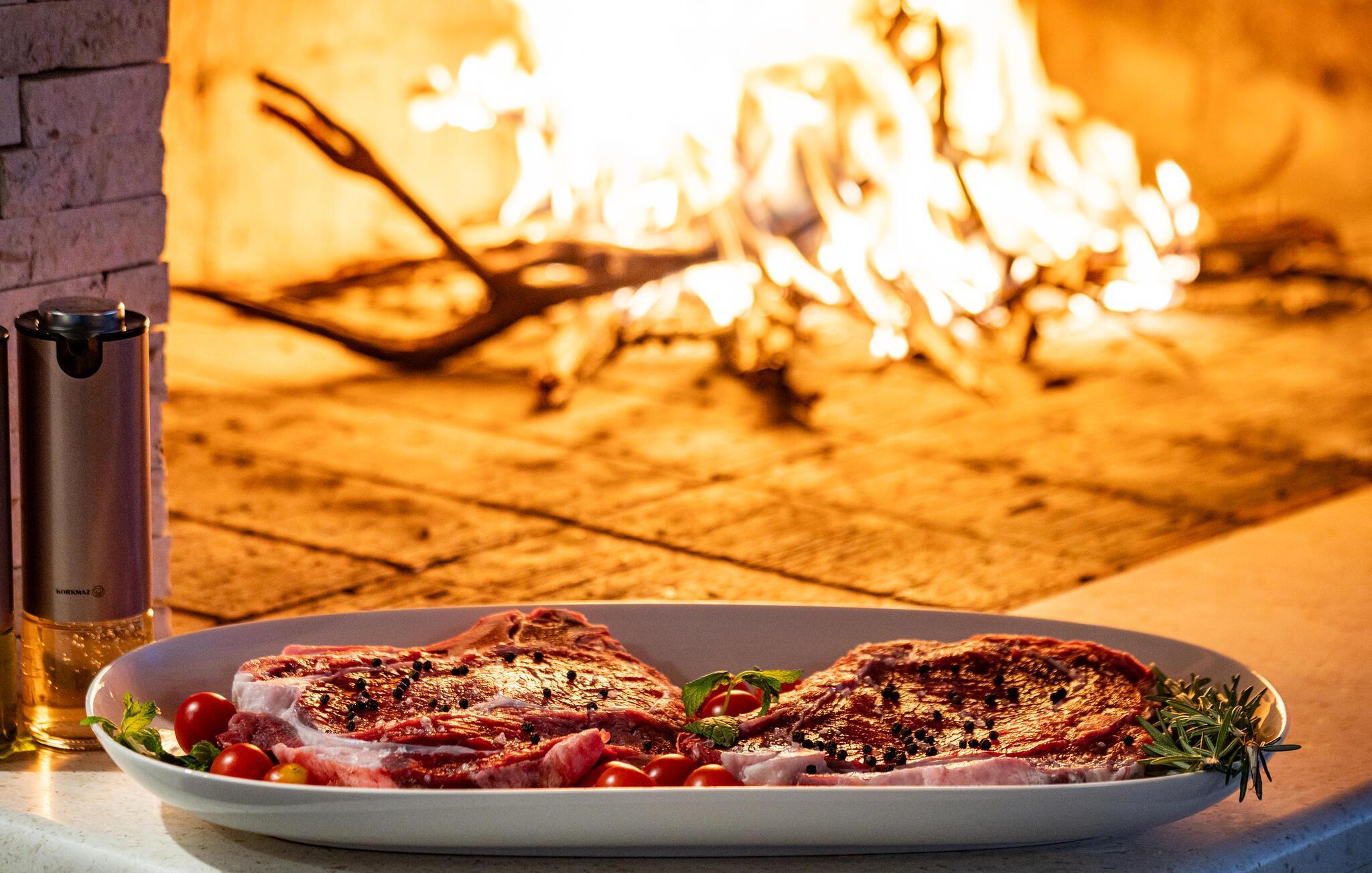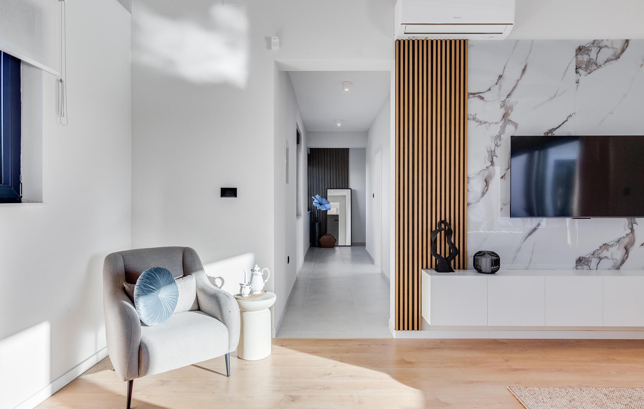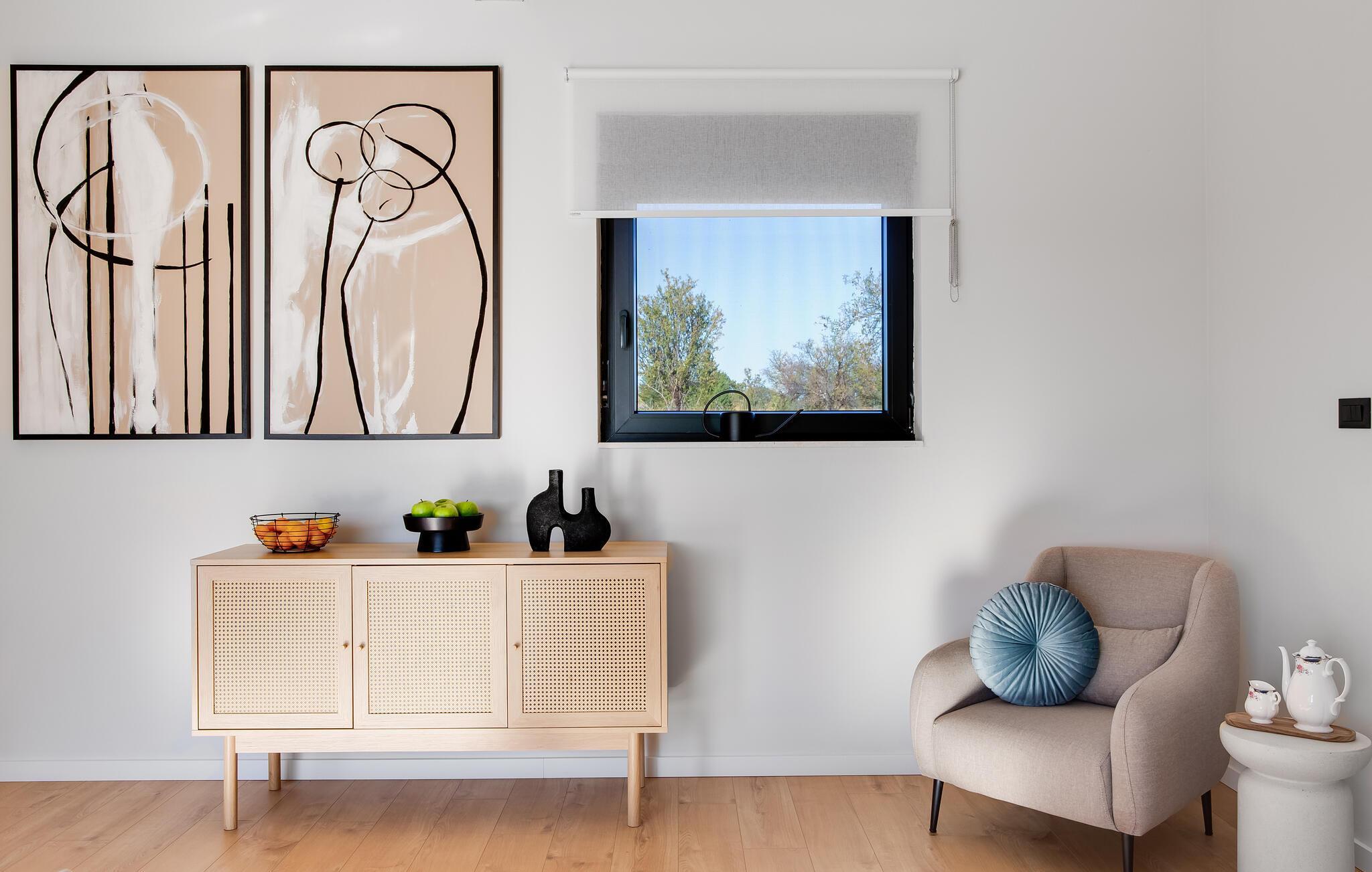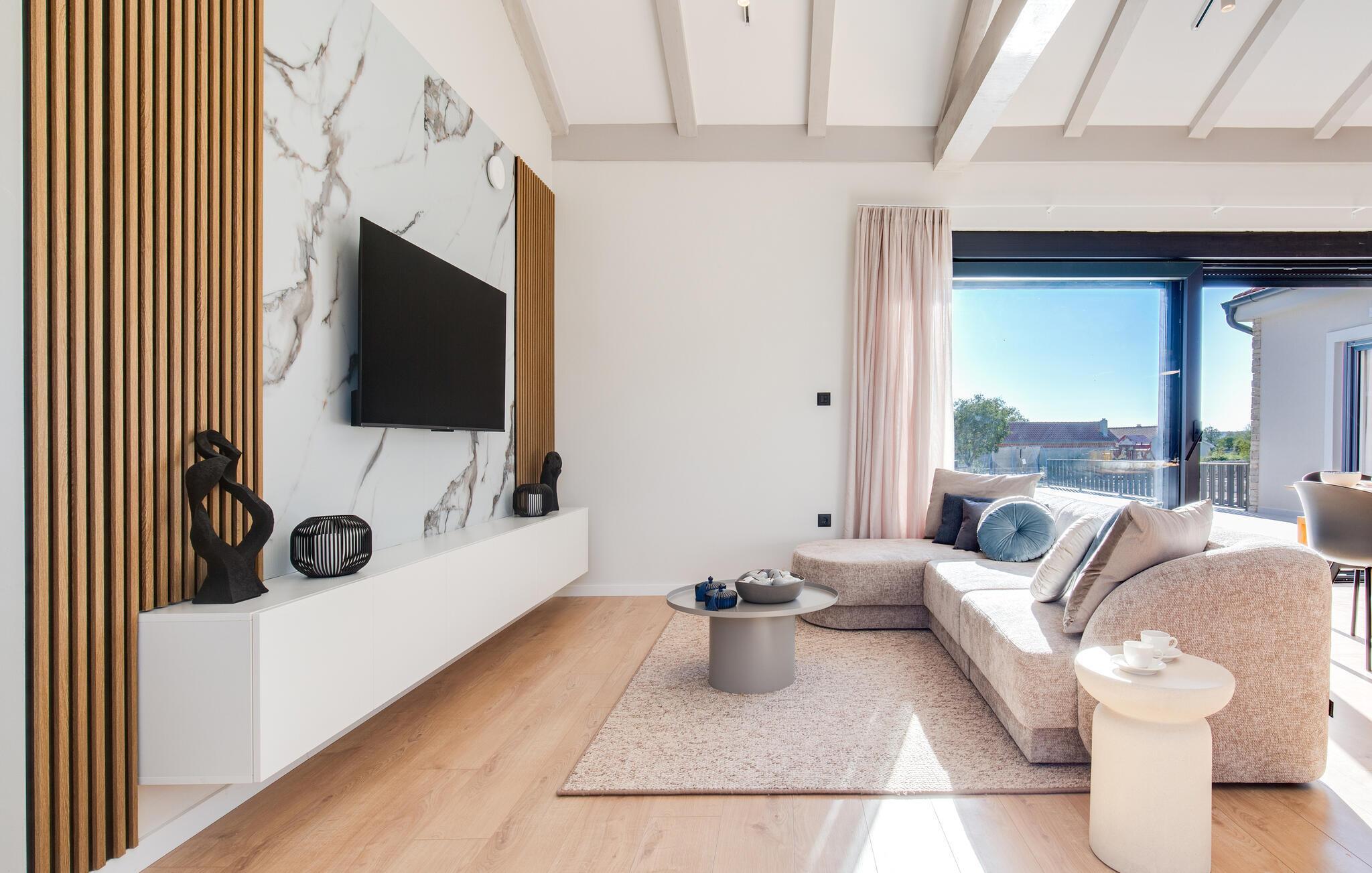 Der stilvolle Wohnbereich besticht durch eine geschmackvolle Einrichtung und großzügige Fensterfronten, die den Raum mit Tageslicht durchfluten. Abends sorgen der eindrucksvolle Designer-Kamin und die durchdachte Beleuchtung für ein ausgesprochen behagliches Ambiente. Gemütliche Sofas und eine harmonische Farbgestaltung garantieren, dass Sie sich vom ersten Urlaubstag an rundum wohlfühlen.