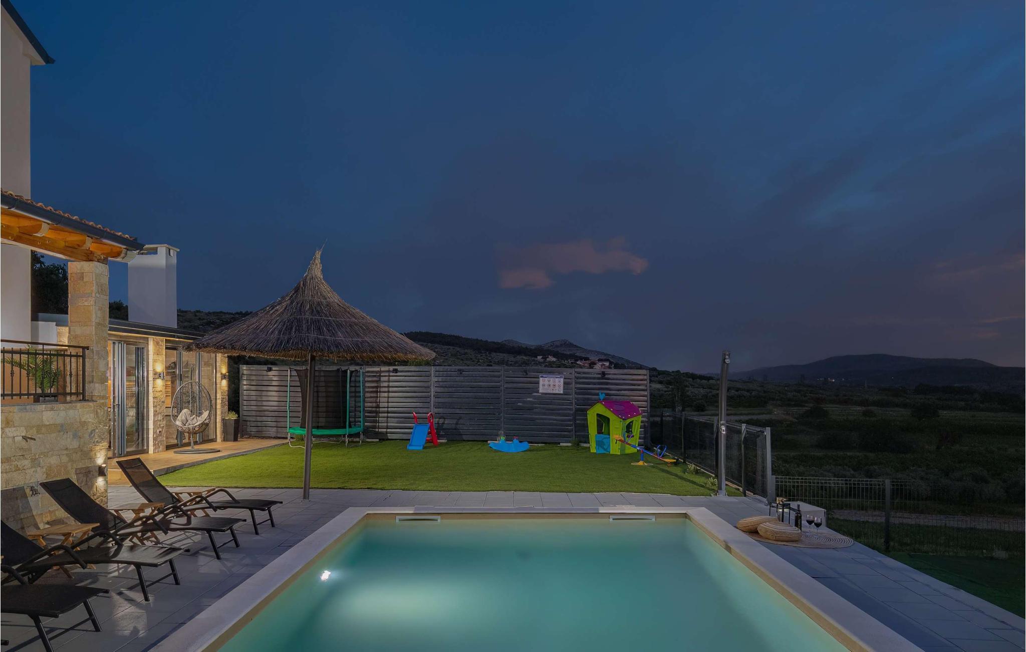 Draußen erwartet Sie ein beheizter Pool, umgeben von Sonnenliegen, der Sie Baden, Sonnen und Verweilen auffordert. Kommen Sie am Abend in der Sommerküche mit Grill zusammen, während die kleinen Gäste die Schaukeln, die Rutsche und das Klettergerüst erobern. Mehrere Terrassen bieten Ihnen schöne Plätze zum Ausruhen, Kaffeetrinken und Lesen. Dabei können Sie den weiten Ausblick genießen.