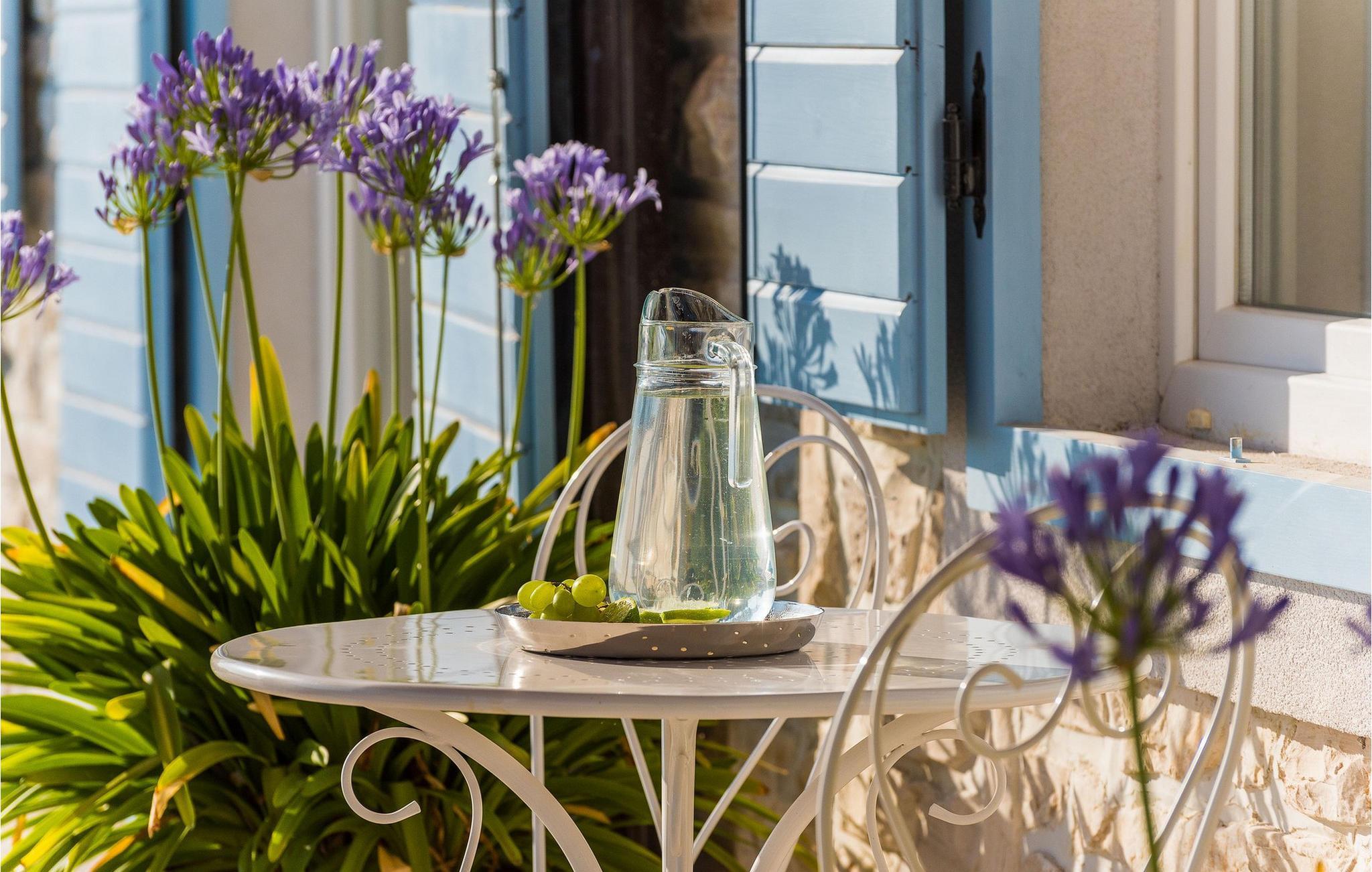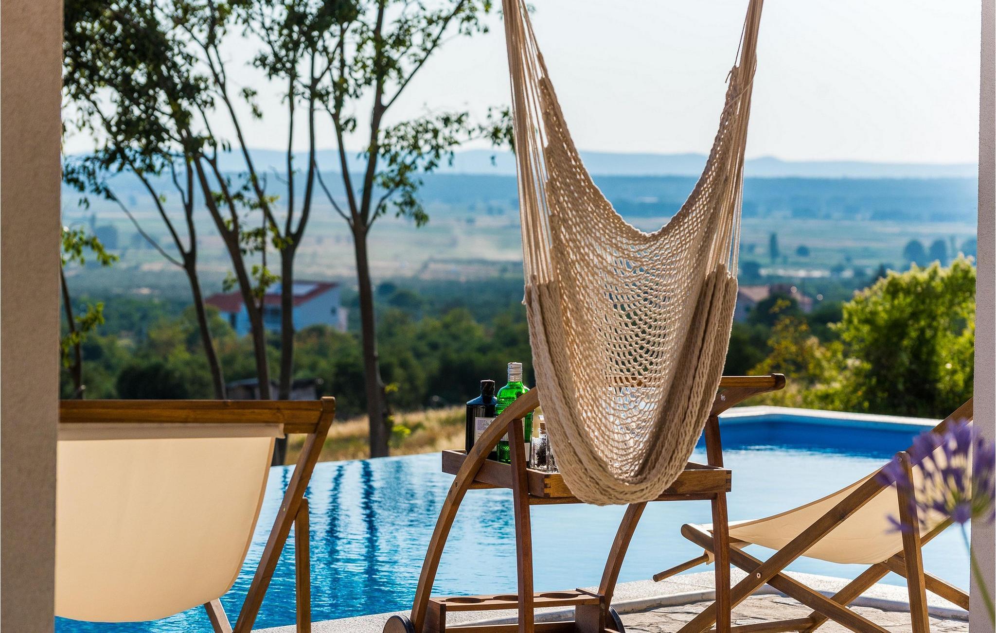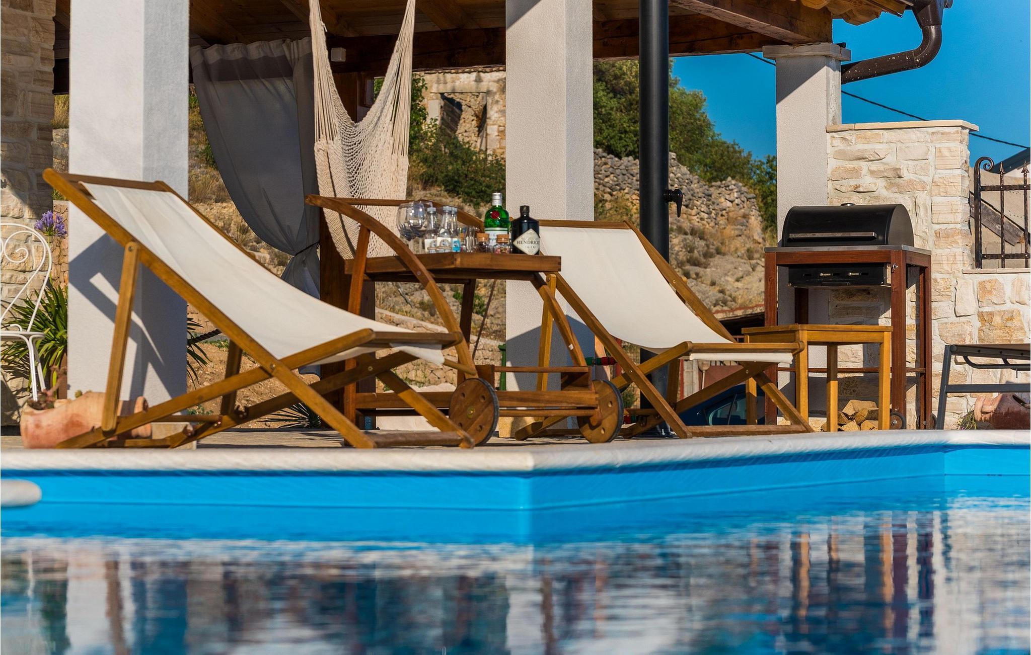 Genießen Sie den wunderschönen Blick über die sanfte Landschaft bis hin zum glitzernden Meer, während Sie am Pool entspannen. Erfrischen Sie sich mit einem Sprung ins kühle Wasser oder ruhen Sie sich auf einer der Sonnenliegen im Schatten der Terrasse aus. Lassen Sie den Tag gemütlich auf der überdachten Veranda ausklingen und beobachten Sie, wie die Abendsonne das Haus in goldenes Licht taucht.