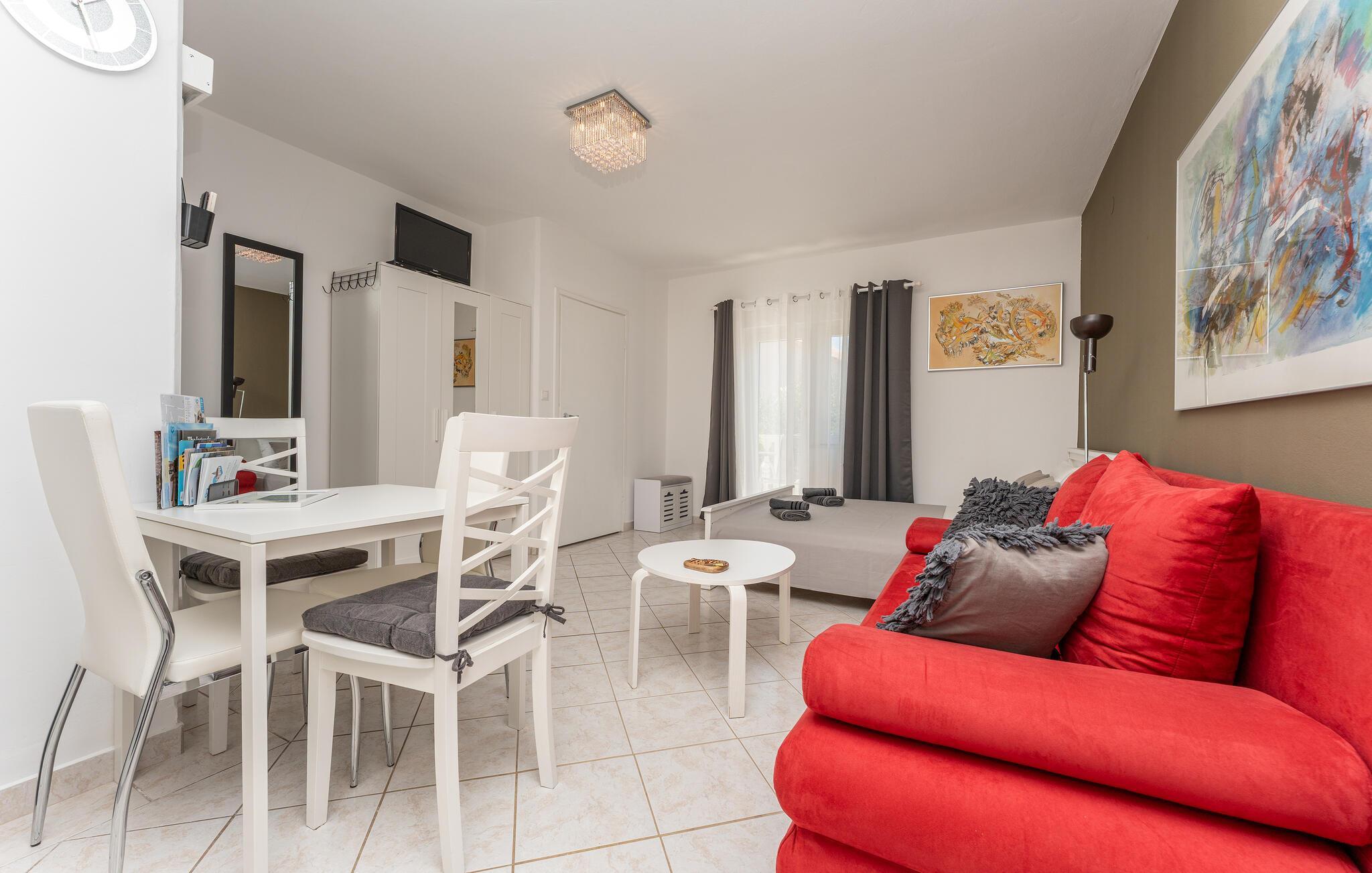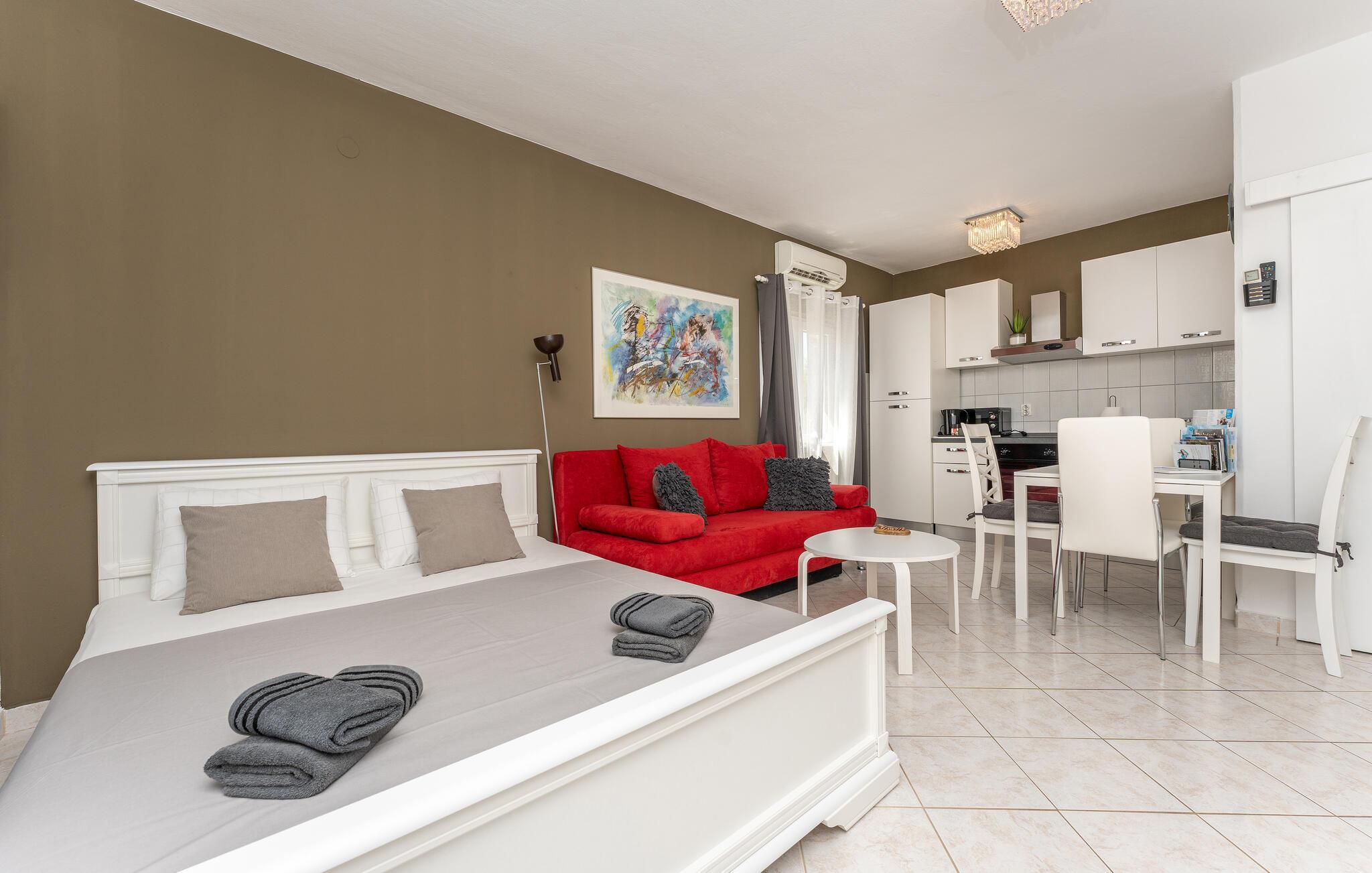 Lassen Sie den Alltag hinter sich und verbringen Sie einen erholsamen Urlaub zu zweit in der Wohnung, die Sie nur einen kurzen Spaziergang vom Meer entfernt empfängt. Nutzen Sie die Unterkunft mit schönen Farbakzenten als Ausgangspunkt für wunderbare Strandtage und Erkundungen der Insel, machen Sie es sich nach Ihren Unternehmungen hier gemeinsam bequem und lassen Sie auf dem Sofa die Erlebnisse des Tages Revue passieren.