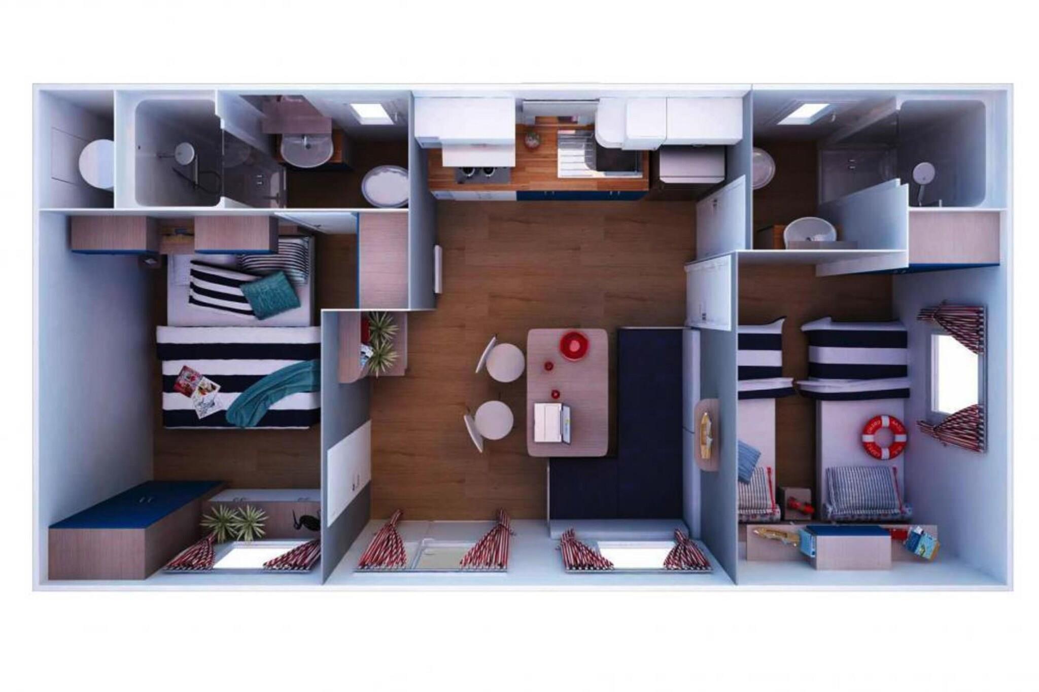 Parterre: (Wohnzimmer(Einzelunterschiebebett, TV(Satellit)), offene Küche(Esstisch, Kochplatte(4 Kochplatten, Gas), Kühl-/Gefrierkombination), Schlafzimmer(Doppelbett), Schlafzimmer(2x Einzelbett, Etagenbett), Badezimmer(Dusche, Toilette), Badezimmer(Dusche, Toilette), Klimaanlage, Terrasse, Gartenmöbel) Rezeption, Strand, Wassersport, Restaurant, Bar, Spielplatz, Trockner(gegen Gebühr), Waschmaschine(gegen Gebühr), Parkplatz