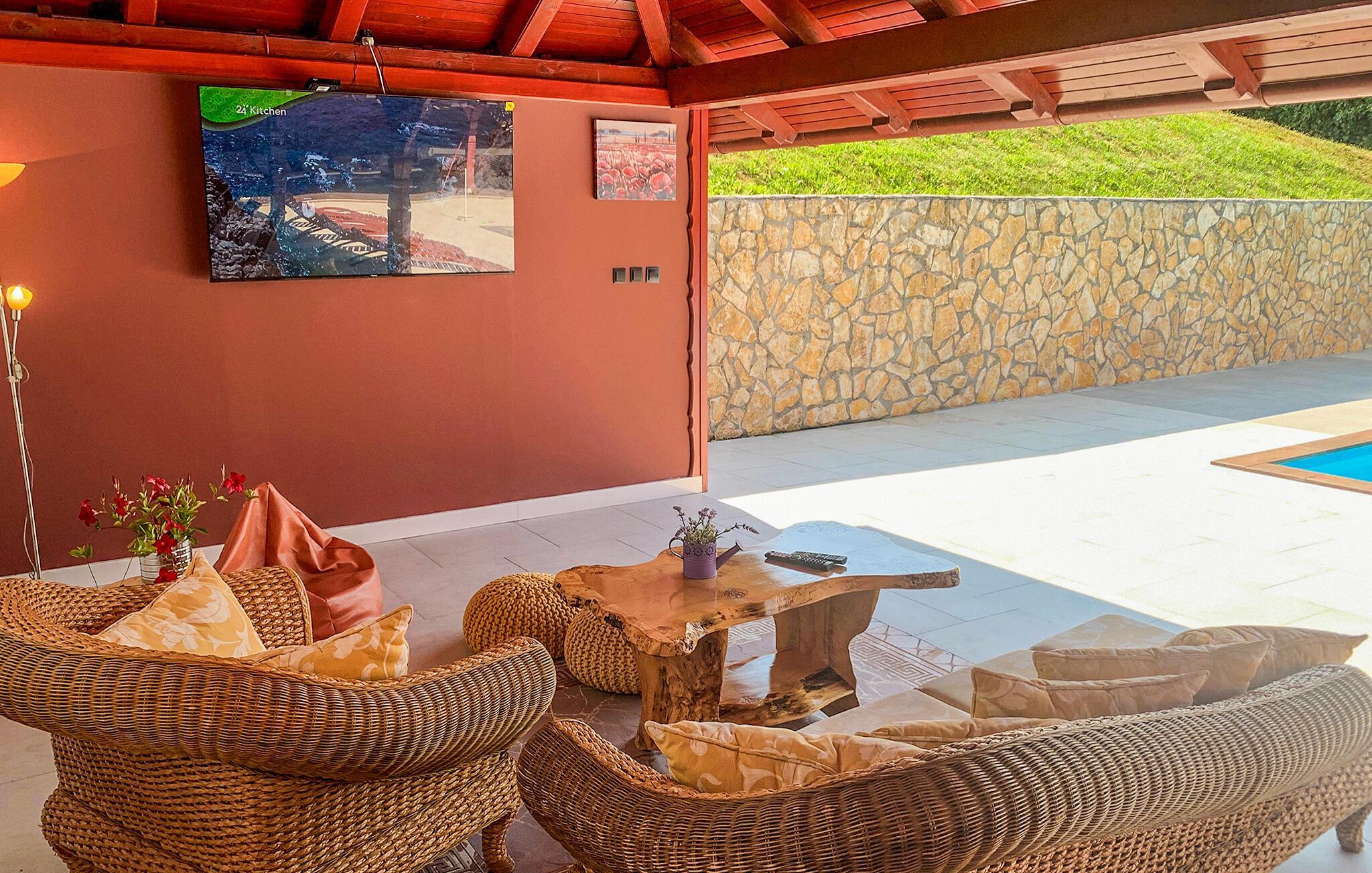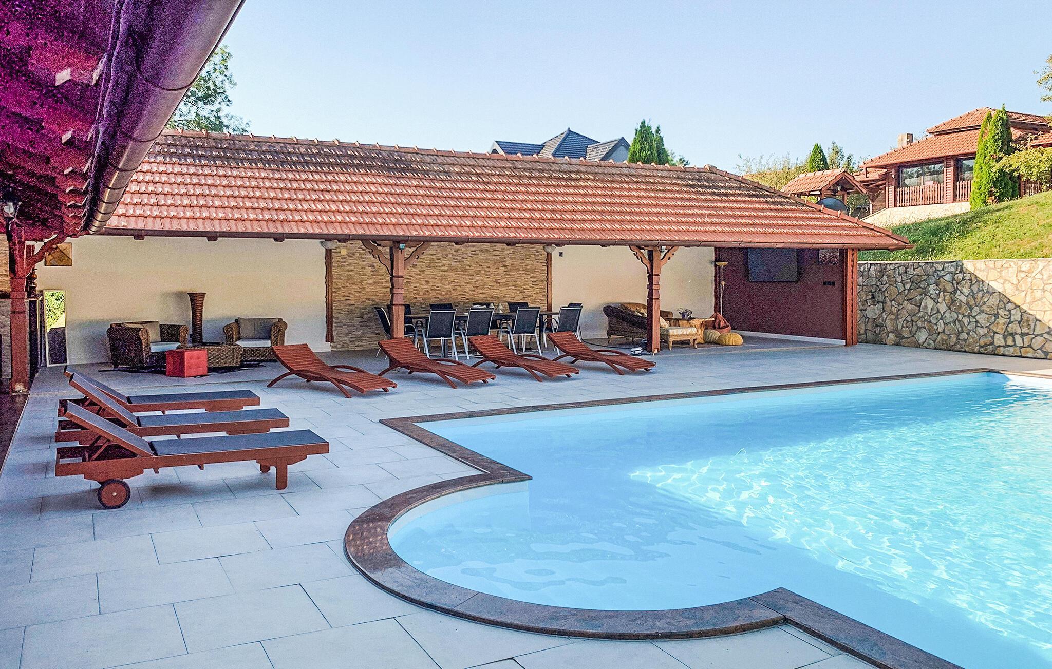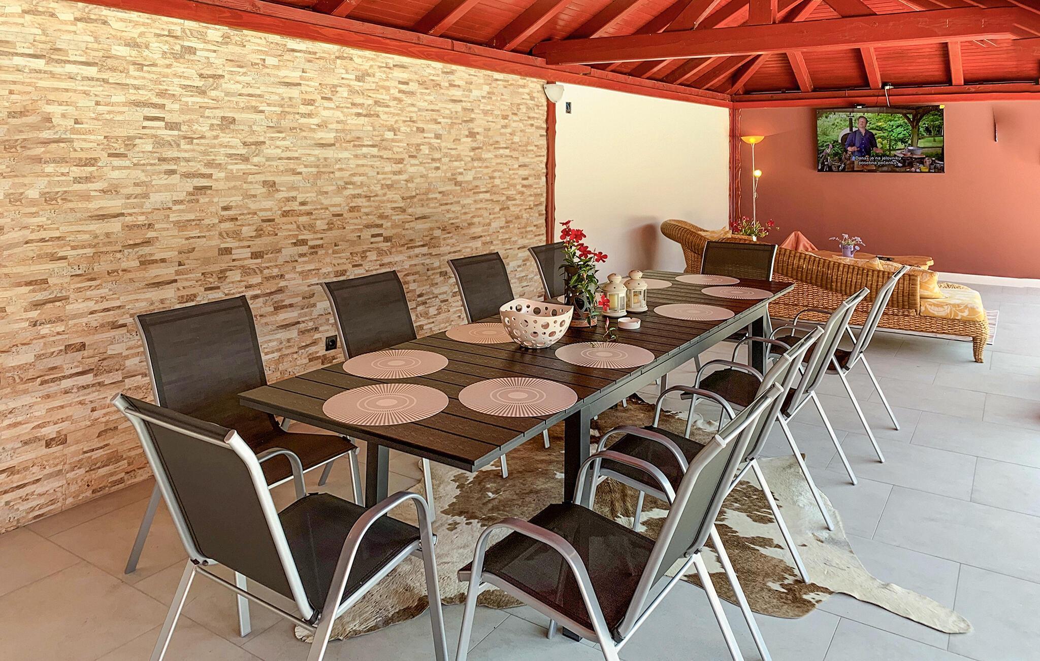 Im Inneren des Hauses erwartet Sie ein geschmackvoll gestalteter Wohnbereich mit rustikalem Charme und einer farbenfrohen Einrichtung. Die warme Holzausstattung und gemütlichen Sitzmöbel laden zu entspannten Abenden am Kamin ein. Beginnen Sie Ihren Tag im erfrischenden Pool. Genießen Sie anschließend ein entspanntes Frühstück auf der überdachten Terrasse, die genügend Platz für gesellige Mahlzeiten im Freien bietet. Lehnen Sie sich zurück in den komfortablen Loungemöbeln und genießen Sie die freie Urlaubszeit in vollen Zügen.