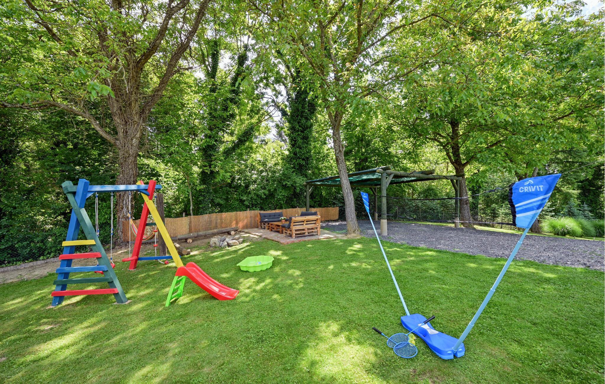 Das große, eingezäunte Grundstück lockt mit tollen Spielmöglichkeiten an die duftende Waldluft. Gönnen Sie sich wohlige Momente im Whirlpool, während andere Badminton spielen, auf der Schaukel die Seele baumeln lassen oder mit dem Hund über den weitläufigen Rasen toben. Versammeln Sie sich an der Feuerstelle oder erleben Sie stimmungsvolle Sommerabende bei einem Grillfest.