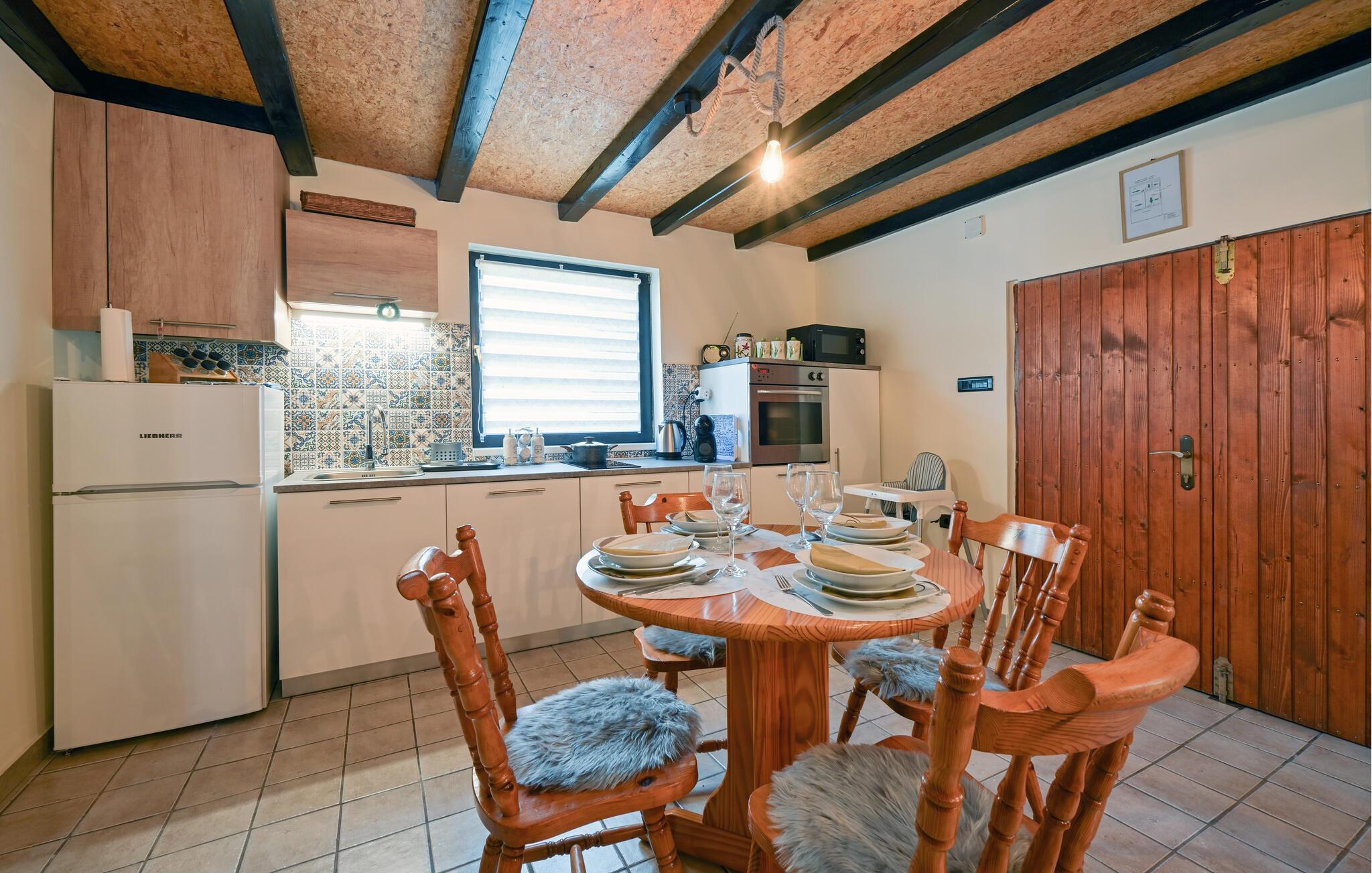 Dieses gemütliche Ferienhaus verwöhnt Sie mit reizvollen Annehmlichkeiten für einen erholsamen Urlaub. Freuen Sie sich auf fröhliche Mahlzeiten im behaglichen Wohnbereich und genießen Sie das kuschelige Ambiente bei harmonischen Spieleabenden oder bei einem spannenden Film, während der Kachelofen leise knistert.