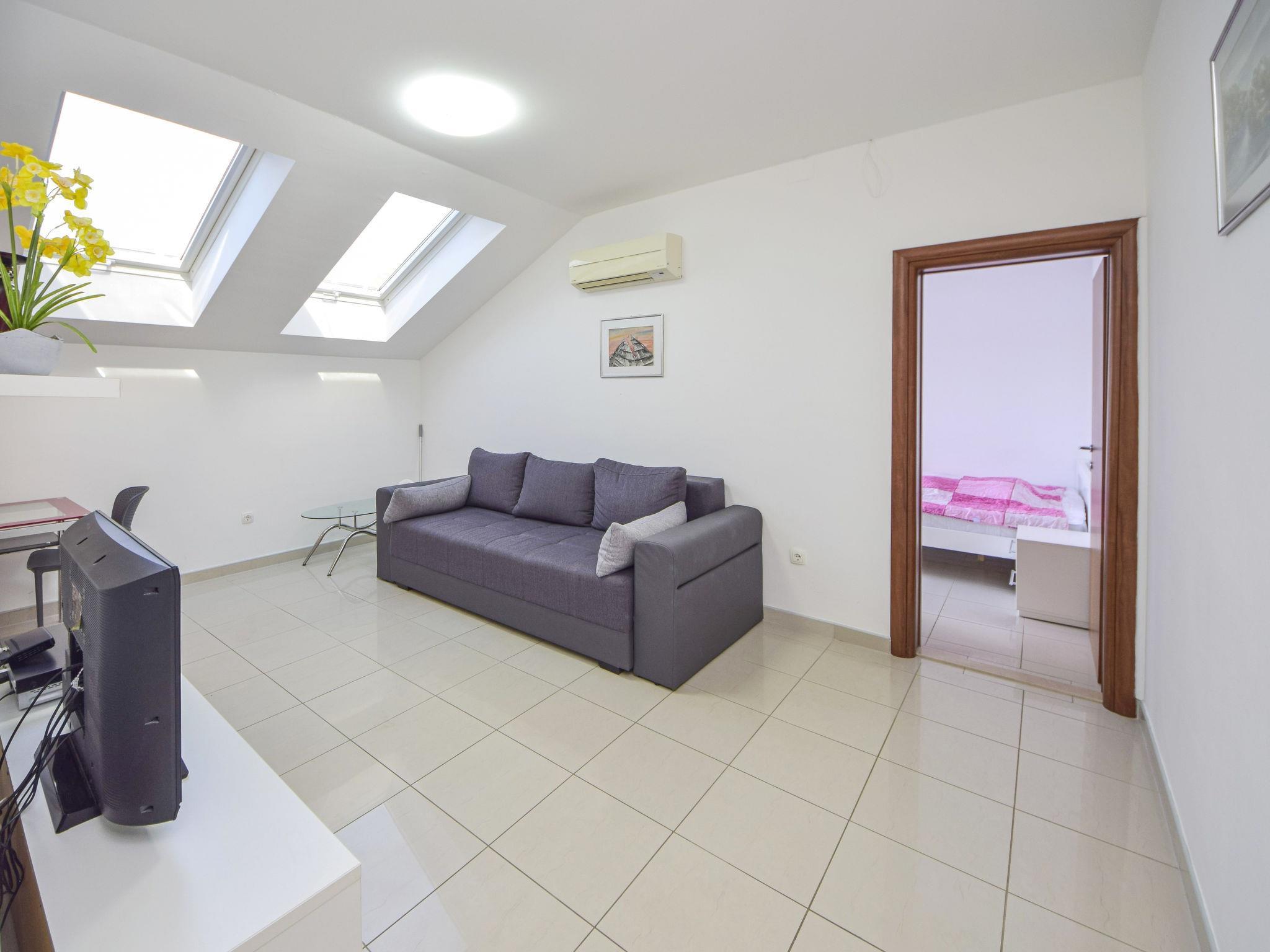 2-Zimmer-Wohnung 40 m2, im Dachgeschoss. Abgeschrägtes Wohn-/Esszimmer, Deckenhöhe 168 - 268 cm mit Dachfenster mit 1 Doppeldiwanbett (140 cm, Länge 200 cm), Sat-TV und Klimaanlage. 1 Zimmer mit 1 franz. Bett (160 cm, Länge 200 cm), Klimaanlage. Ausgang zum Balkon. Abgeschrägte, offene Küche (Backofen, 4 Glaskeramikplatten, Wasserkocher, Mikrowelle, Tiefkühler, elektrische Kaffeemaschine) mit Esstisch, Deckenhöhe 170 - 268 cm. Dusche/WC. Balkon 12 m2. Balkonmöbel, Liegestühle (12). Herrliche Panoramasicht auf das Meer. Zur Verfügung: Fliegengitter. Internet (Wireless LAN, gratis). Maximal 1 kleines Haustier/Hund erlaubt.