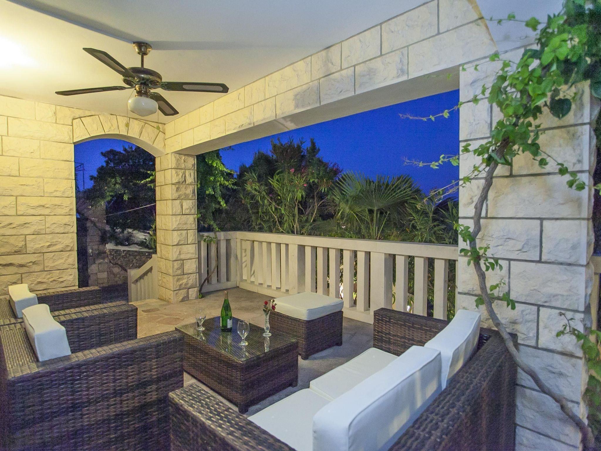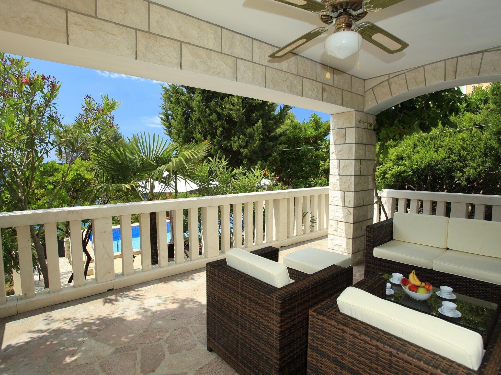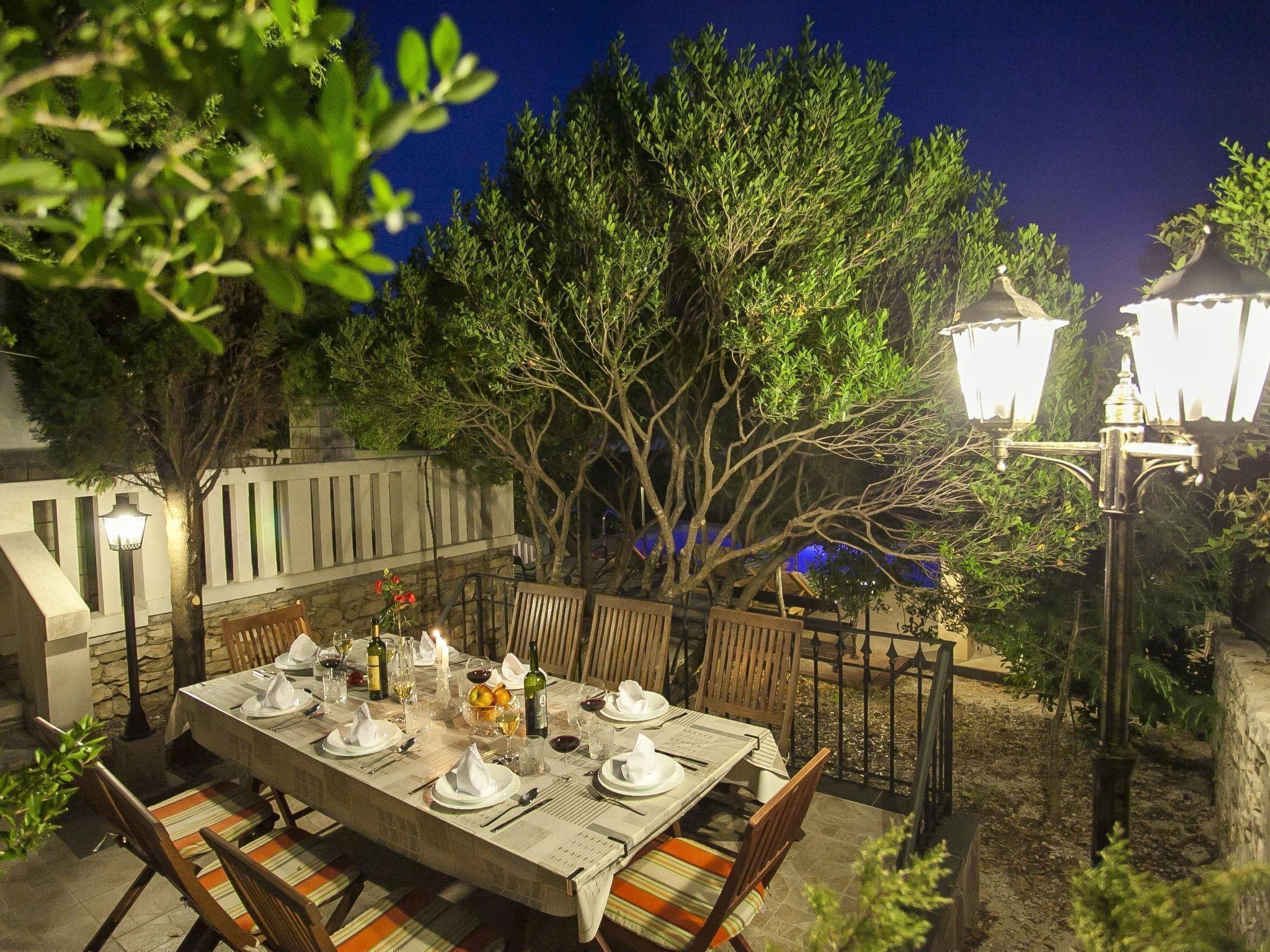 Bei diesem Haus handelt es sich um eine Steinvilla, gebaut im dalmatinischen Still, umgeben von einem Park mit typischen mediterranen Gewächsen, durch den ein Privatweg zum Strand führt. Die Villa besteht aus Erdgeschoss und erster Etage. Im Erdgeschoss sind Küche, Esszimmer mit Kamin, zwei Schlafzimmer und ein Badezimmer. Im ersten Stockwerk befinden sich die Aperitifbar mit Billardtisch, zwei Schlafzimmer mit Holzfußböden, ein Badezimmer und der Balkon. Die Etage wird über eine Außentreppe erreicht. Alle Zimmer verfügen über Klimaanlage. Zwei der vier Zimmer sind mit einem französischen Bett (150 x 195 cm) und die beiden anderen Zimmer mit je zwei Einzelbetten ( 90 x 195 cm) ausgestattet. Vom Haus gelangen Sie auf die große, teilweise überdachte Terrasse mit ihren gemütlichen Lounge Möbeln. Entspannen Sie am Pool und nutzen Sie zur Zubereitung der Mahlzeiten auch ruhig einmal den Außengrill. Es sind genügend Liegestühle vorhanden. Außerdem gibt es ein kleine Laube, die Schutz vor der Sonne spendet.