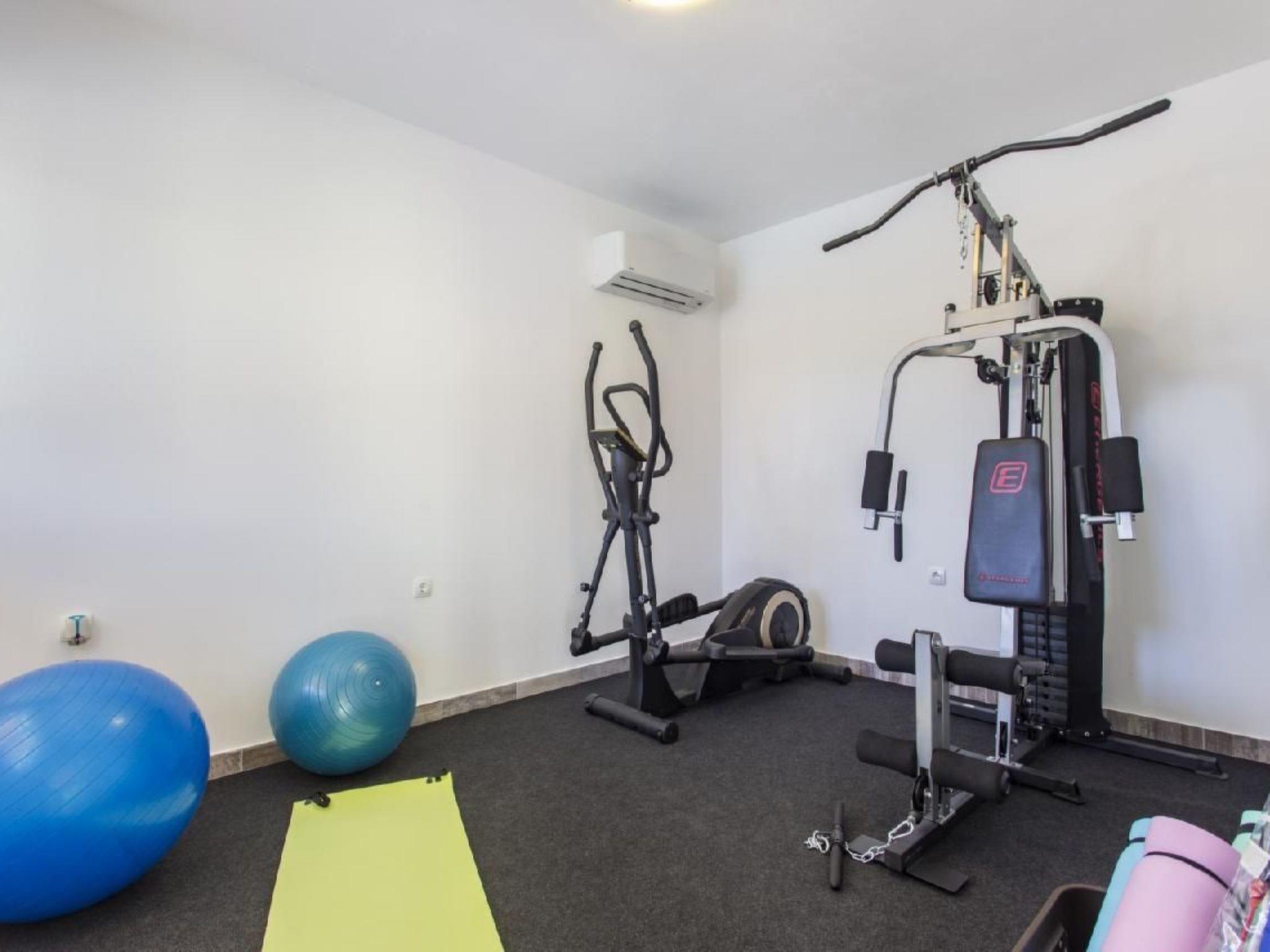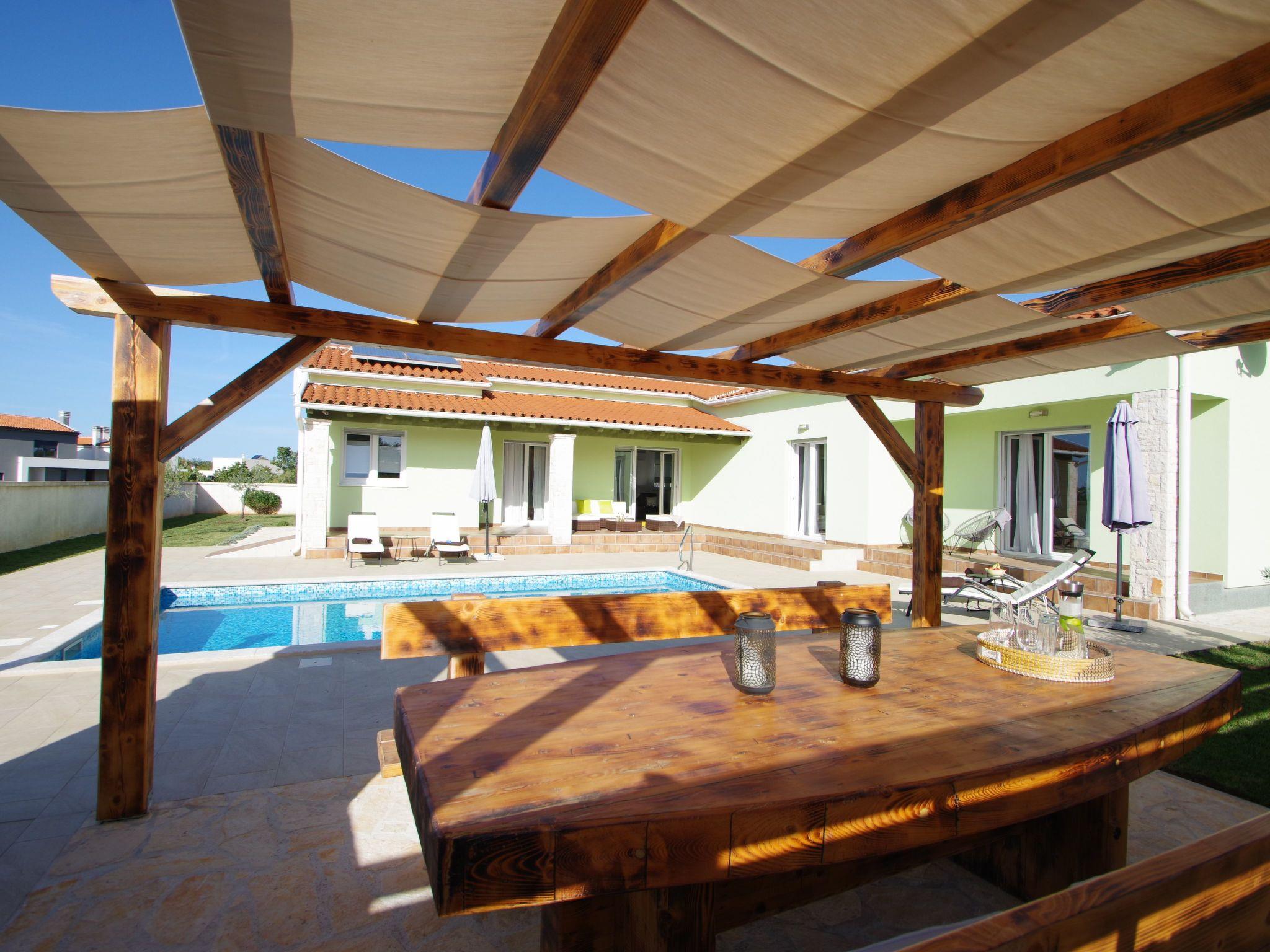 Das Äußere der Villa Laganini ist ebenso beeindruckend wie ihr Inneres. Inmitten eines 800 m² großen, eingezäunten Gartens gelegen, garantiert die Villa Privatsphäre und eine ruhige Atmosphäre. Das Highlight ist der 30 m² große, beheizte Salzwasserpool, der zum Entspannen und Erholen einlädt. Die Gäste können sich auf den vier Sonnenliegen sonnen, unter den Sonnenschirmen Schatten suchen oder die Außendusche nutzen. Für gesellige Abende und leckeres Essen gibt es einen Grillplatz. Das Kindertrampolin sorgt für Spaß bei den jüngeren Gästen und macht die Villa zu einem attraktiven Ort für Familien.