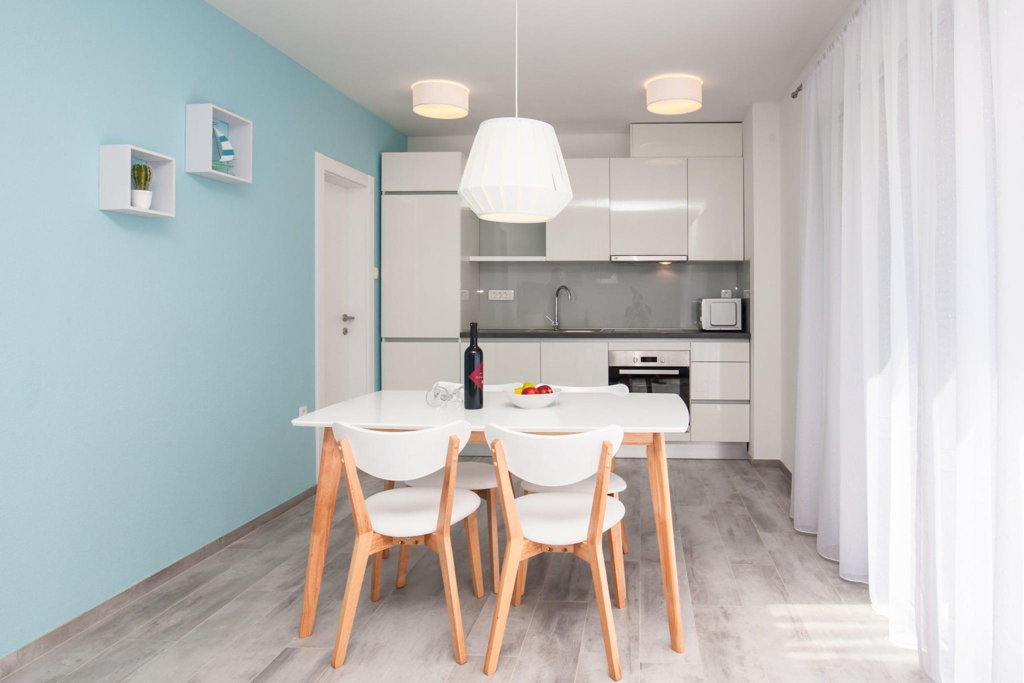 Apartments Dva Galeba are situated in Bol, a town on island of Brac, off the coast of Split. Its seafront promenade leads to the long Zlatni Rat beach. The property offer you 12 accommodation units. All units feature, free WiFi, air conditioning, Cable LCD TV, open space living room, equipped kitchen and private bathroom. Additional toilet is also available in each apartment. Some of the apartments have a furnished terrace with outdoor furniture and sunbeds. Baby cot is available. This lovely one bedroom apartment with furnished terrace is perfectly fit for up to five people. It features free WiFi, air conditioning and LCD TV. The open space living room comes with sofa and sitting area and it is combined with the equipped kitchen and dining area. The apartment has a private bathroom with shower and hair dryer. Additional toilet is also provided. Washing machine, iron and ironing facilities are at your disposal. Due to the properties excellent location, everything you may need for a pleasant stay is in a proximate distance. The nearest restaurant can be reached in 150 m range, while the nearest cafe bar is approx. 500 n away from the property, with many more of them in the surrounding area. The grocery store and beach can be reached in 350 m range. The pharmacy is 1 km away from the property. The bus stop is 700 m away, while Brac Airport is 14 km away from the property.
