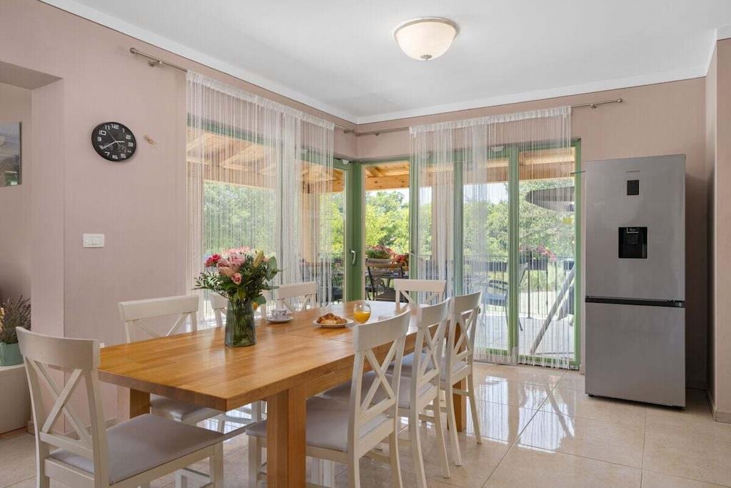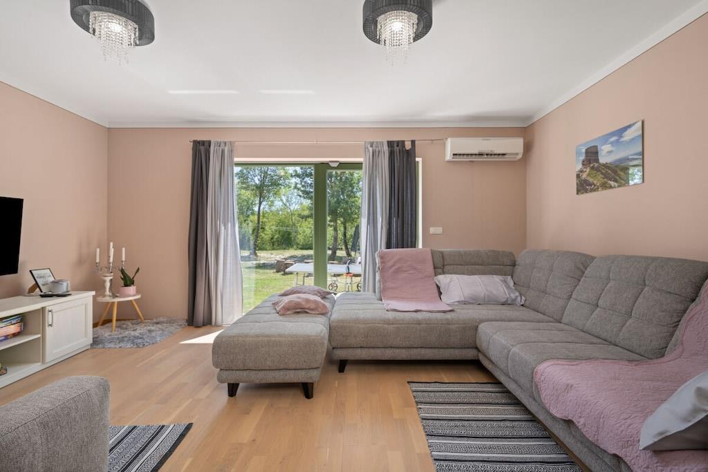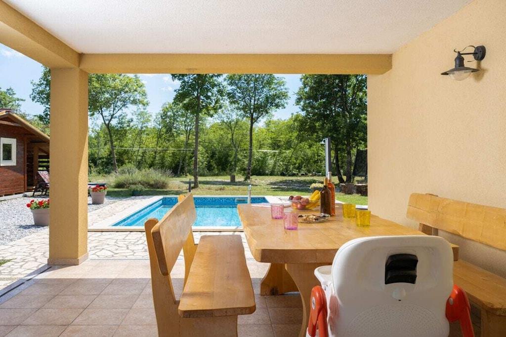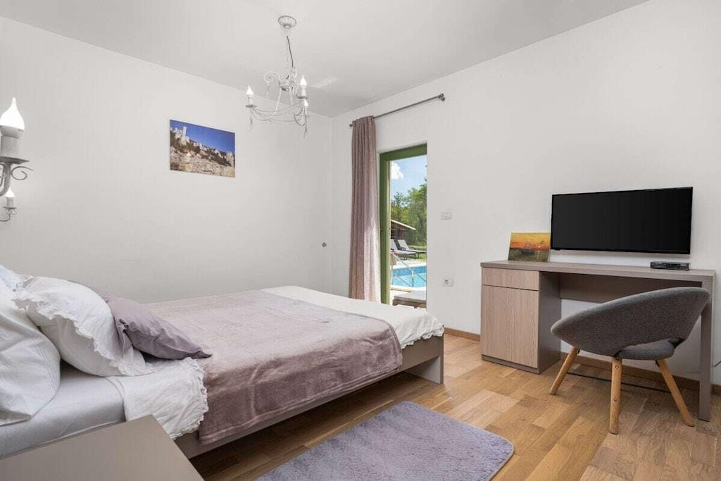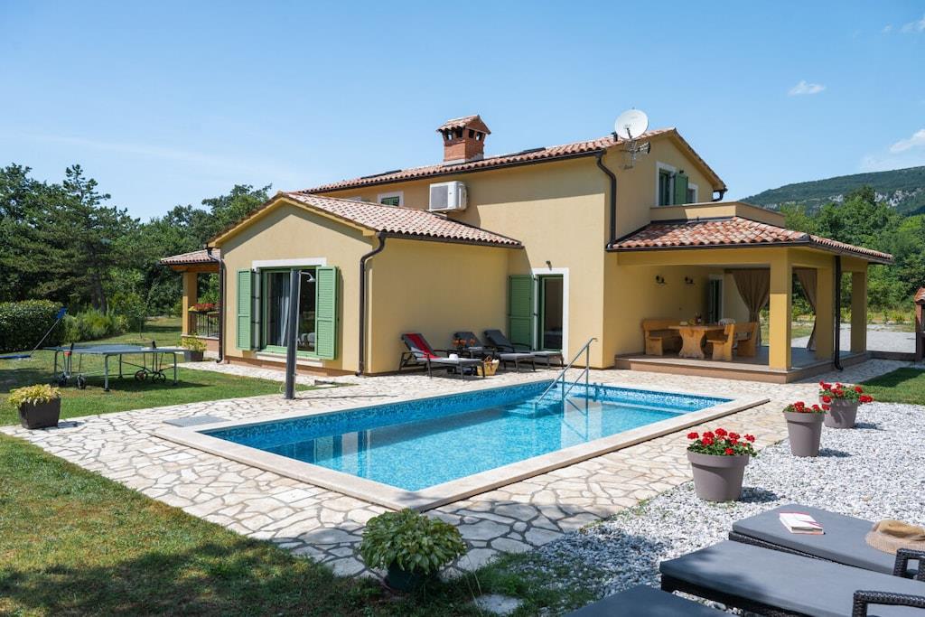 Dies ist neu gebaut - schöne Istrian Villa mit privatem Pool für 6-8 Personen. Fertiggestellt im August 2016. Ideal für Familie oder Freunde. Es befindet sich in einem Teil des großen privaten Eigentums von 40000 m² in Eingang des Naturparks Ucka. Villa ist voll klimatisiert. Freuen Sie sich auf kostenfreies WLAN und Privatparkplätze am Haus. Handtücher und Bettwäsche werden in dieser Unterkunft zur Selbstverpflegung angeboten. Es gibt 3 Schlafzimmer, 2 Bäder und 1 Toilette, voll ausgestattete Küche, ein großes Wohnzimmer und Esszimmer-verbunden mit der Terrasse und dem Poolbereich. Großer Garten mit Trampolin, Kinderspielplatz und Fahrrädern und Spielzeug zur Verfügung.