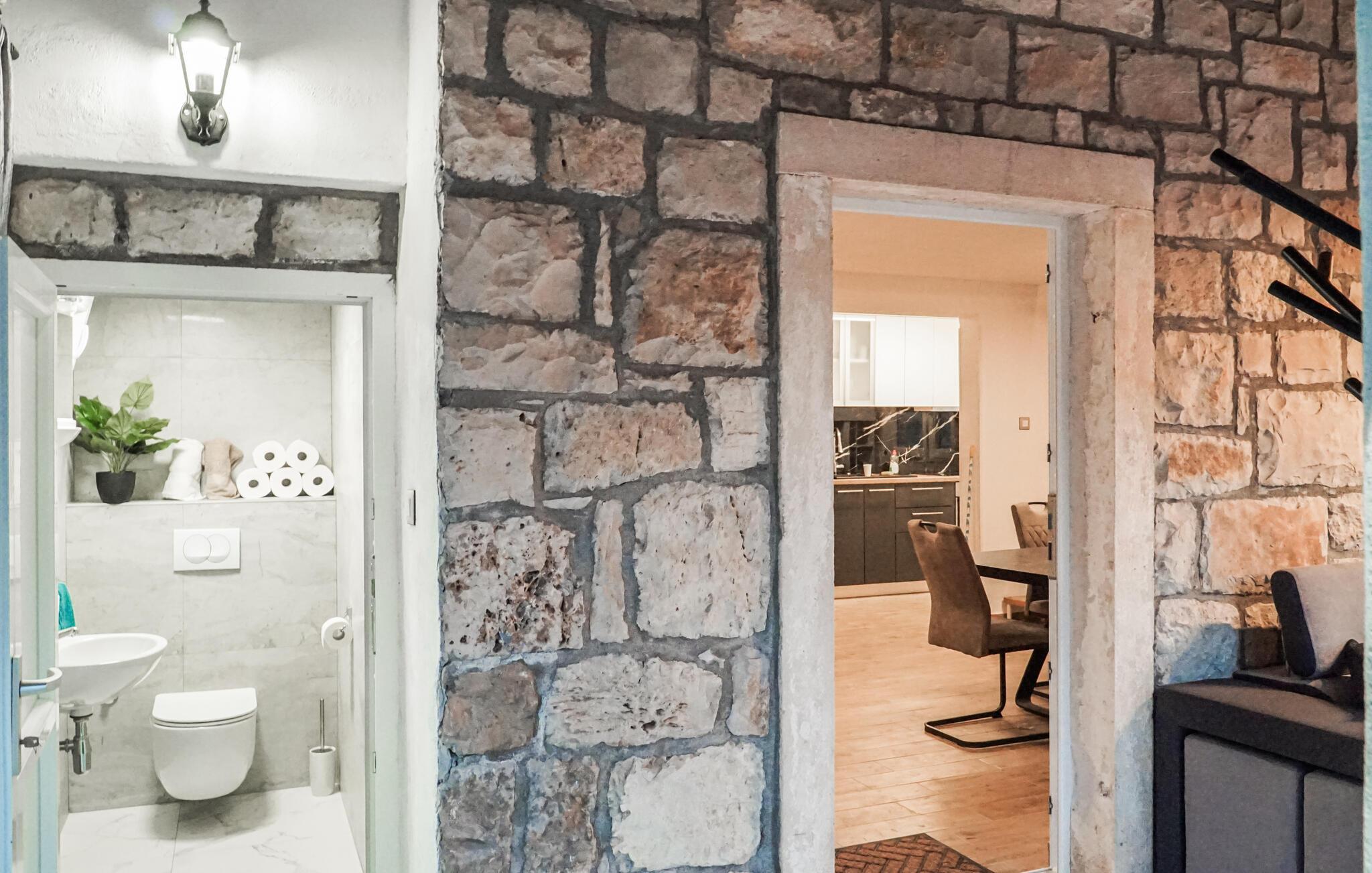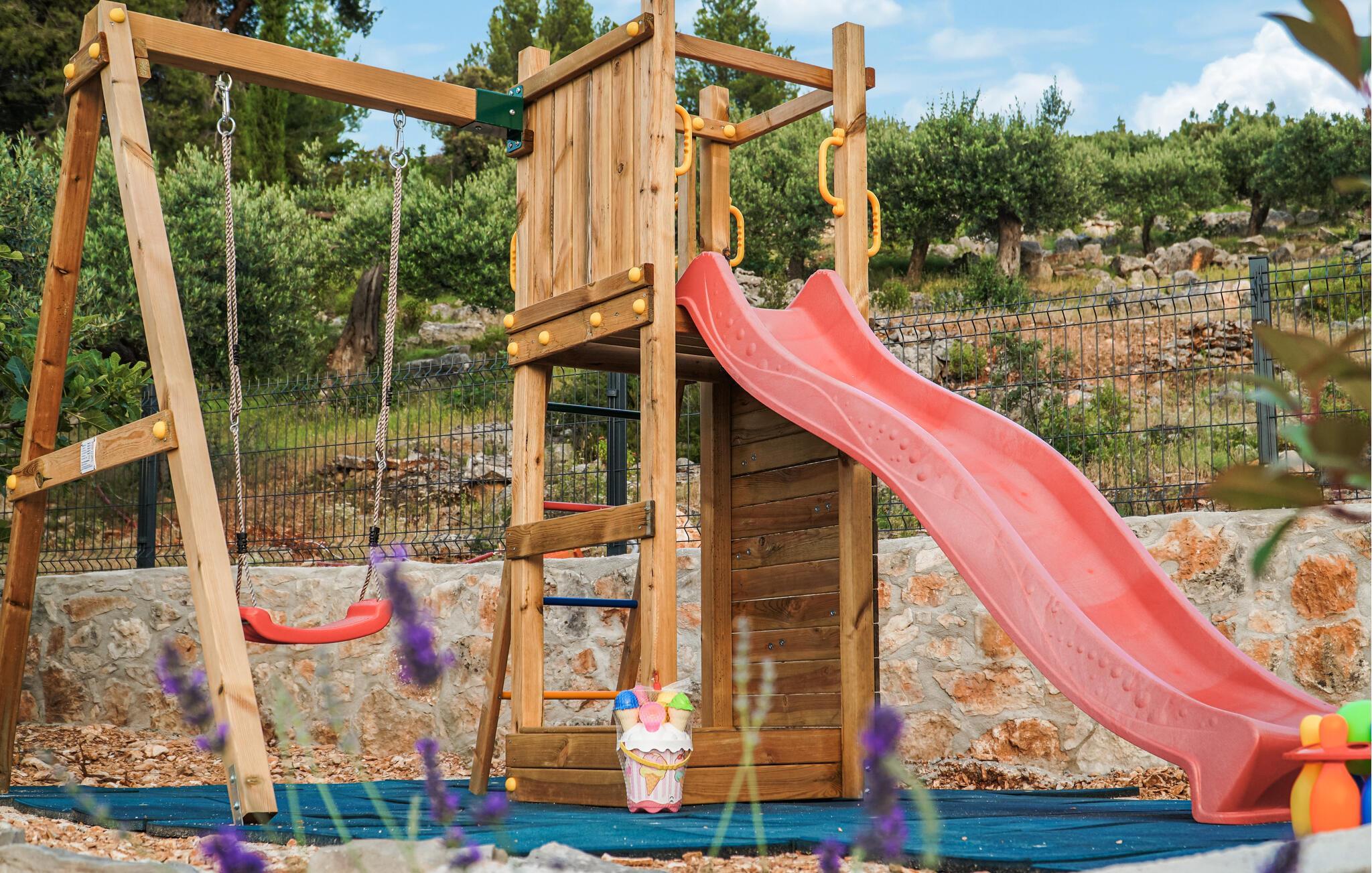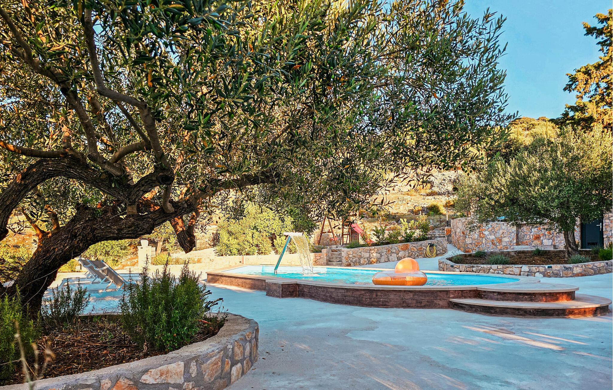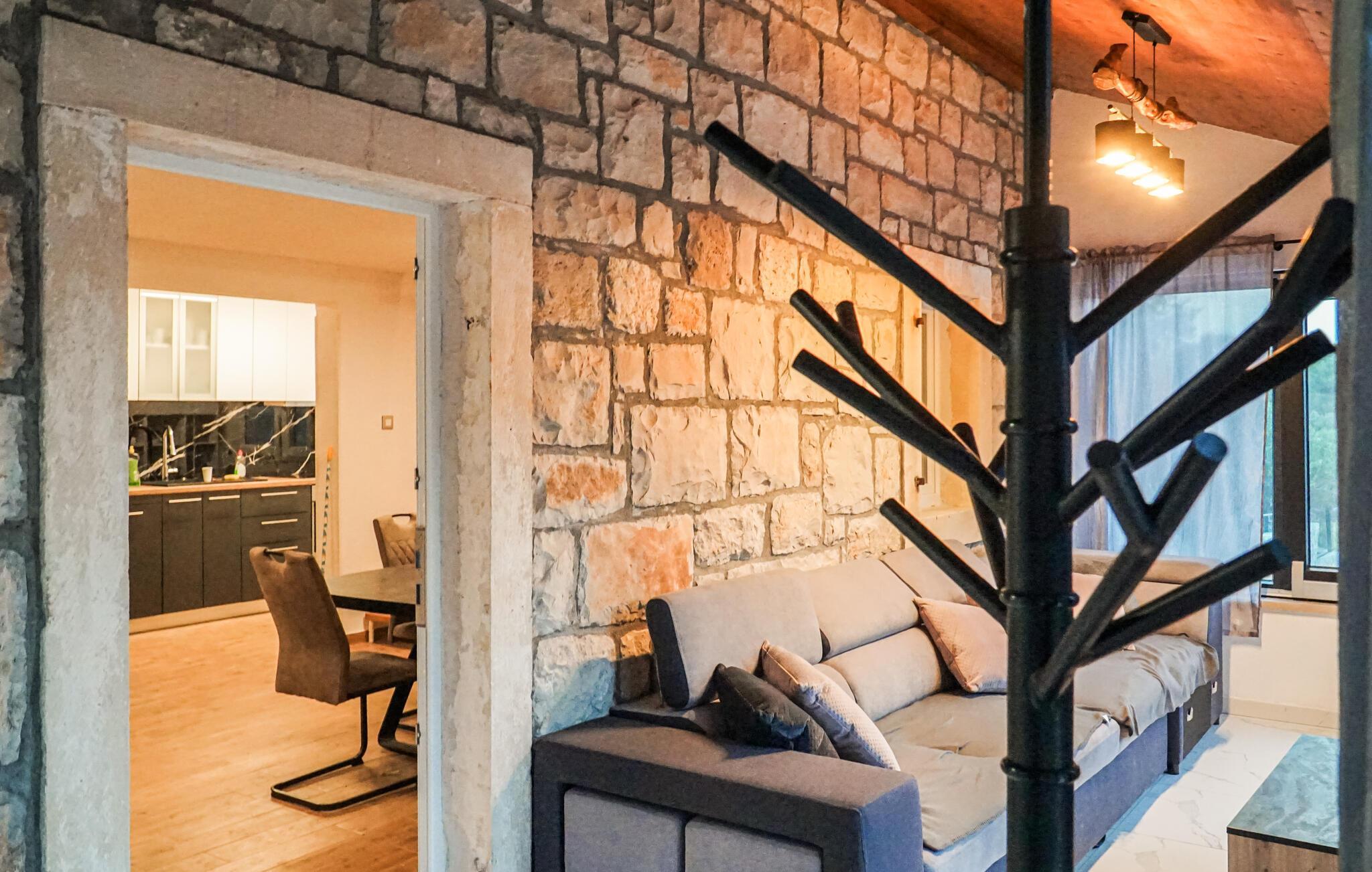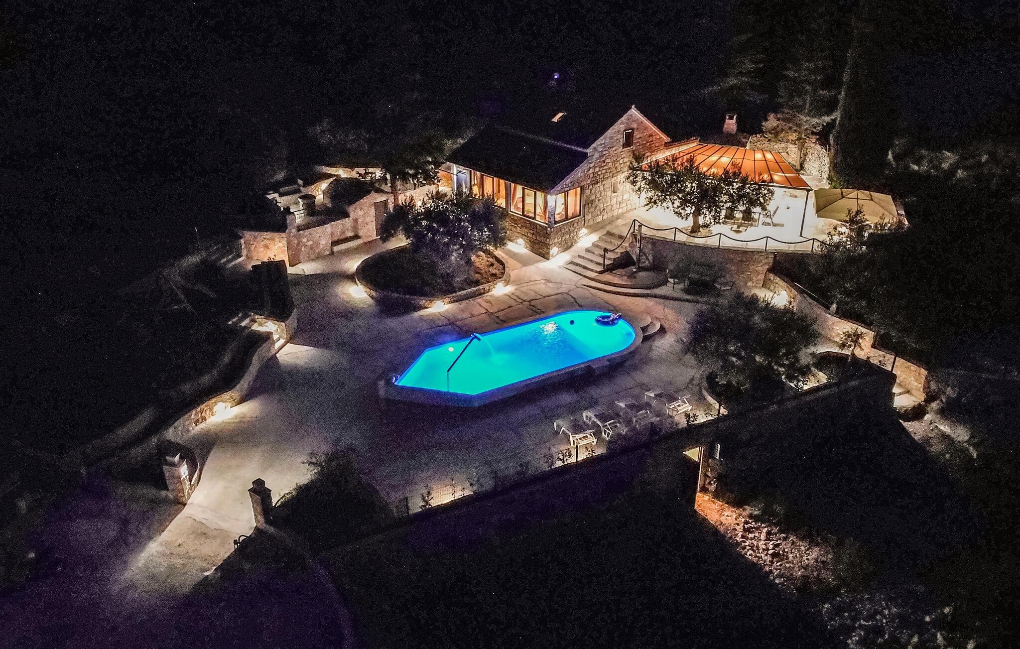Ihr Ferienhaus in Postira, idyllisch zwischen Bäumen und mit einem herrlichen Blick auf die Adria gelegen, bietet Ihnen Ruhe und Erholung. Genießen Sie den Tag am großzügigen Pool, der mit einer erfrischenden Wasserfontäne ausgestattet ist, während die Kinder sich auch auf dem Spielplatz vergnügen können. Machen Sie es sich in den gemütlichen Hängesesseln bequem und lassen Sie die Seele baumeln. Das stilvolle Wohnzimmer, mit großen Panoramafenstern, bietet Ihnen einen traumhaften Ausblick auf das Meer und den Pool. Entspannen Sie sich auf dem Sofa und genießen Sie die friedliche Atmosphäre. Die Natursteinwände und die moderne Einrichtung schaffen eine harmonische Mischung aus traditionellem Charme und modernem Komfort.